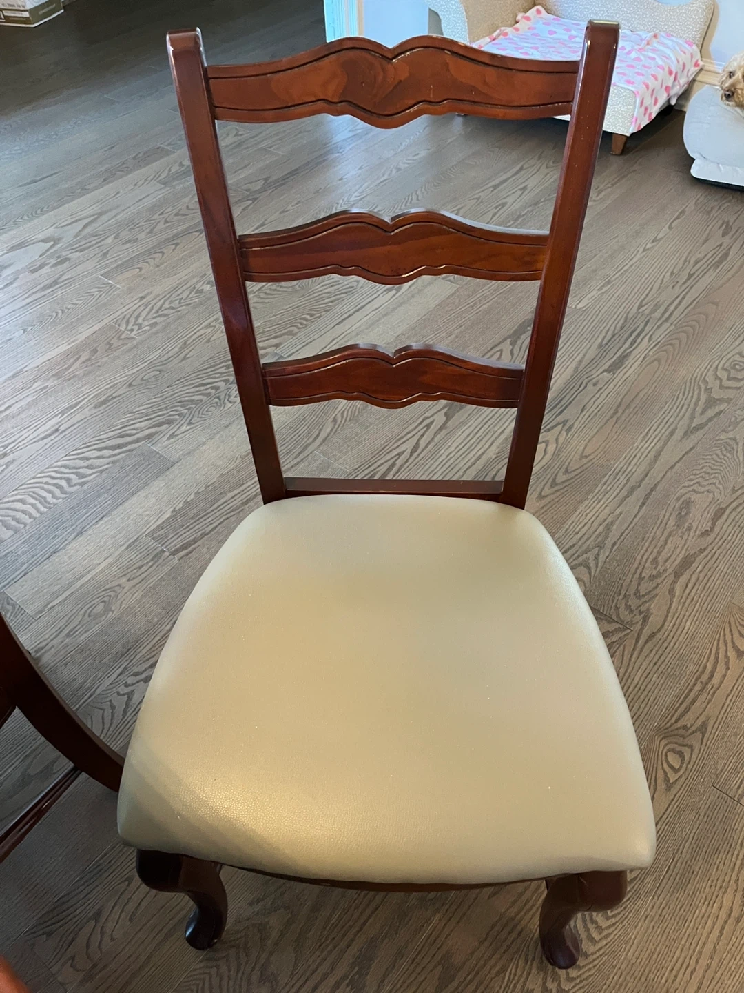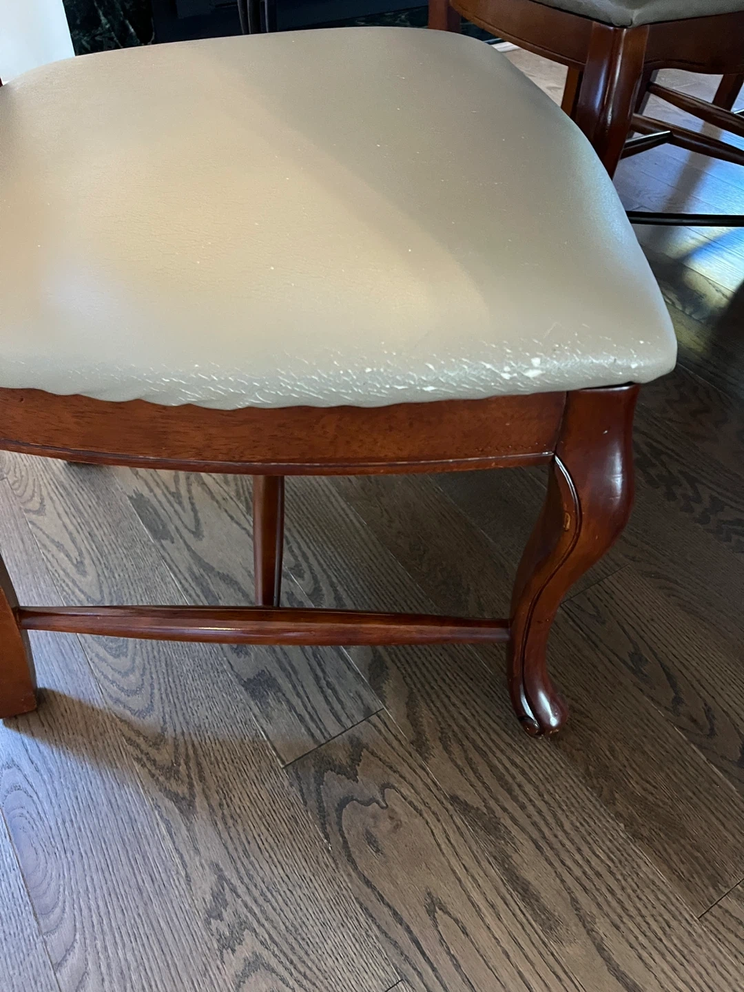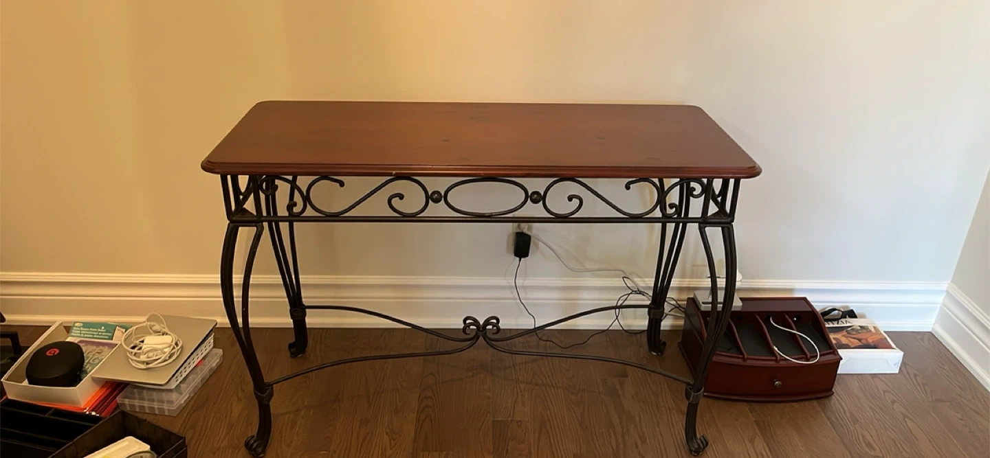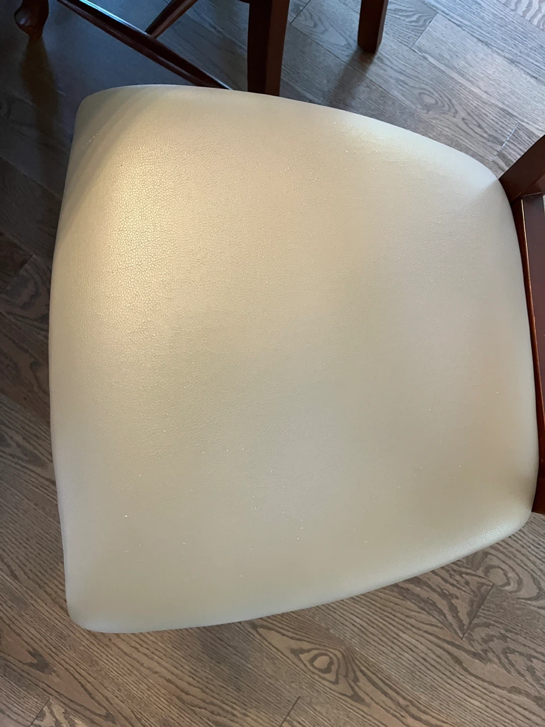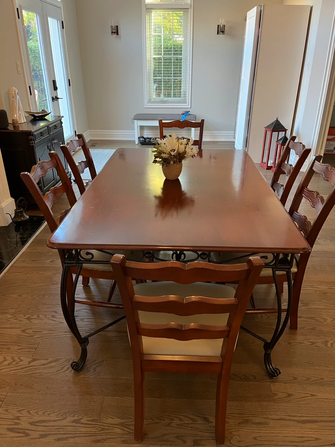 Selling a Bombay wrought iron dining table with six chairs. The table is a dark wood colour with wrought iron detailing. The chairs are also dark wood with cream coloured seats. The set is in good condition and would be a great addition to any dining room. Only chair showing wear and tear.