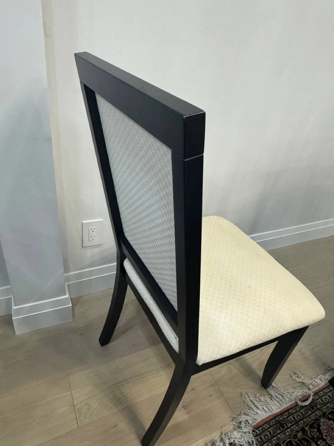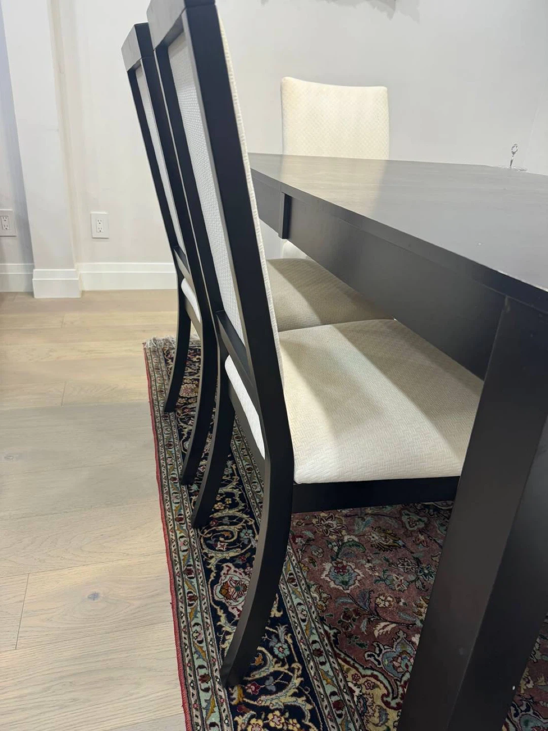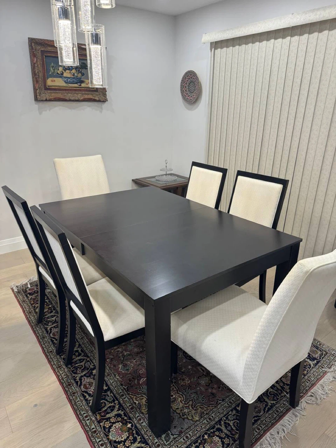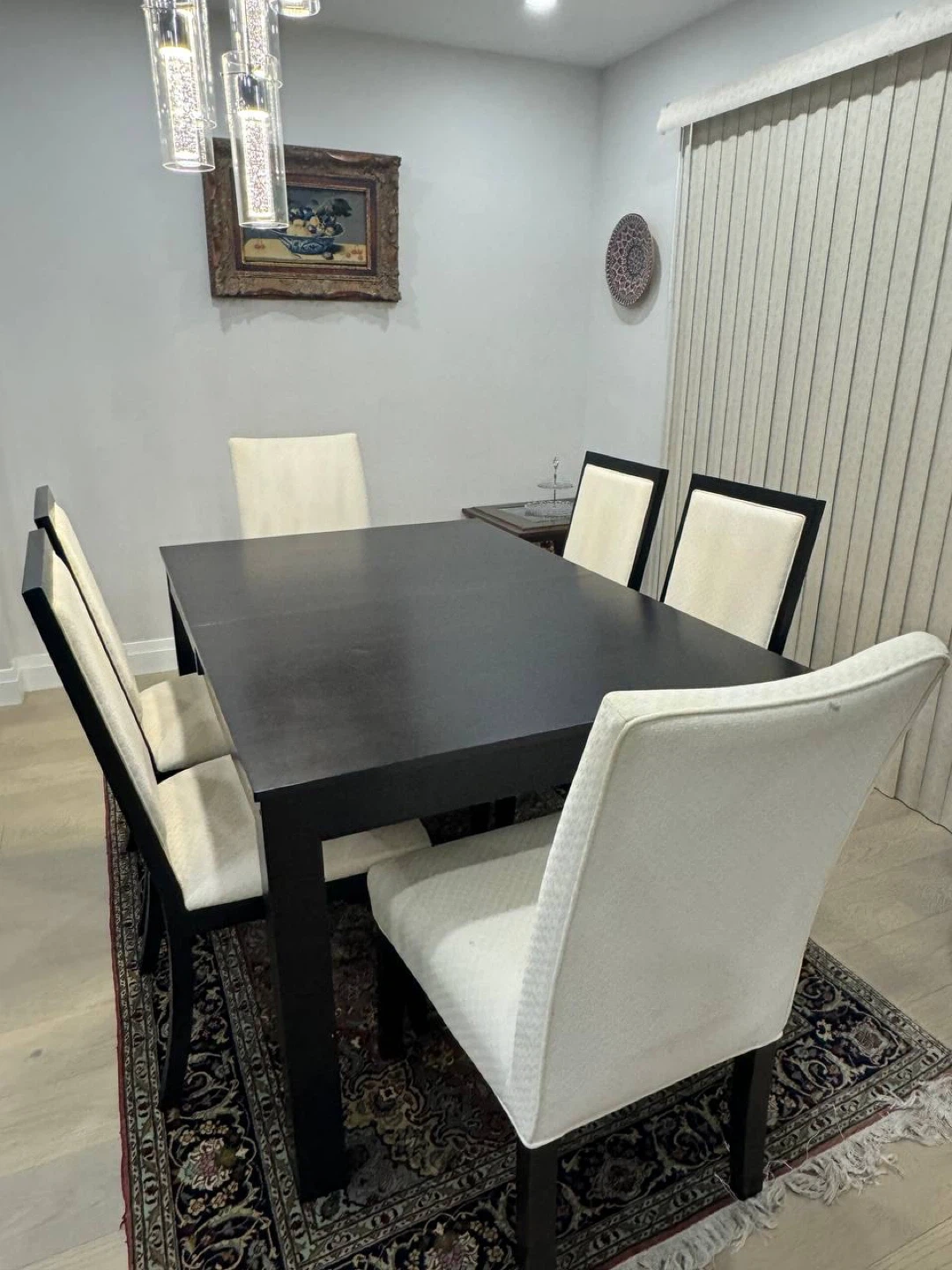 Selling a dining table with six chairs. The table is black, and the chairs are cream-coloured with black frames. It's a great set for family meals or entertaining guests. The table has some signs of use, but it's still in good condition and ready for a new home