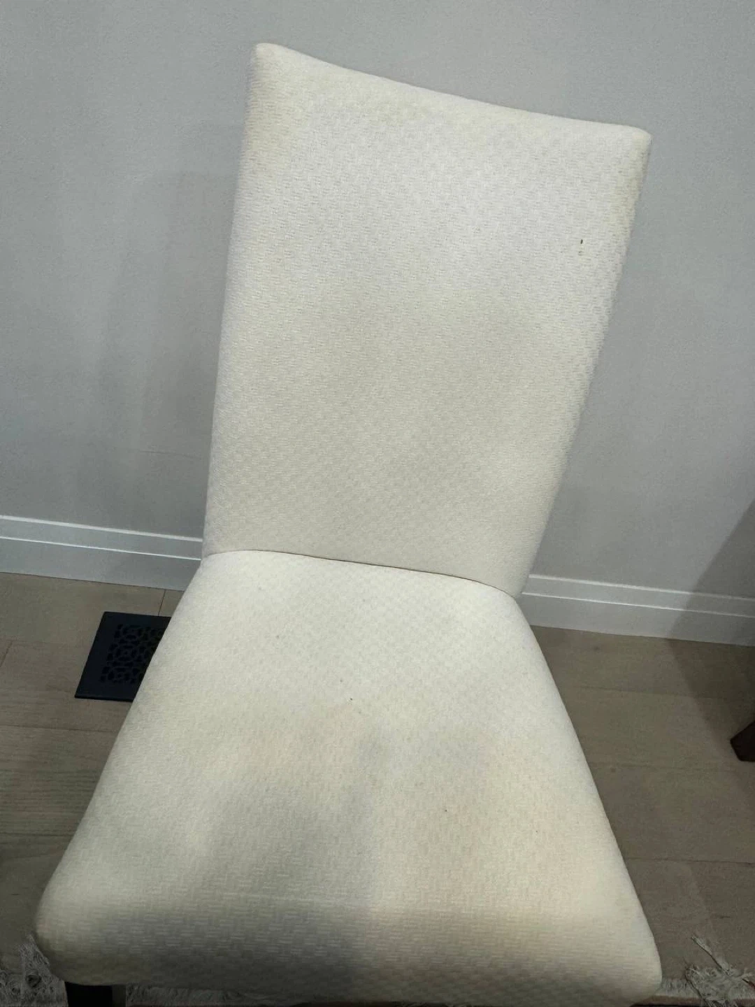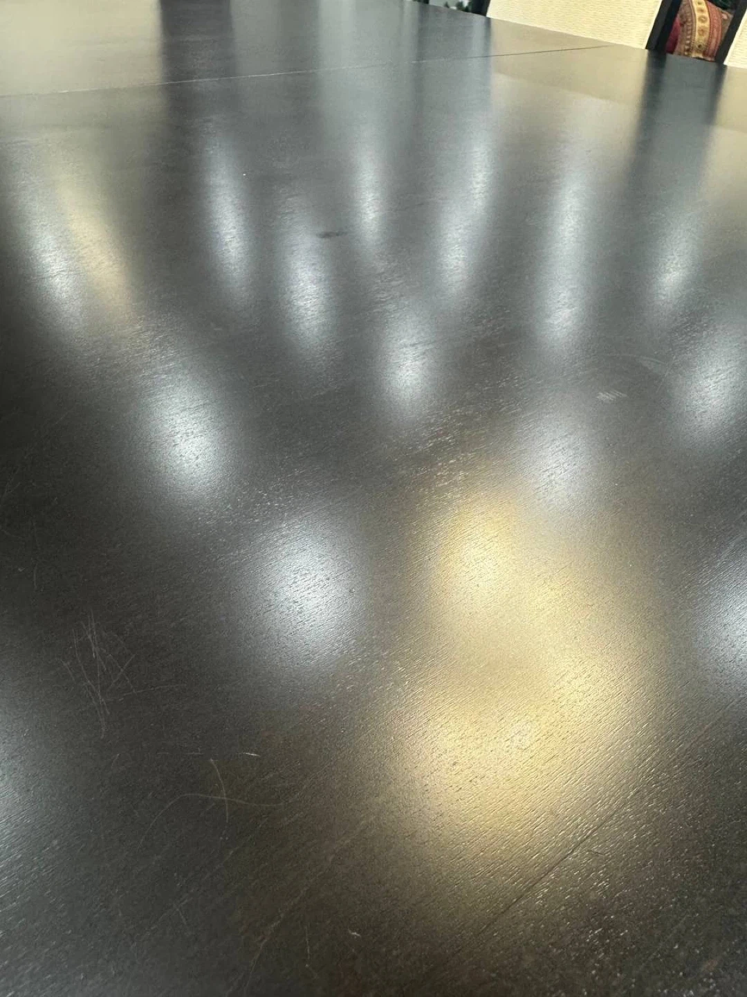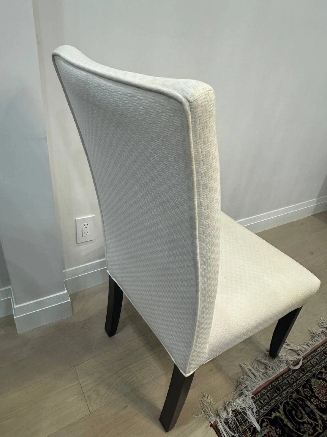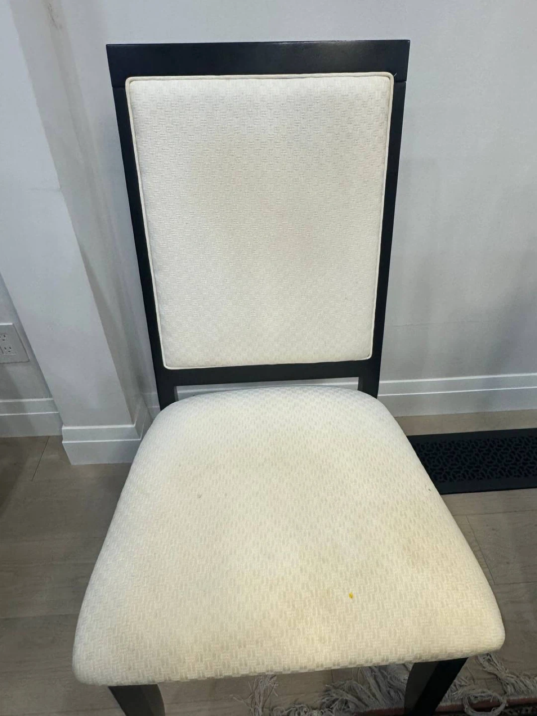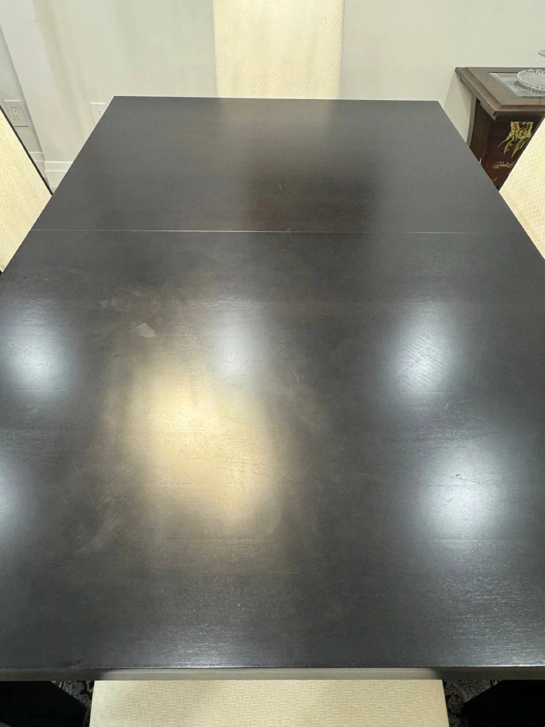 Selling a dining table with six chairs. The table is black, and the chairs are cream-coloured with black frames. It's a great set for family meals or entertaining guests. The table has some signs of use, but it's still in good condition and ready for a new home