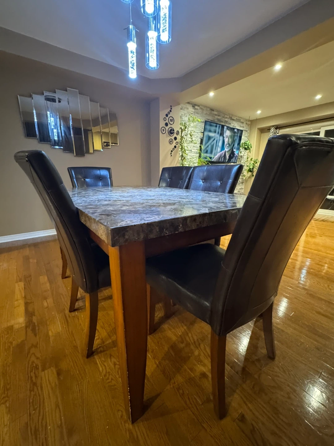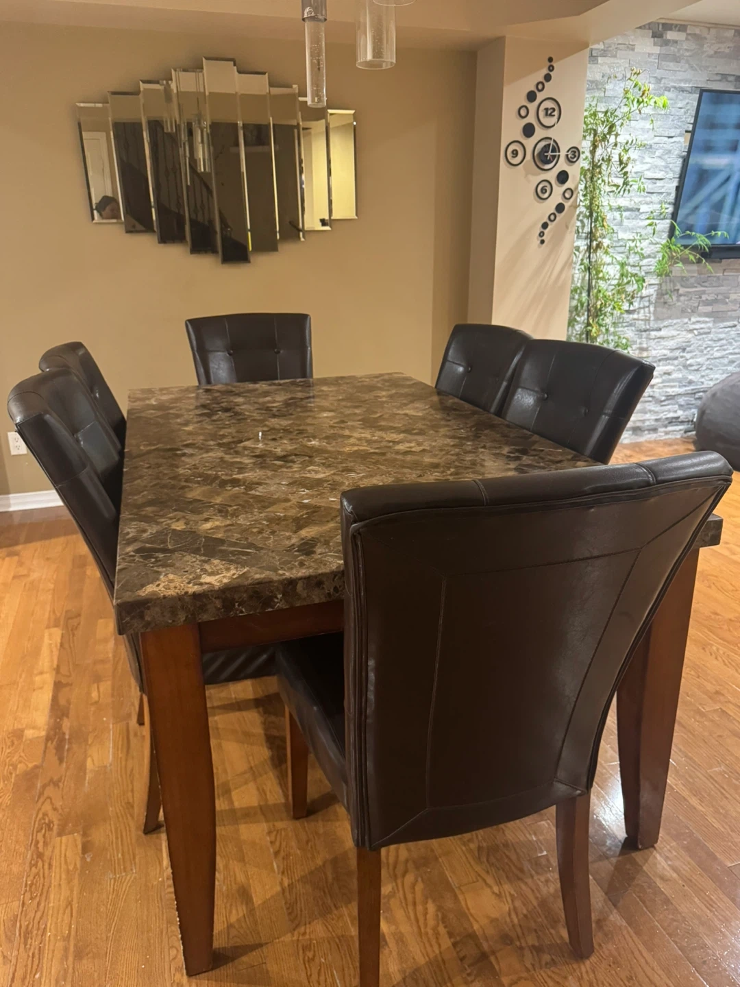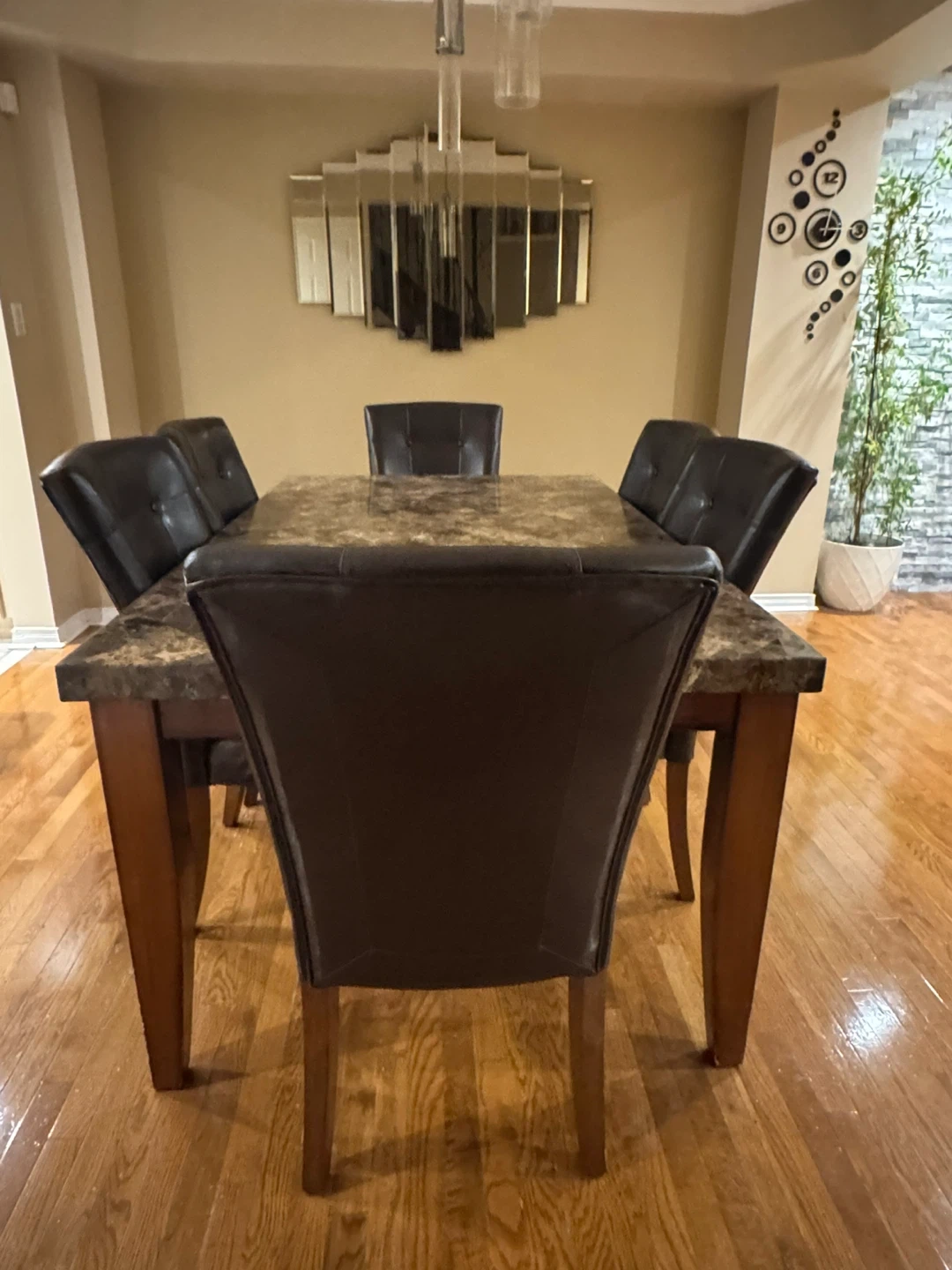 Selling a dining table with six chairs. The table has a faux marble top and wooden legs. The chairs are upholstered in a dark brown faux leather material. The set is in good condition and would be a great addition to any dining room