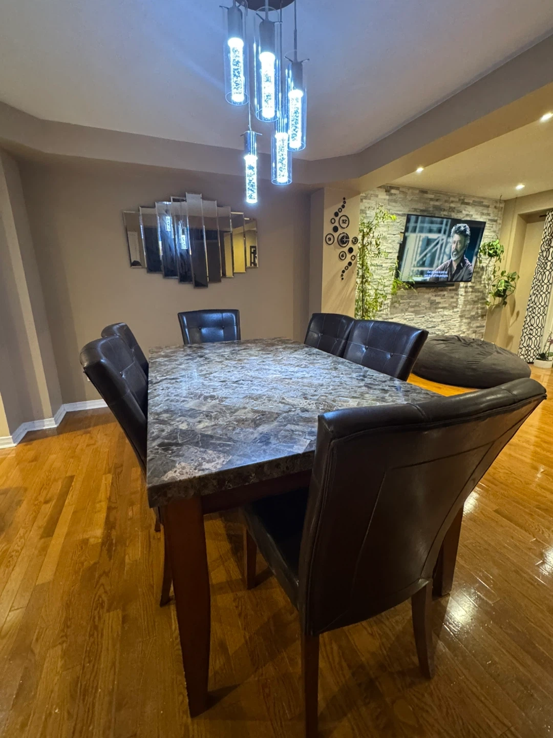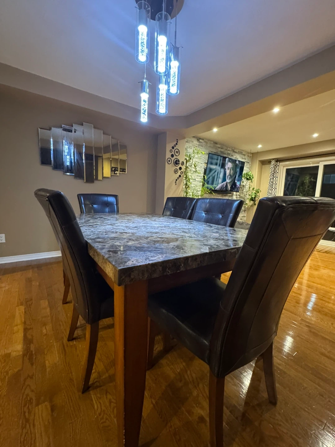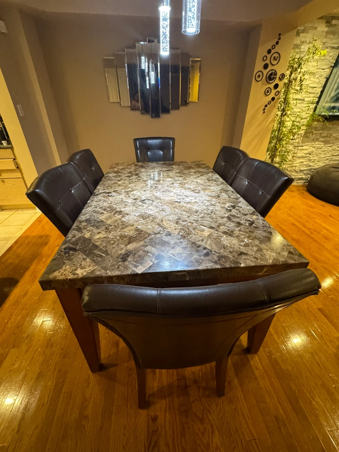 Selling a dining table with six chairs. The table has a faux marble top and wooden legs. The chairs are upholstered in a dark brown faux leather material. The set is in good condition and would be a great addition to any dining room