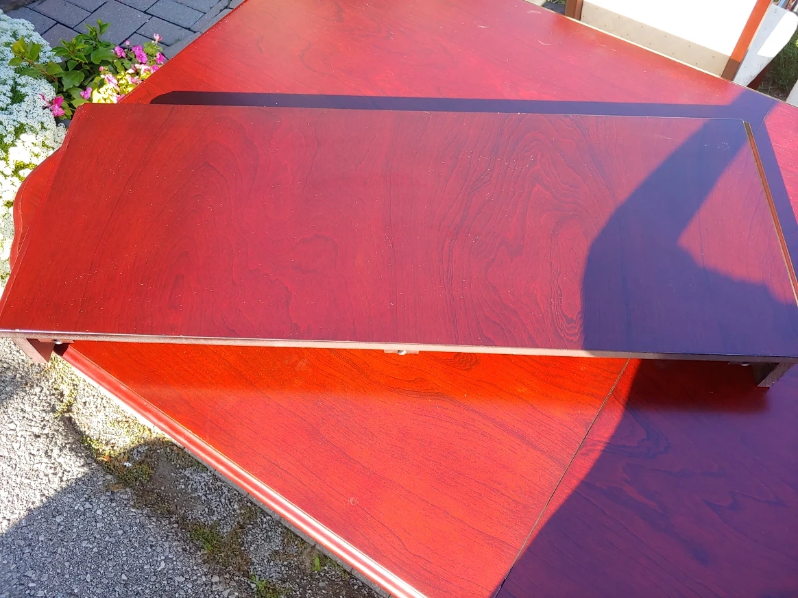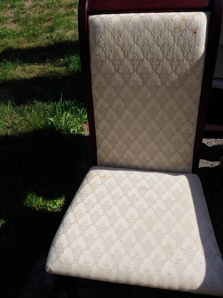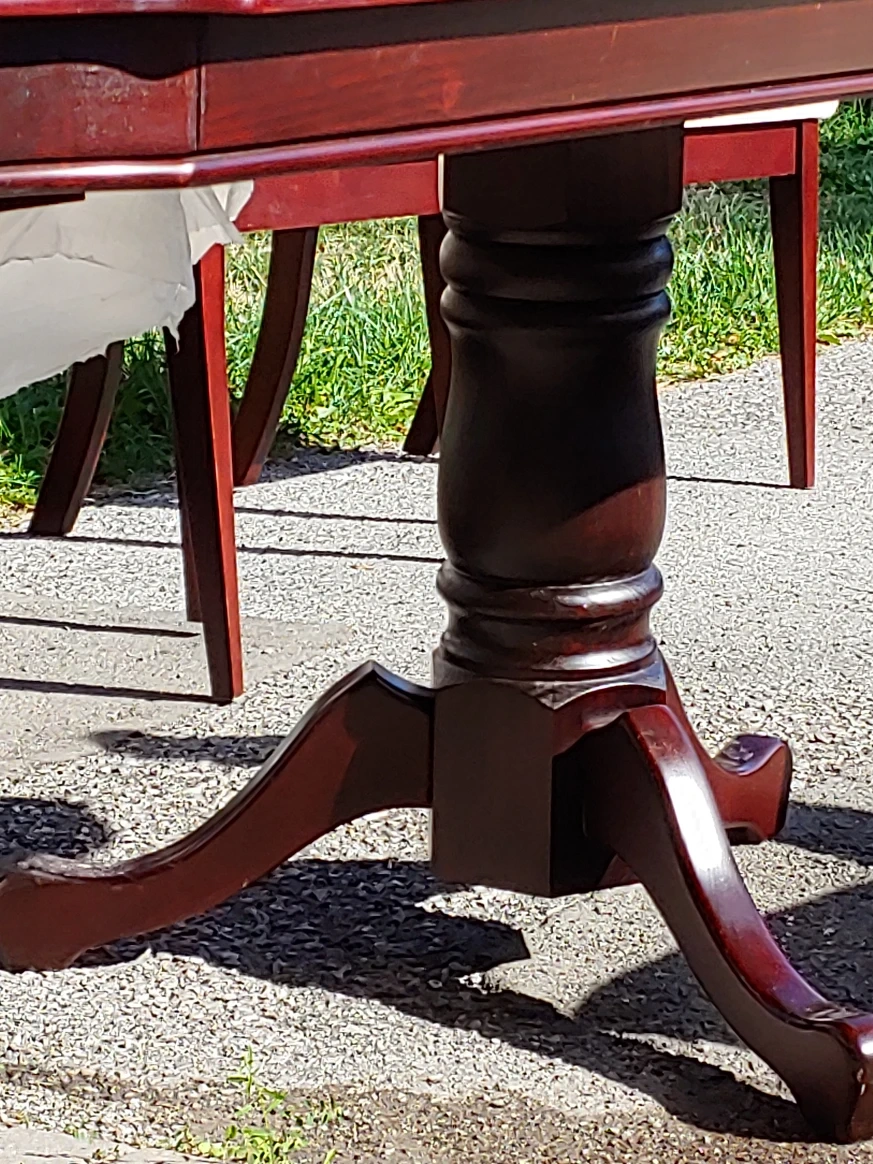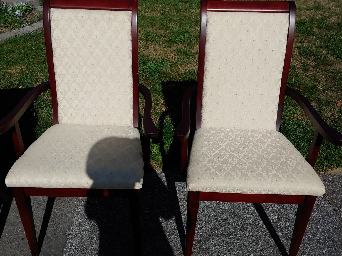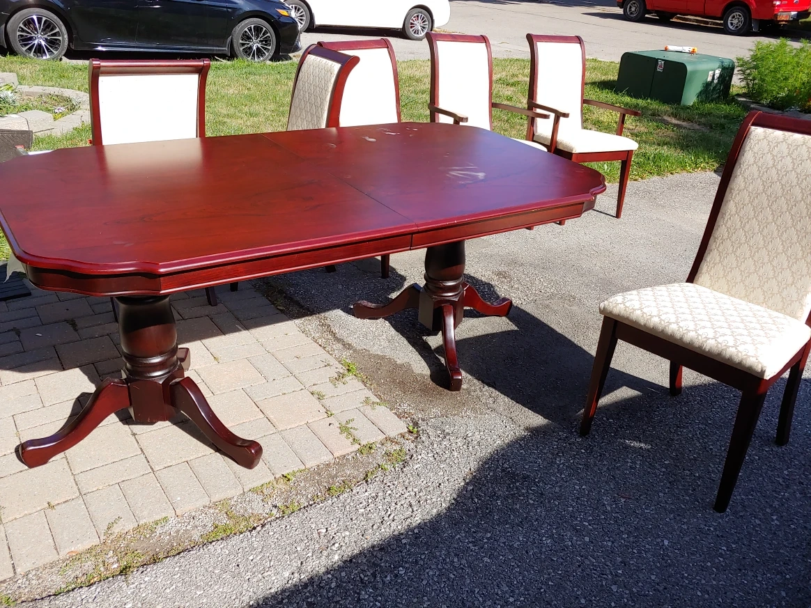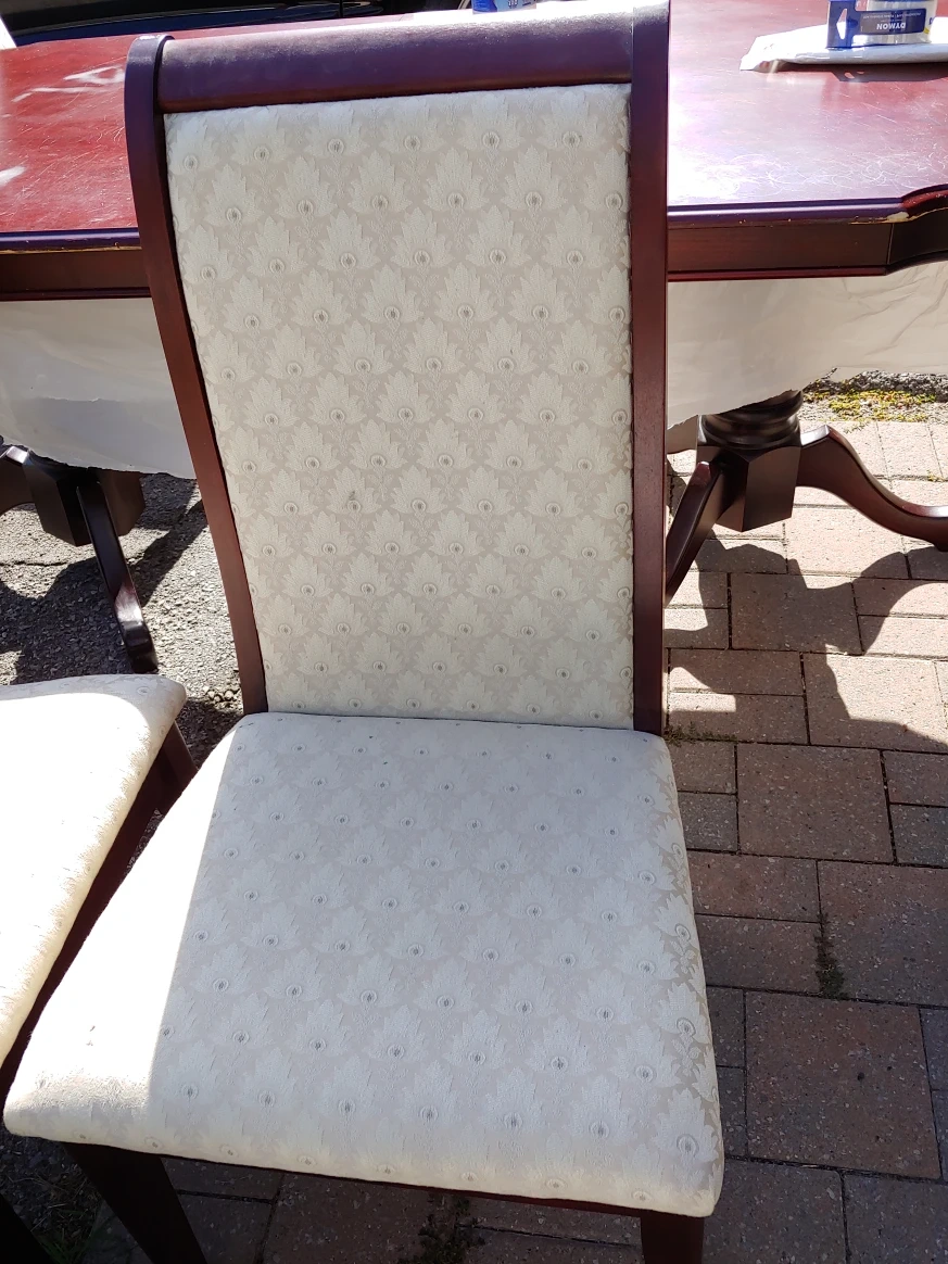 Selling a dining table with six chairs. The table has a rich mahogany finish and comes with an extension leaf. The chairs are upholstered with a neutral fabric. A great set for family dinners or entertaining! Please note, table has some white spot rings from water glasses and few scratches on edge from movers. Ideal find, just needs a little touch up.