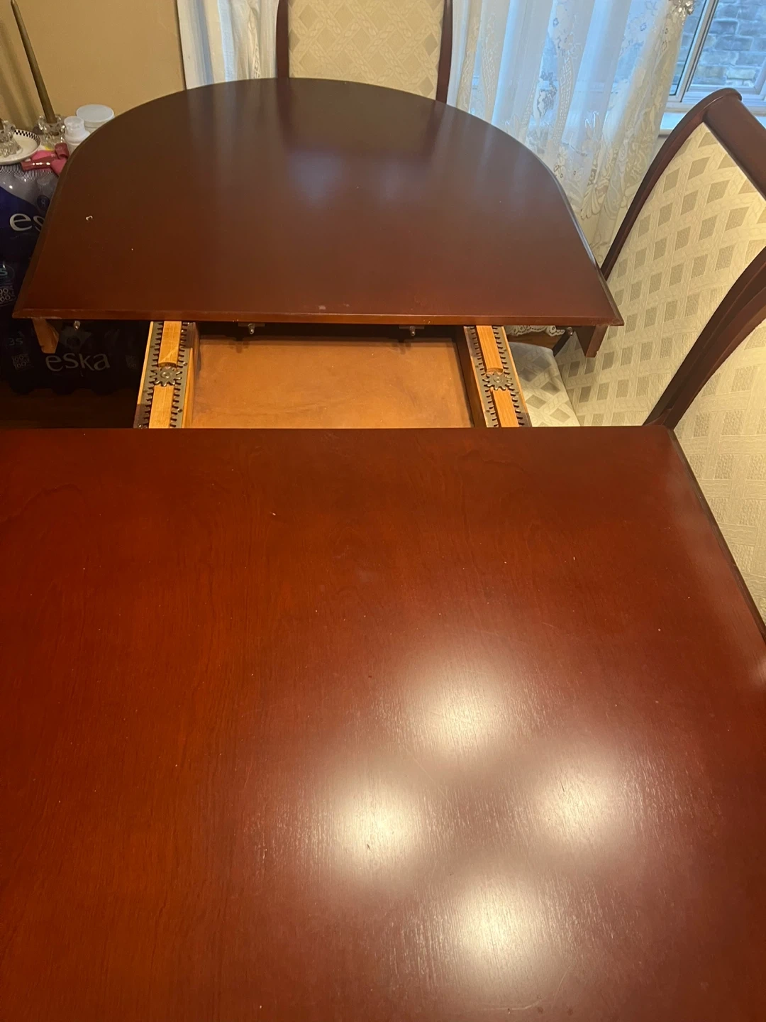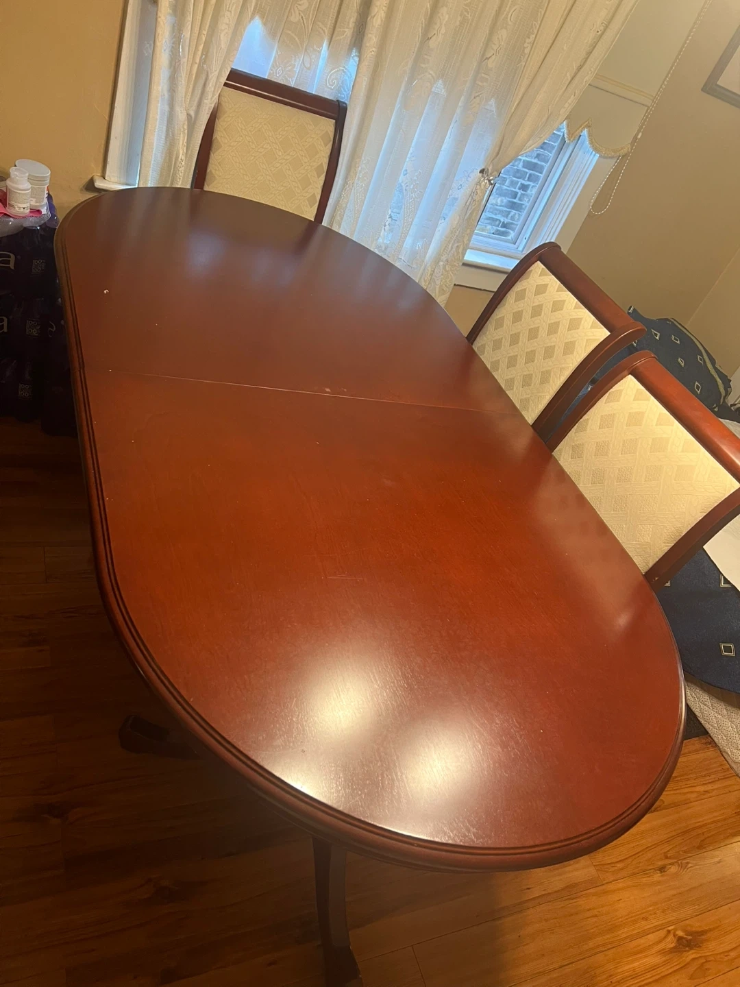 Selling a dining table with six matching chairs. The table has a wooden finish and a leaf insert for expanding the table size. The chairs have a wooden frame with a cream-coloured fabric seat and back. The set is in good condition and would be a great addition to any dining room