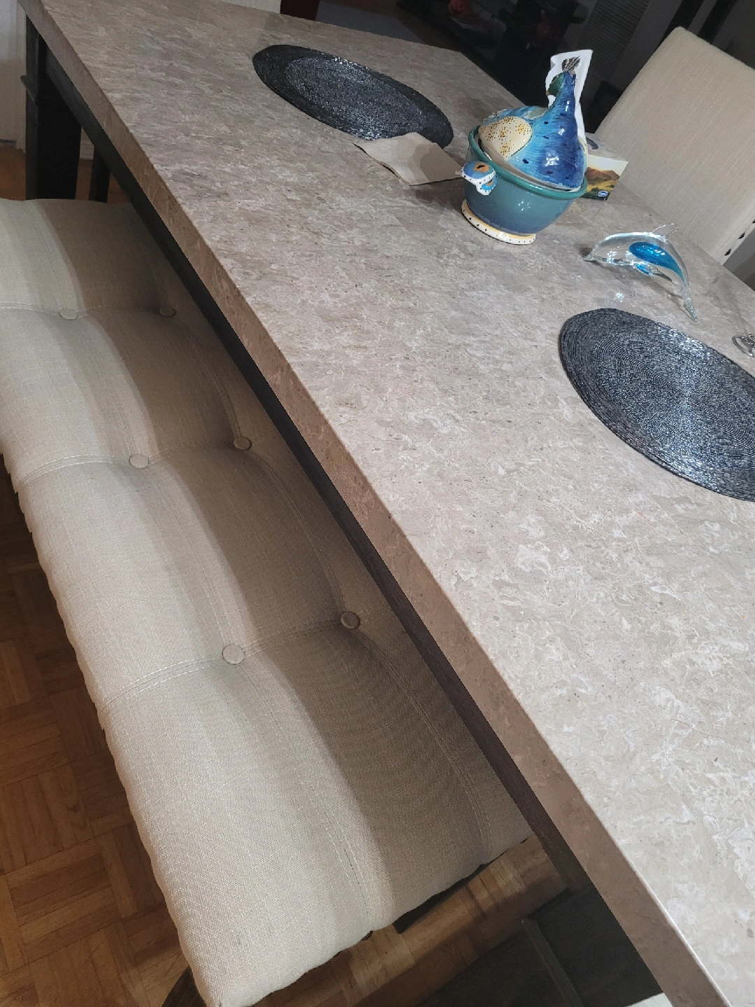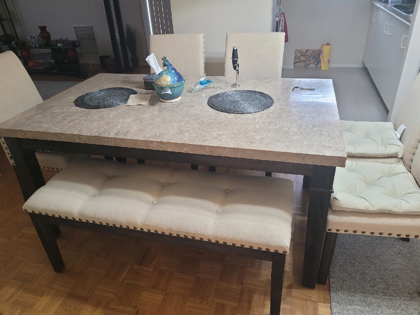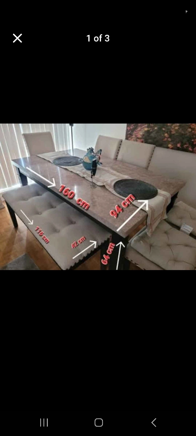 Selling a dining table set that includes a bench and five free chairs. The table dimensions are 160 cm in length and 94 cm in width. The bench is 115 cm in length and 42 cm in height. The table has a beautiful, neutral-toned top, and the bench and chairs have comfortable cushions. Note: THE CHAIRS ARE 6/10 NOT NEW. THAT'S WHY I'M GIVING IT FOR FREE. Serious buyers only please