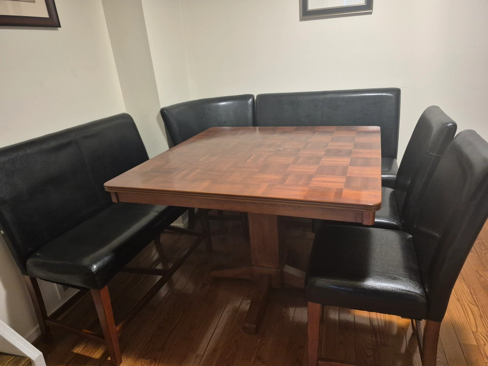 Selling a dining table set with a bench and two chairs. The table has a wooden top with a unique pattern, and the seating is black leather. It's a great set for a smaller dining area or kitchen nook
