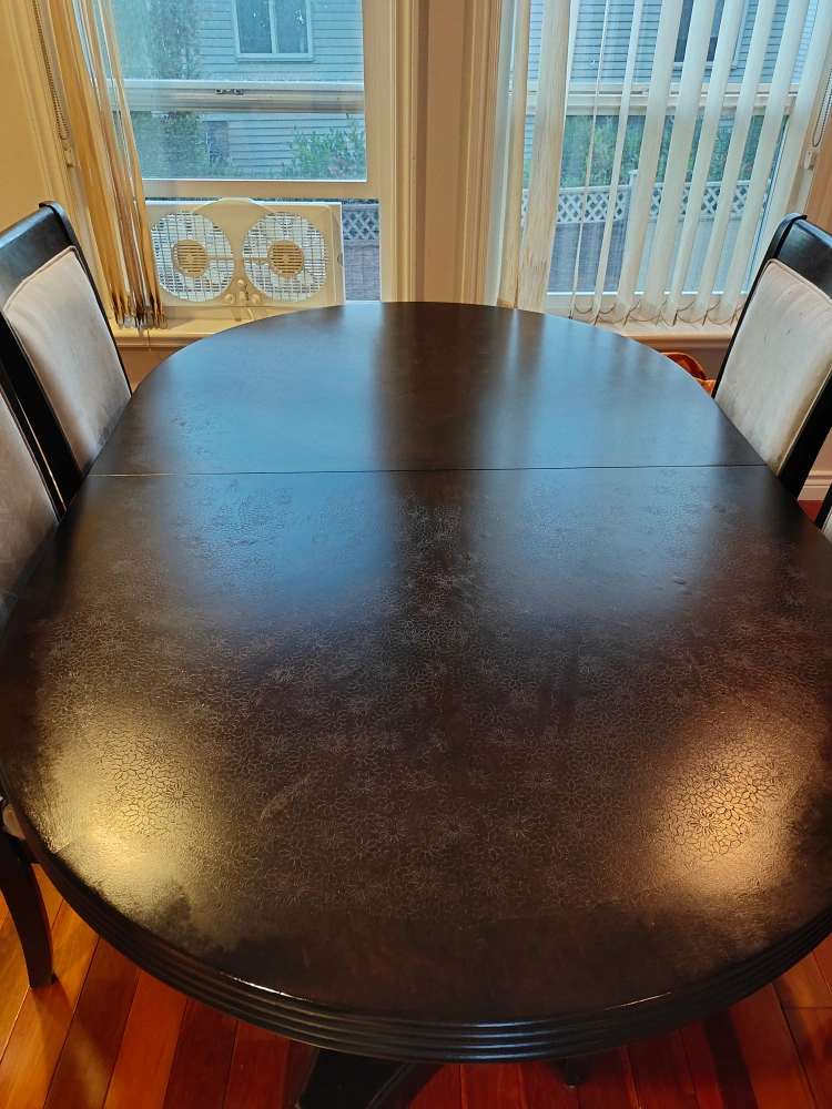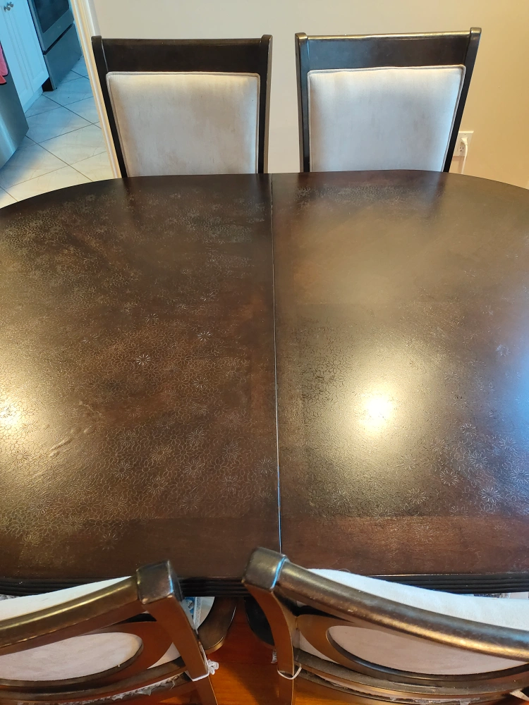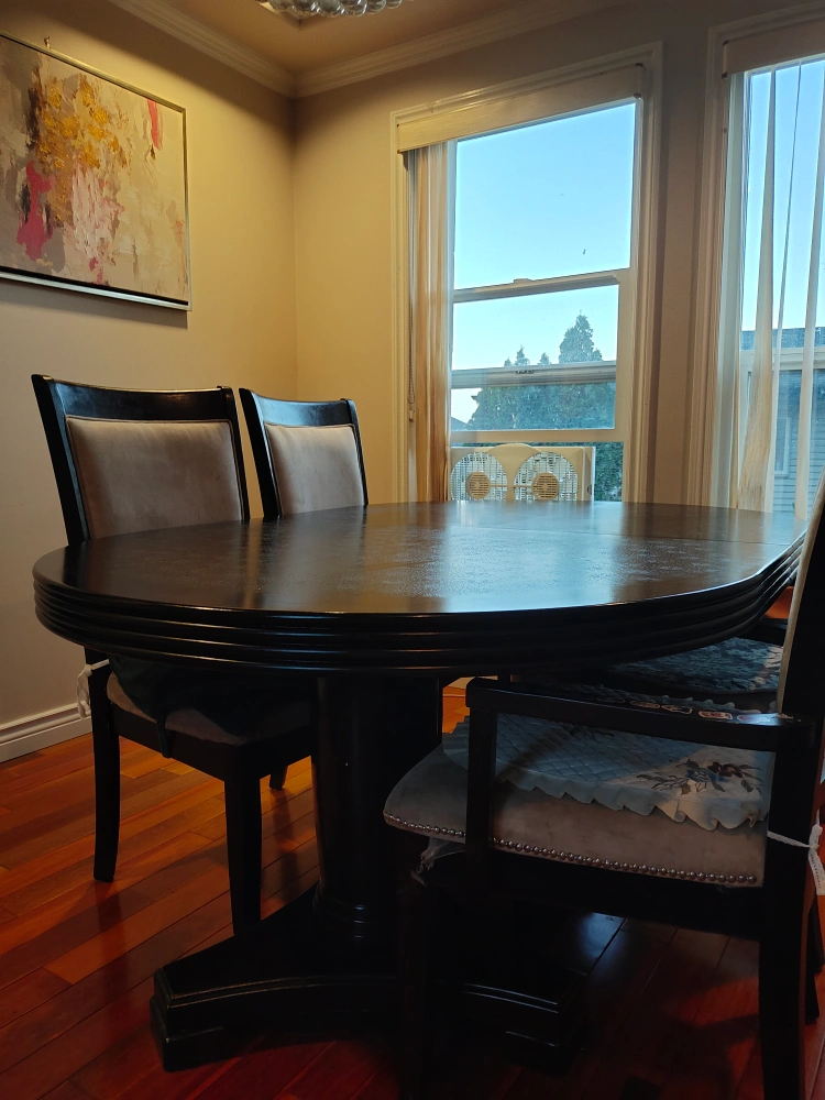 Selling a dining table with chairs. It's in good condition and perfect for family dinners or gatherings. The table has a classic design that will fit well in any dining room!