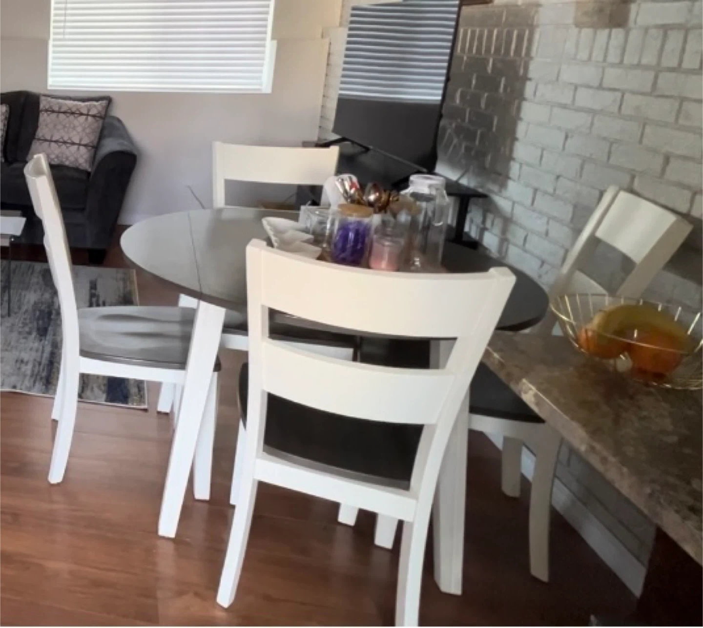 Selling a dining table with four chairs. The table appears to be round with a dark top, and the chairs are white with a ladder-back design. Perfect for a small dining area or kitchen nook!