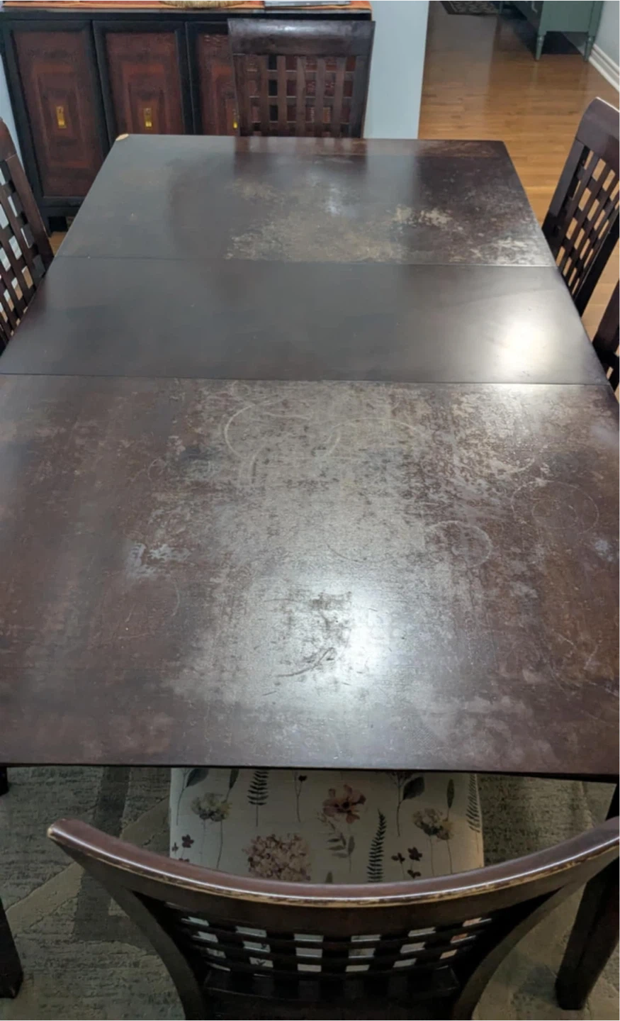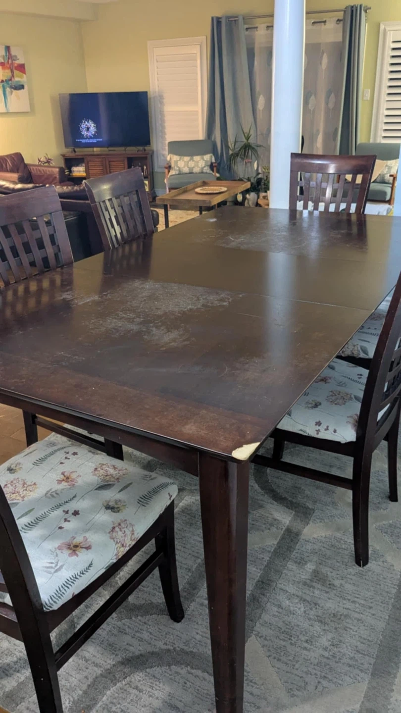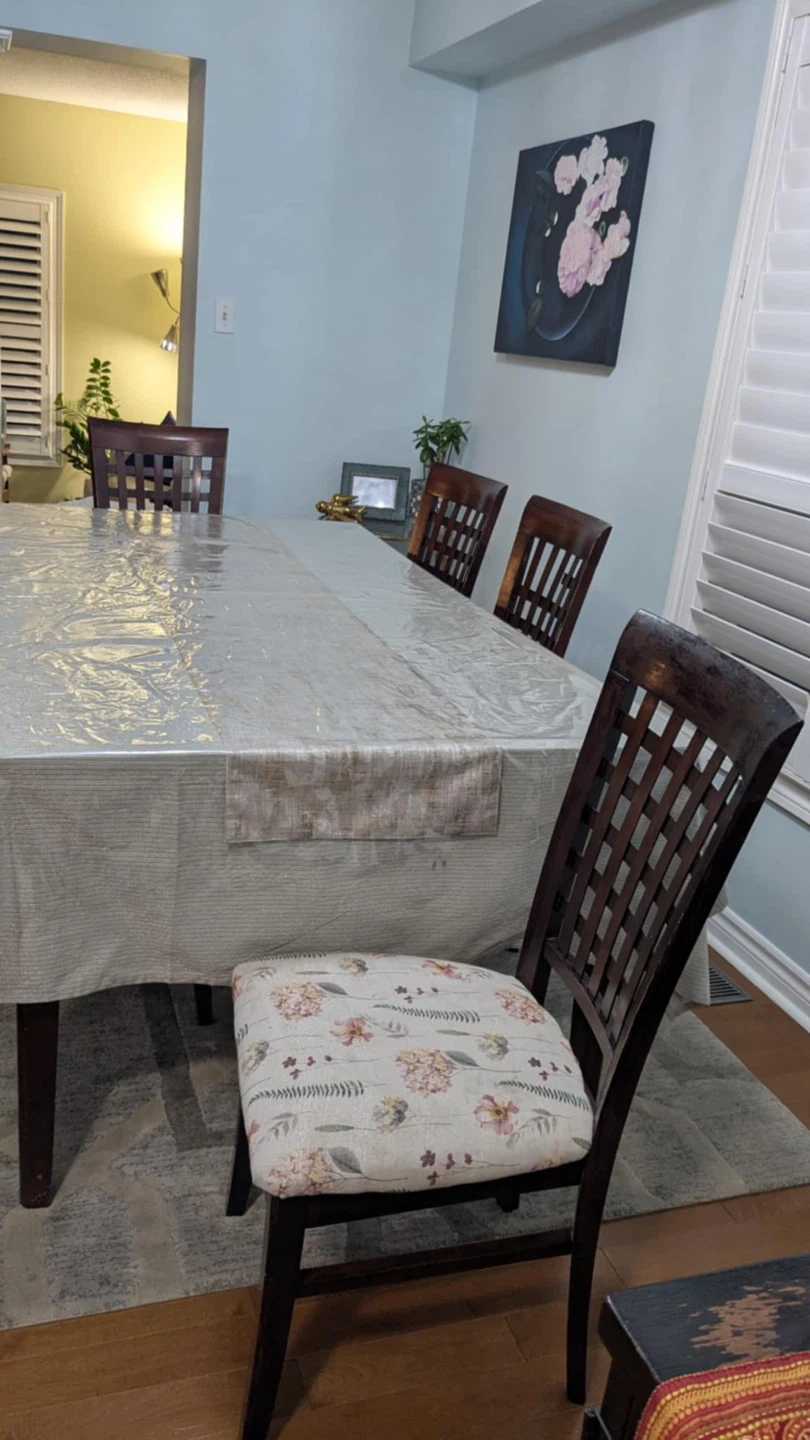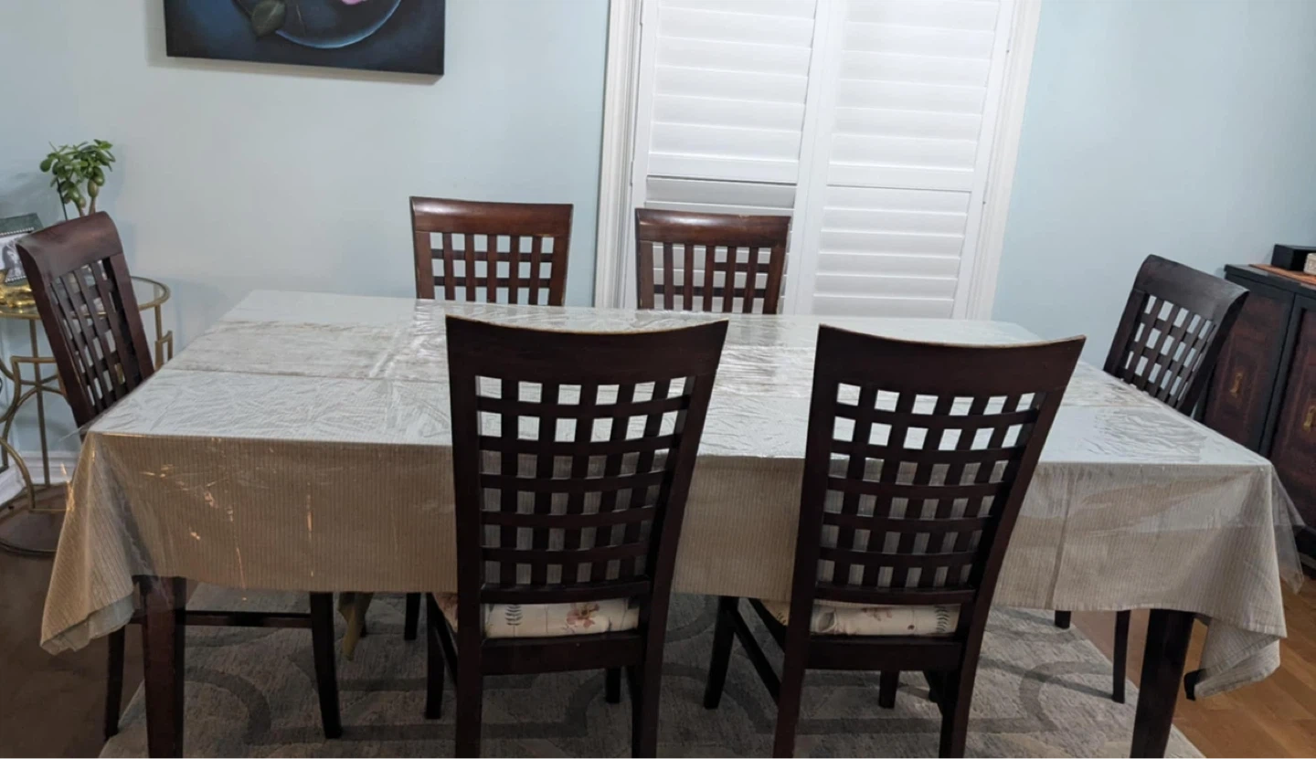 Selling a dining table with six chairs. The chairs have a floral pattern on the seat, newly upholstered. The table and chairs were bought in the early 2000’s, so they are least 20 years old, but in good condition!! Note that there is surface damage on the table from normal use and one chair has a small piece of backing missing. I’m selling for my parents, so no drop off option available, pick up only! The table will be disassembled for easier transport, but the chairs will need to be picked up as-is.
