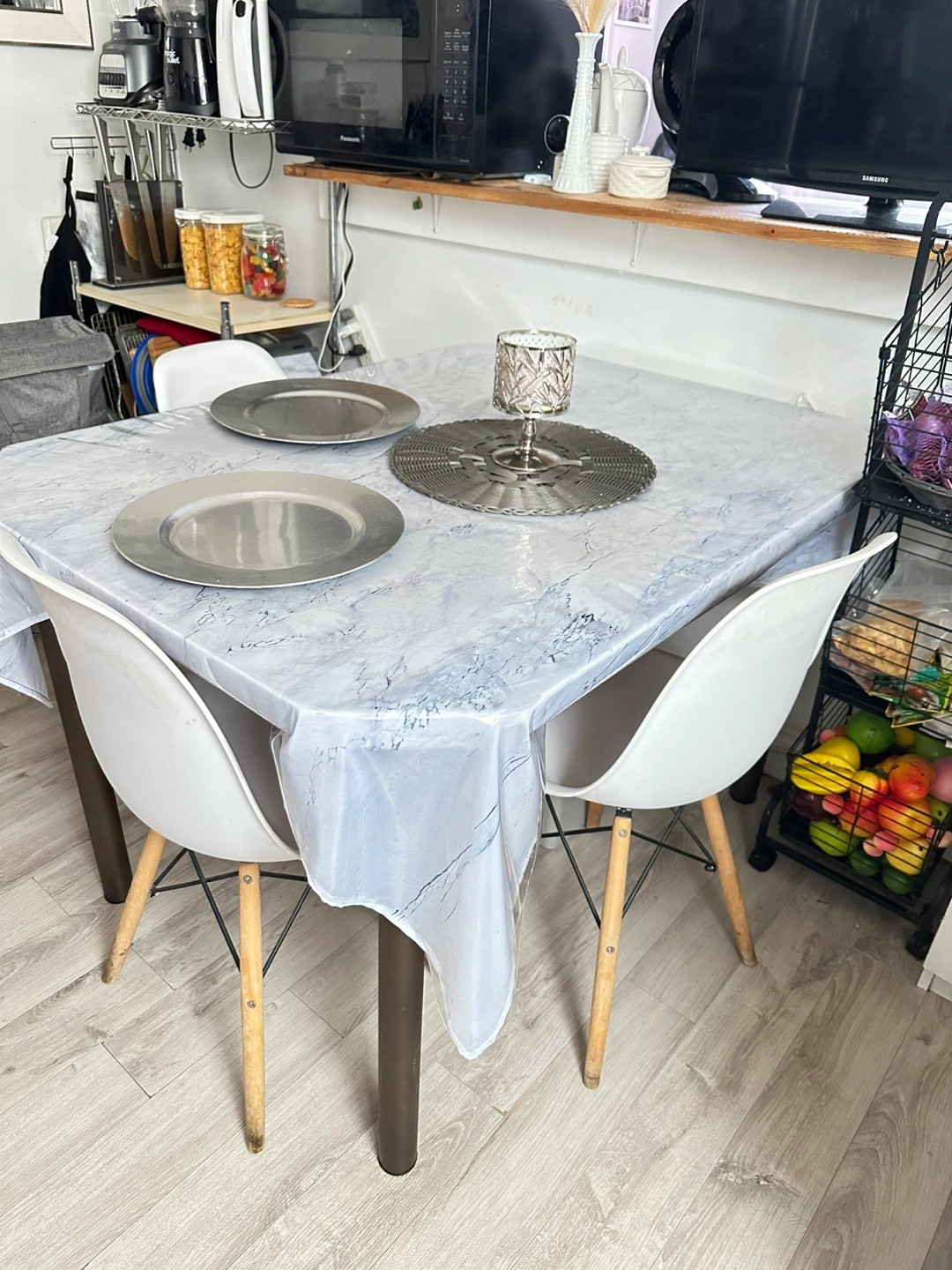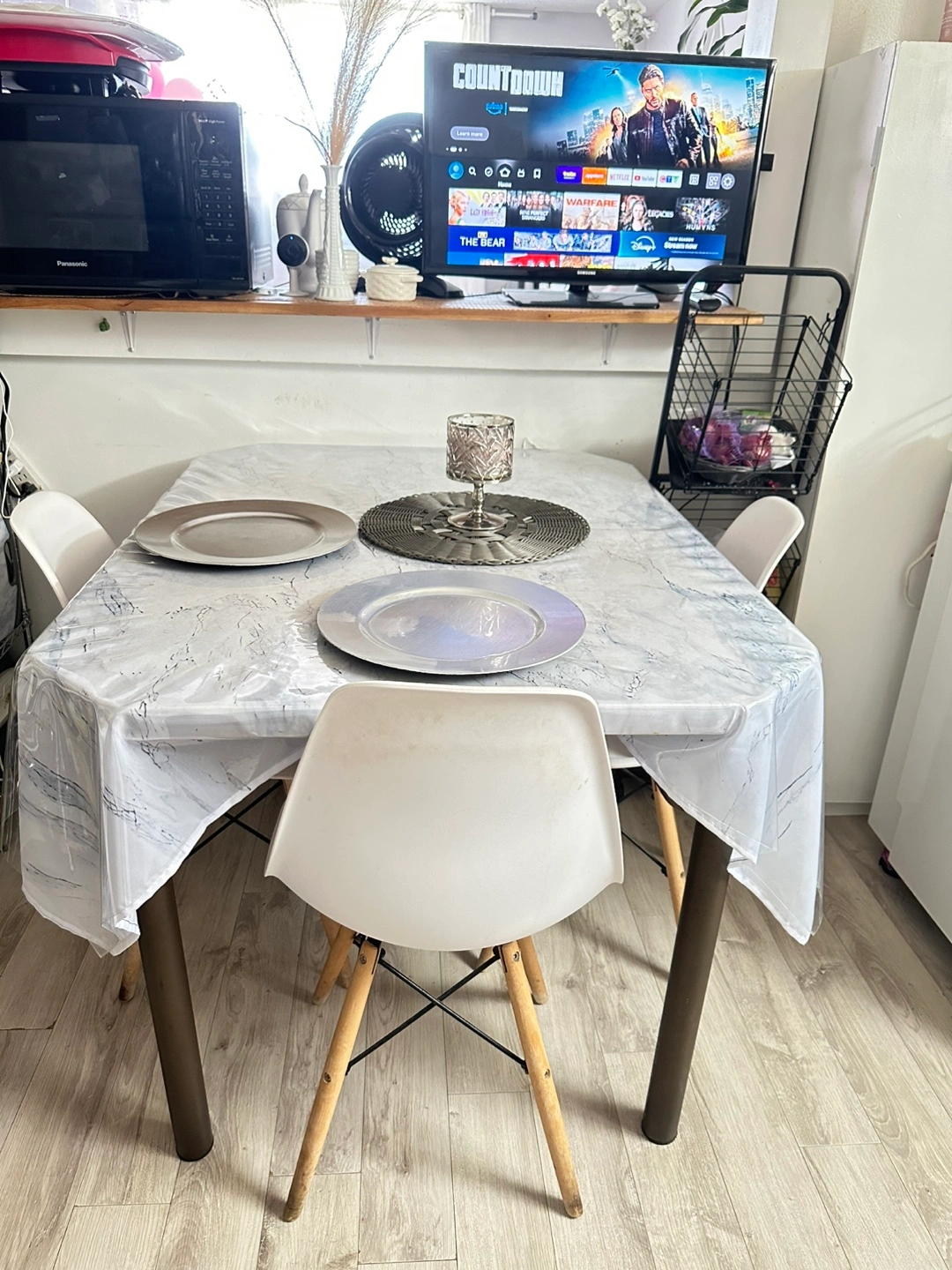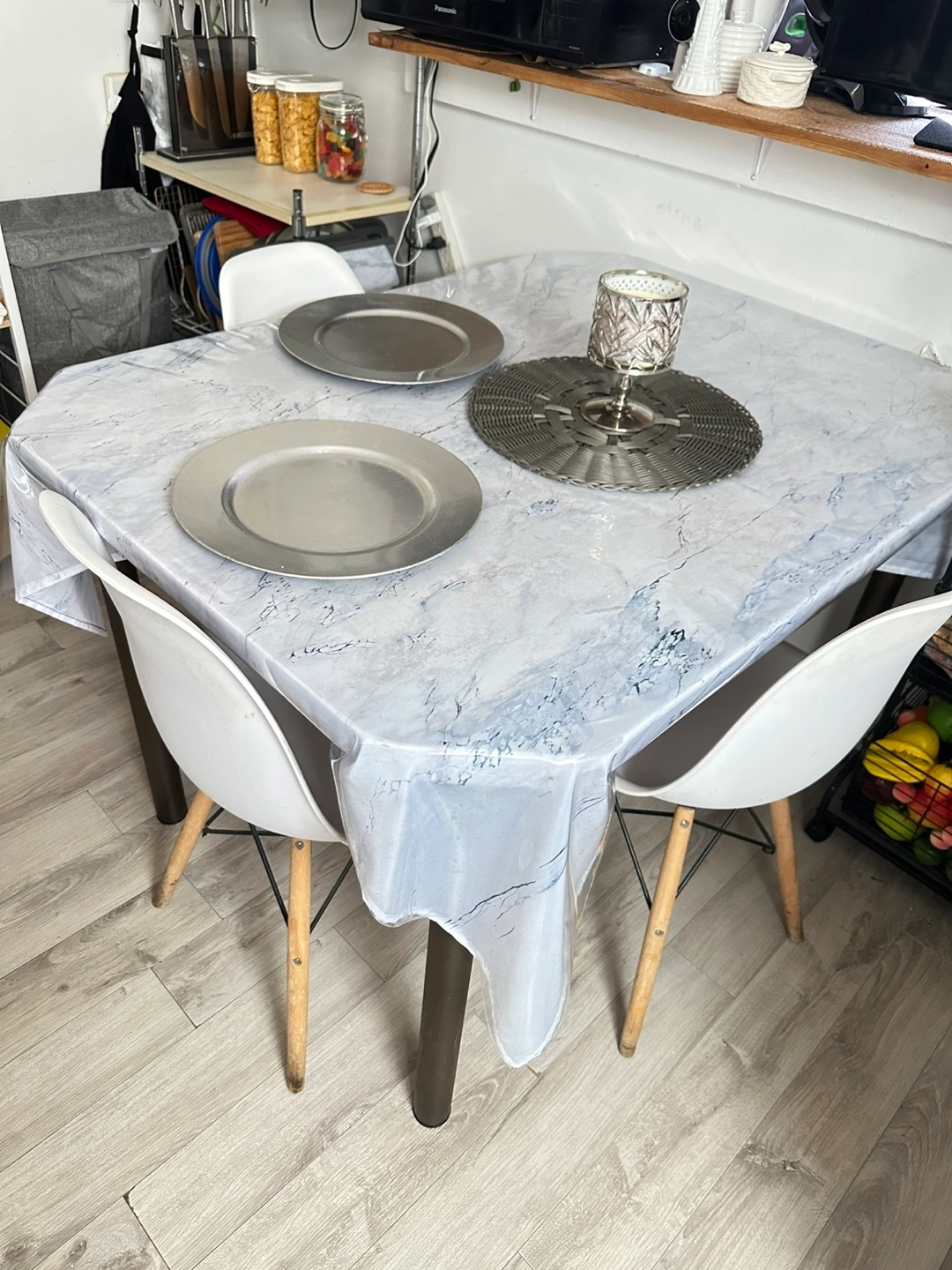Selling a dining table with a white marble pattern tablecloth. It's in great condition and ready to brighten up your dining space! The table is a standard size, perfect for small to medium-sized dining areas. The tablecloth adds a touch of elegance and is easy to clean!