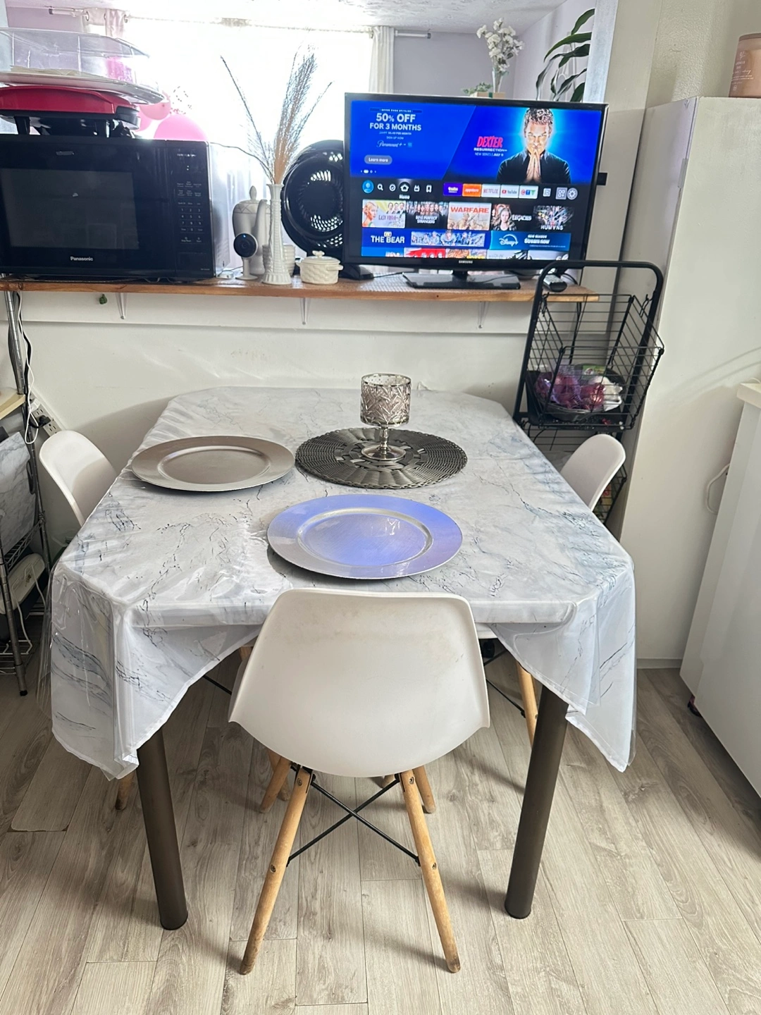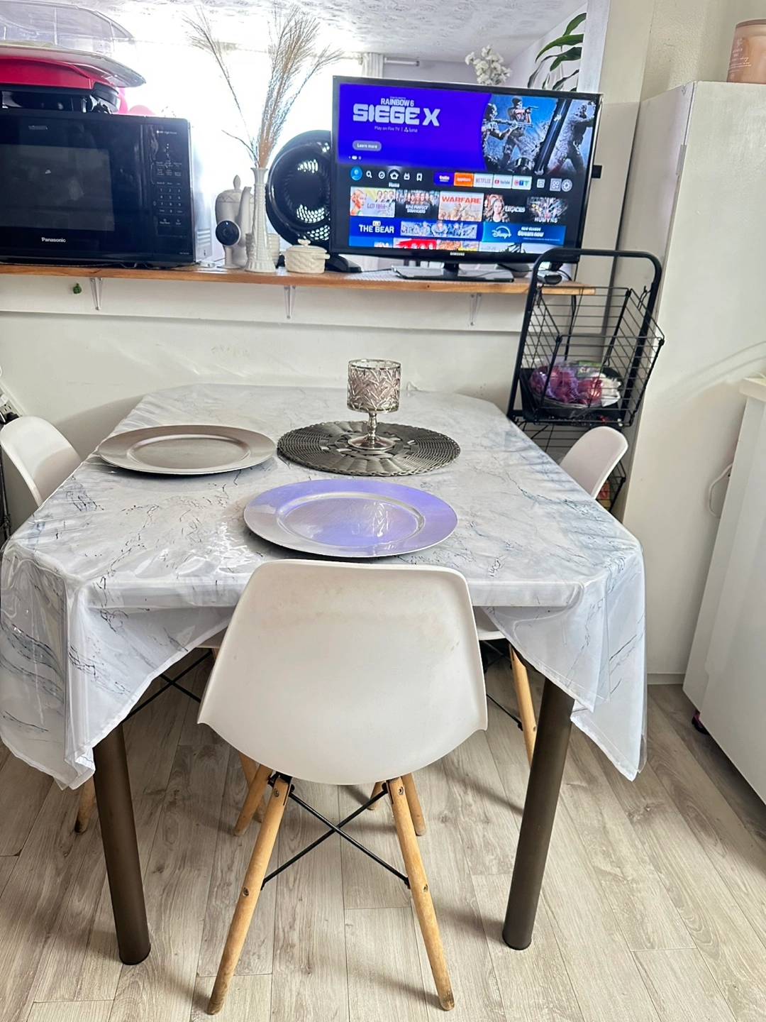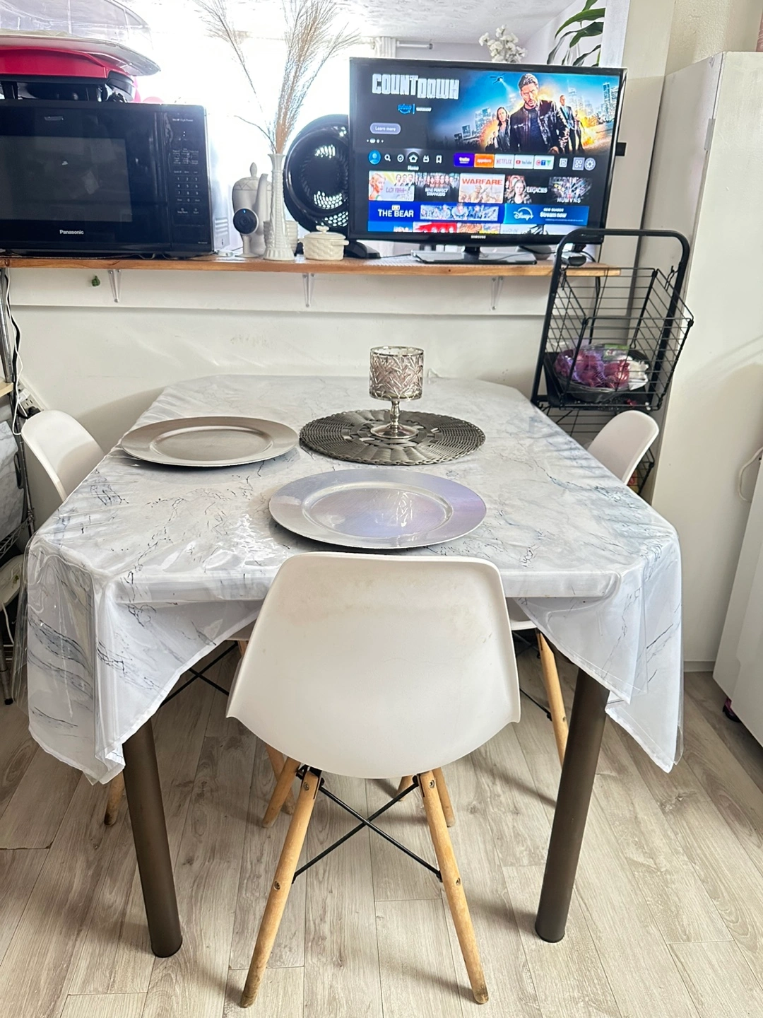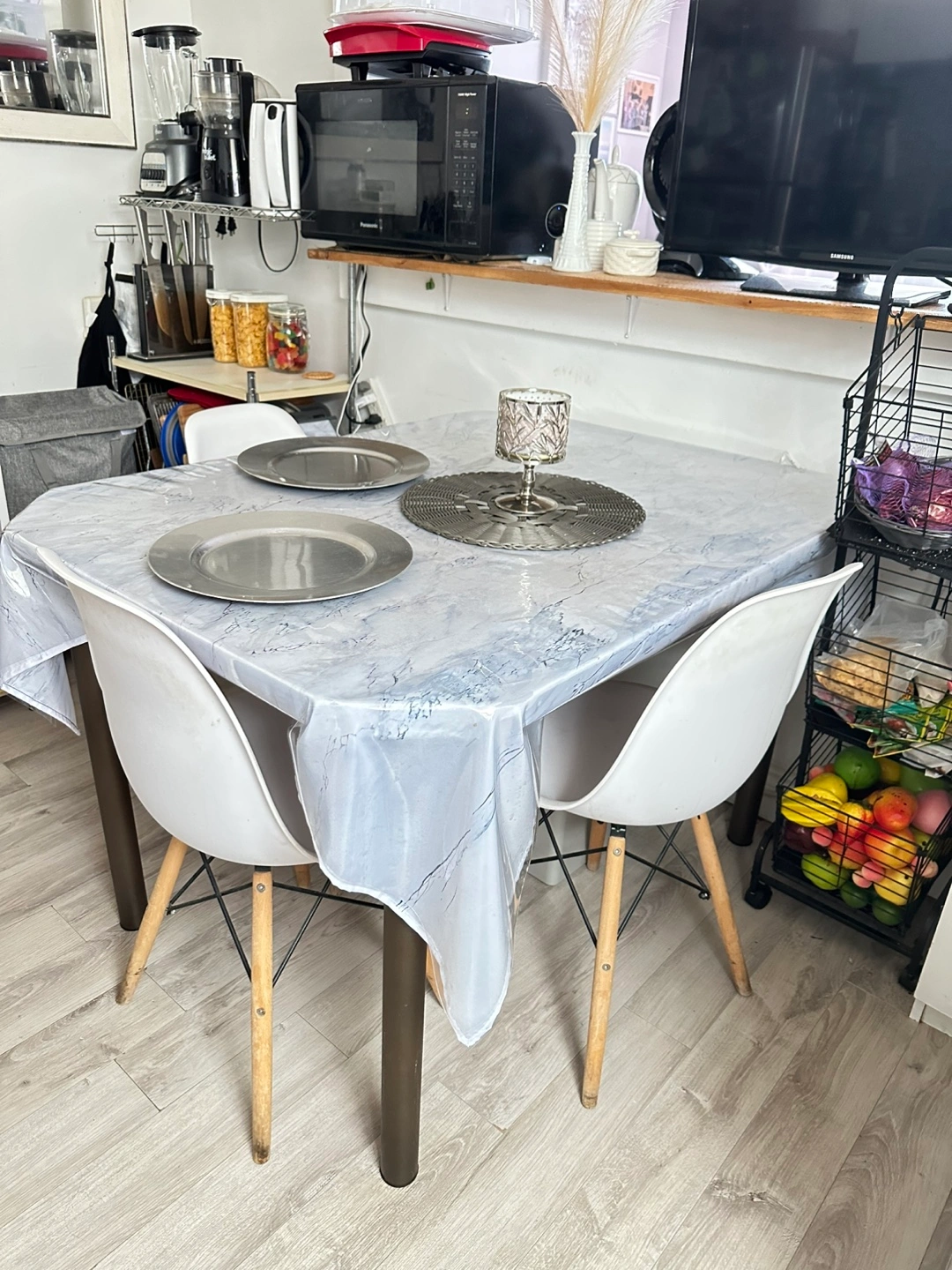 Selling a dining table with a white marble pattern tablecloth. It's in great condition and ready to brighten up your dining space! The table is a standard size, perfect for small to medium-sized dining areas. The tablecloth adds a touch of elegance and is easy to clean!