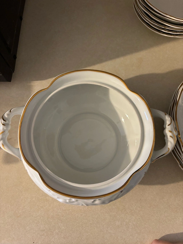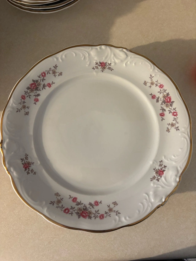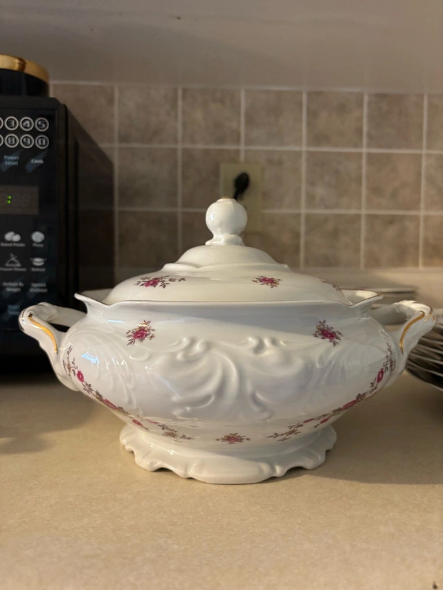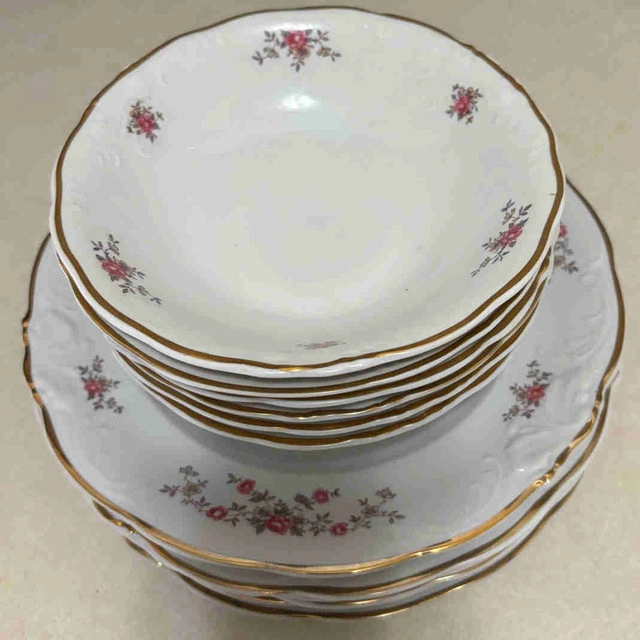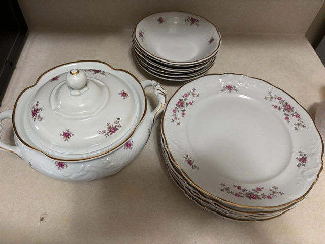 Vintage Porcelain Dinnerware Set – Pink Floral with Gold Trim (13 Pieces) Made in Polland. Elevate your dining experience with this elegant vintage porcelain dinnerware set. Featuring a delicate pink floral pattern and classic gold trim, this set is perfect for both special occasions and everyday use. Includes: 1 Casserole with Lid, 6 Dinner Plates, 6 Bowls. The porcelain is in excellent condition with no chips or cracks. Feel free to message if you have any questions!
