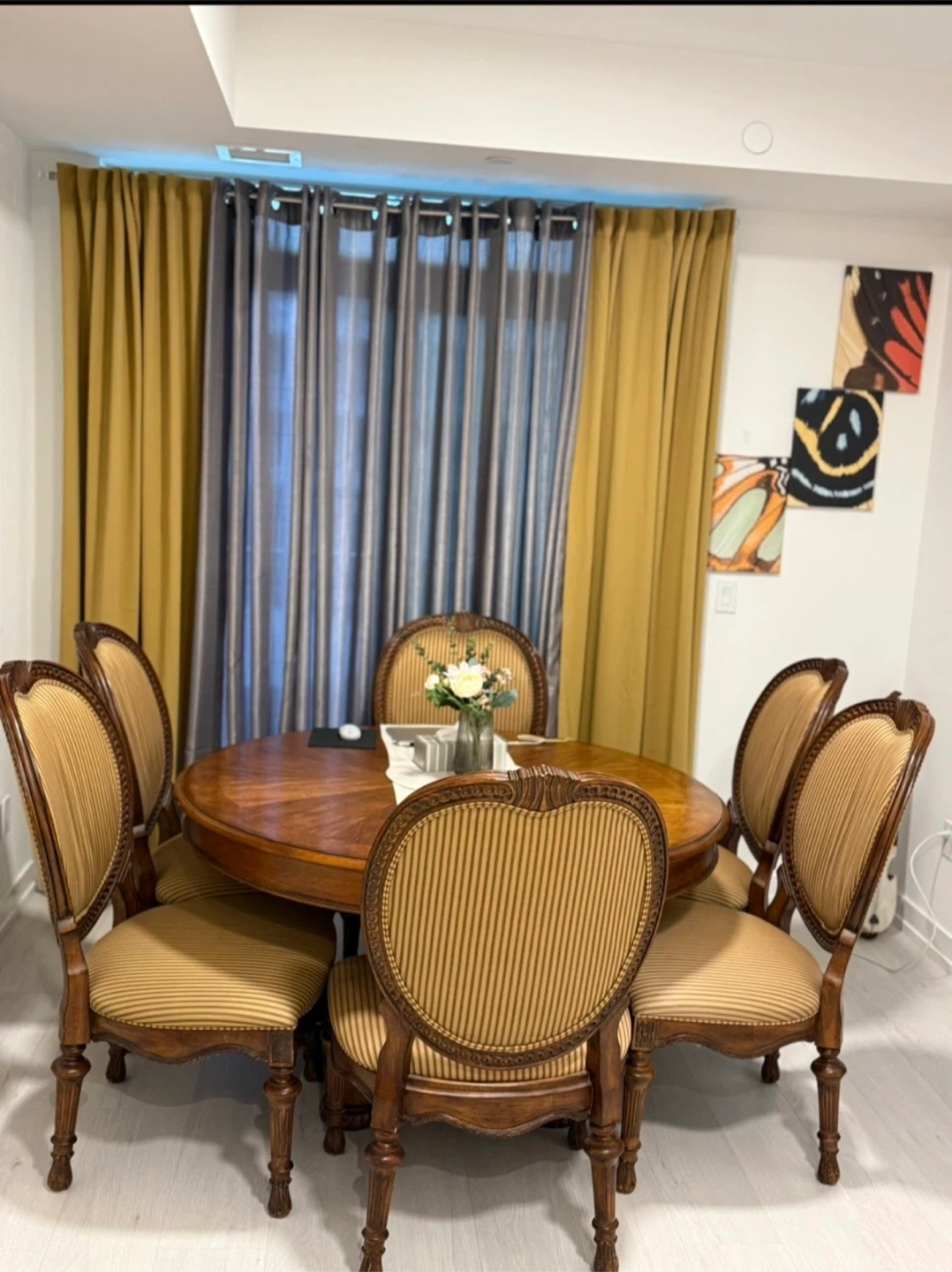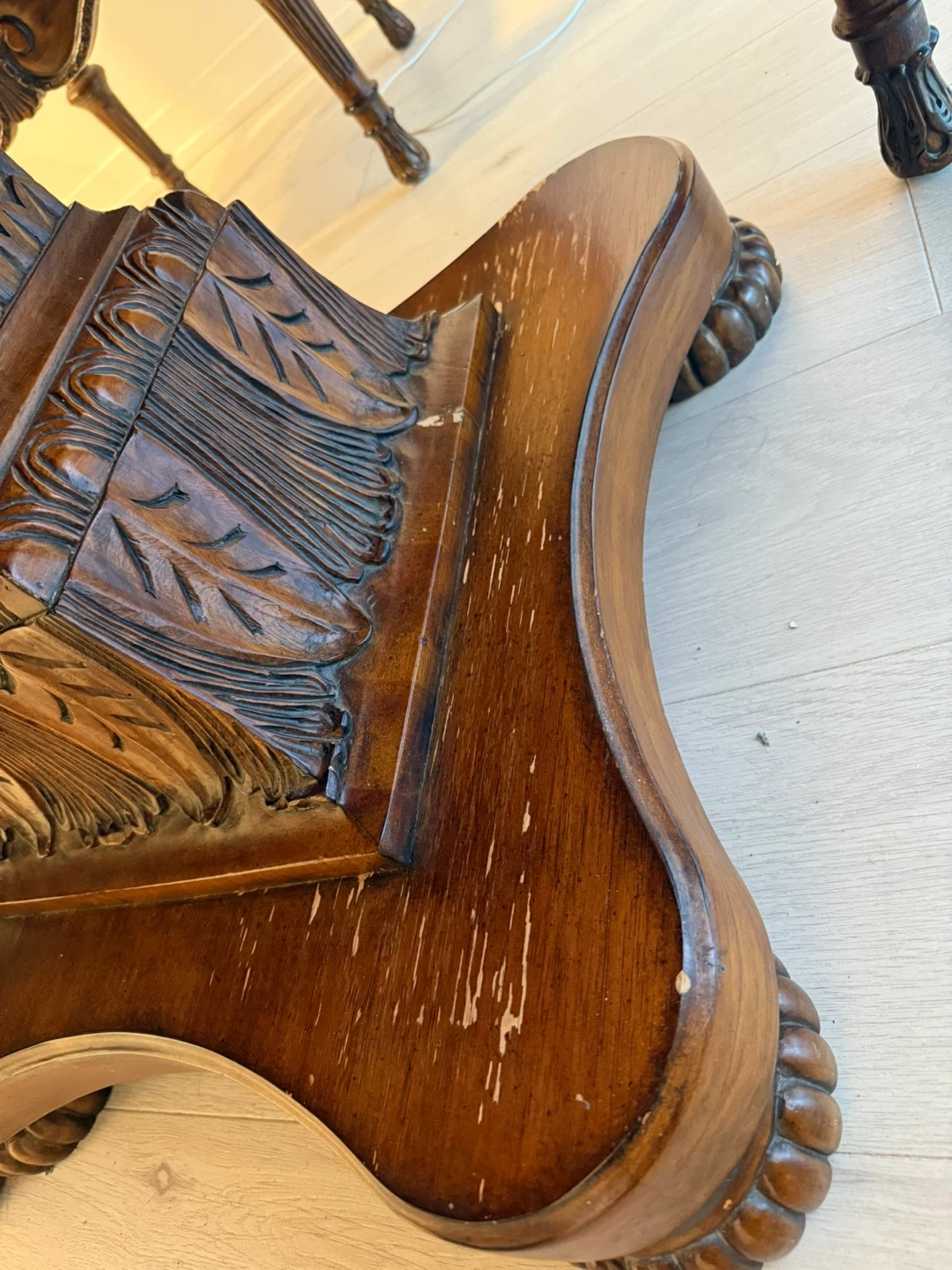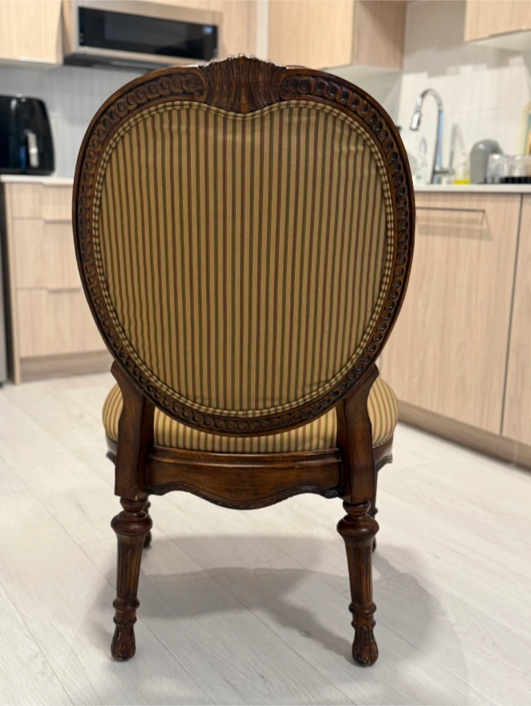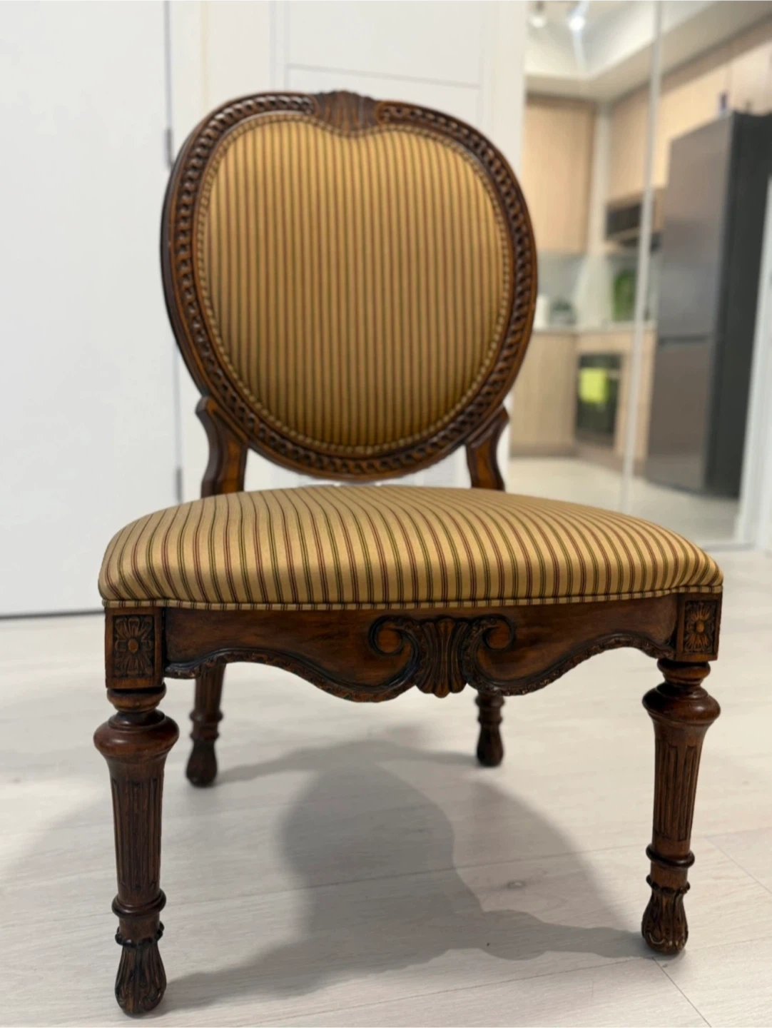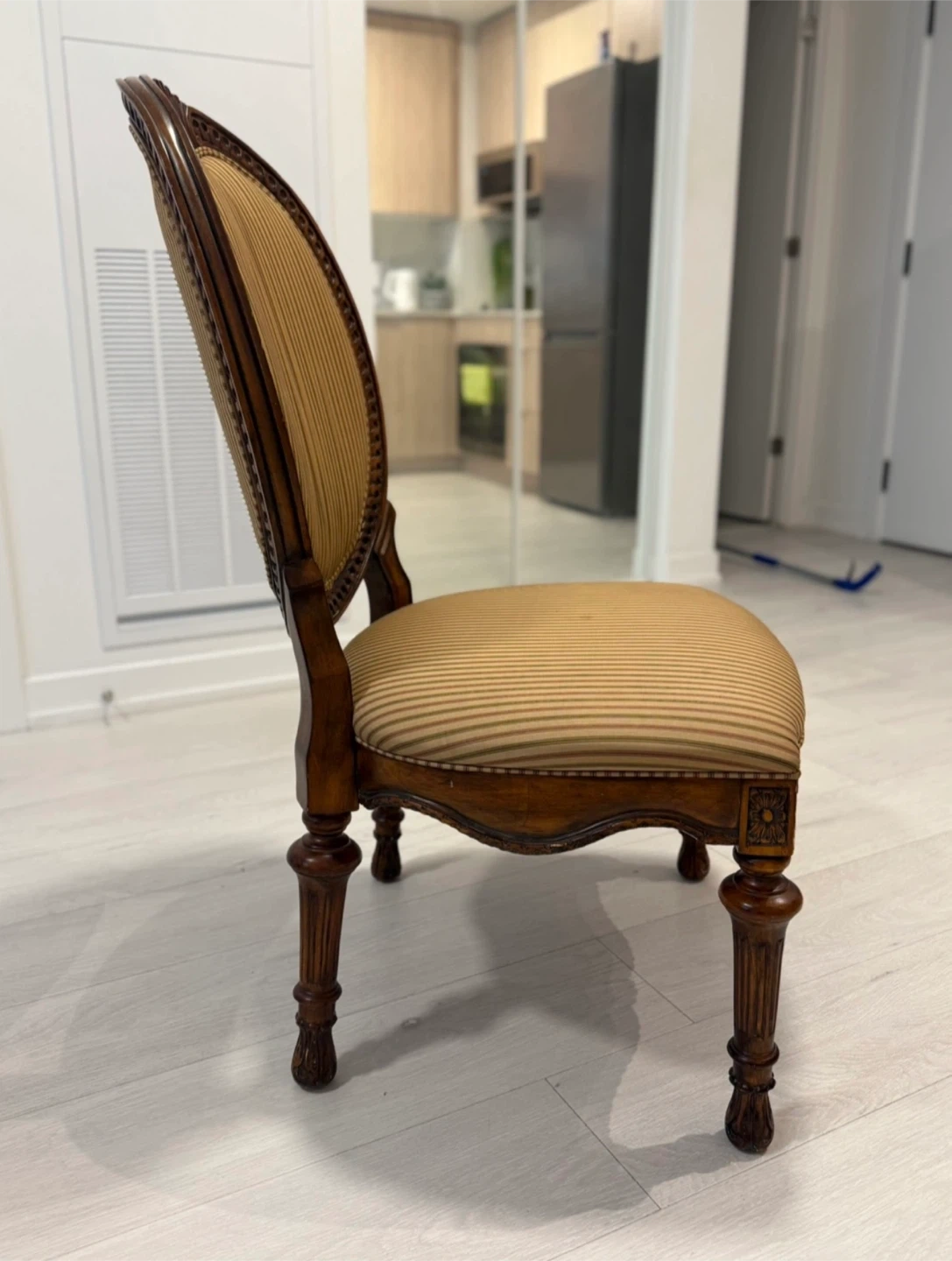 Selling a lovely accent chair with a classic, antique-inspired design! It features a striped fabric seat and back, and a beautifully carved wooden frame. This chair would add a touch of elegance to any room!
