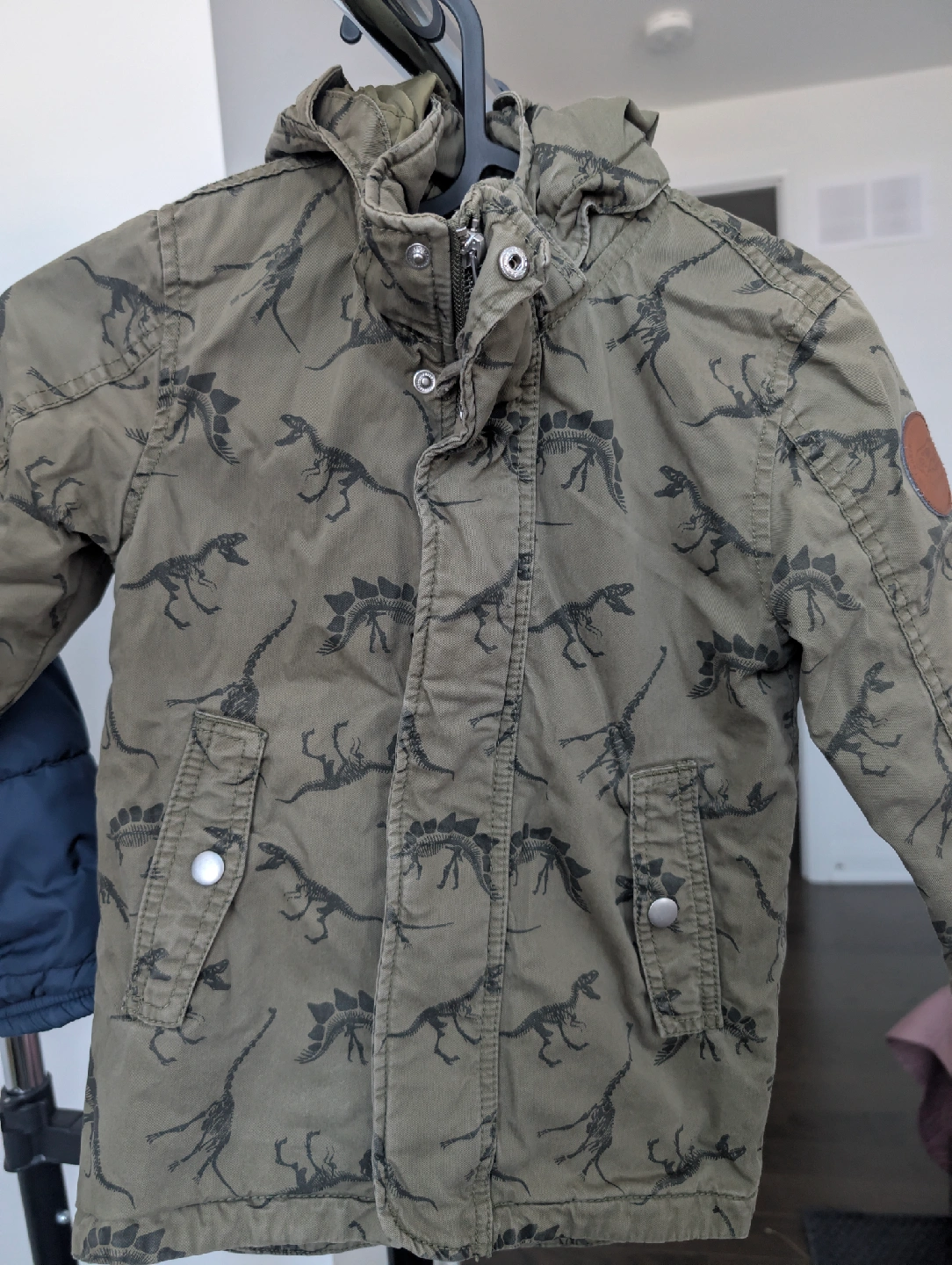 Super cute kids' jacket with a fun dinosaur print! It's in great condition and ready for a new home. Perfect for keeping your little one warm and stylish.