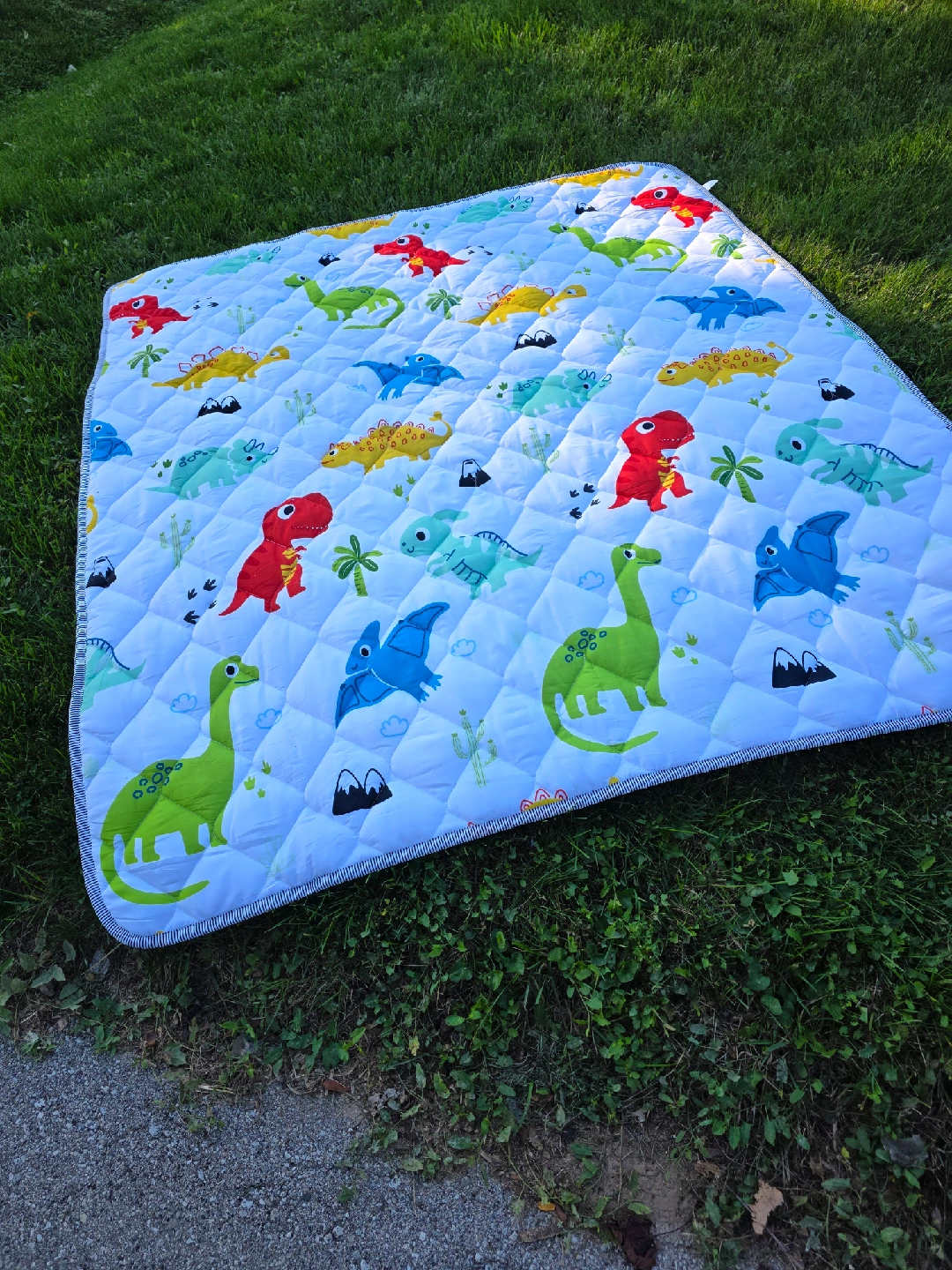 This adorable baby play mat features a fun dinosaur print. It's quilted for extra comfort and perfect for tummy time or playtime. The mat has a white background with colourful dinosaurs and cacti. The backing is a soft grey colour. It's in great condition and ready for a new home!