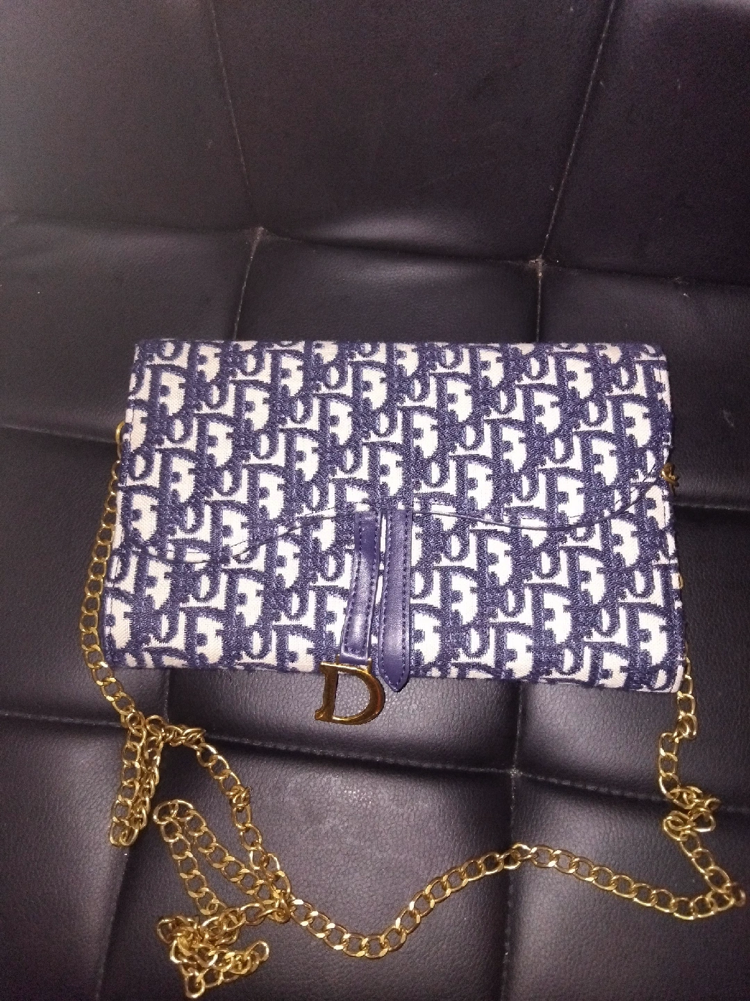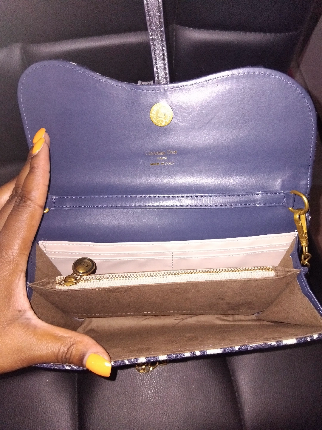 This is a Dior chain wallet in blue oblique embroidery. It's in great condition and features the iconic Dior design with a gold chain. Perfect for carrying your essentials in style! pick up only Woodbridge