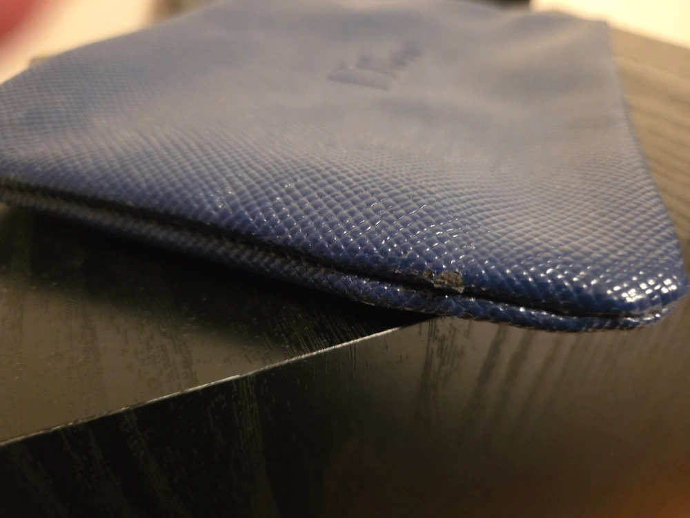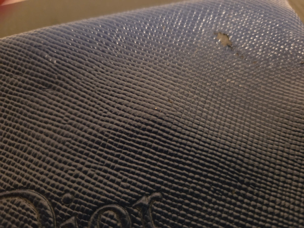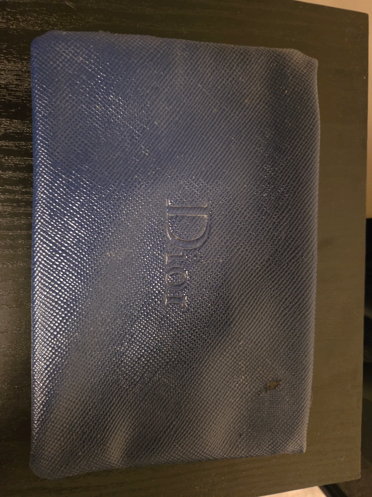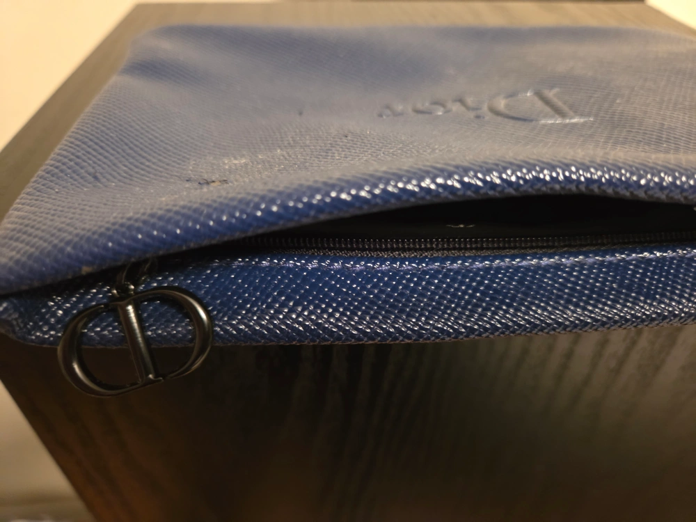 Selling a Dior pouch in blue. It has a textured finish and the Dior logo is embossed on the front. There are some signs of wear, as shown in the photos.