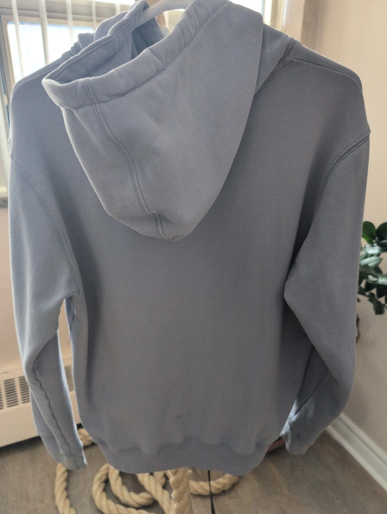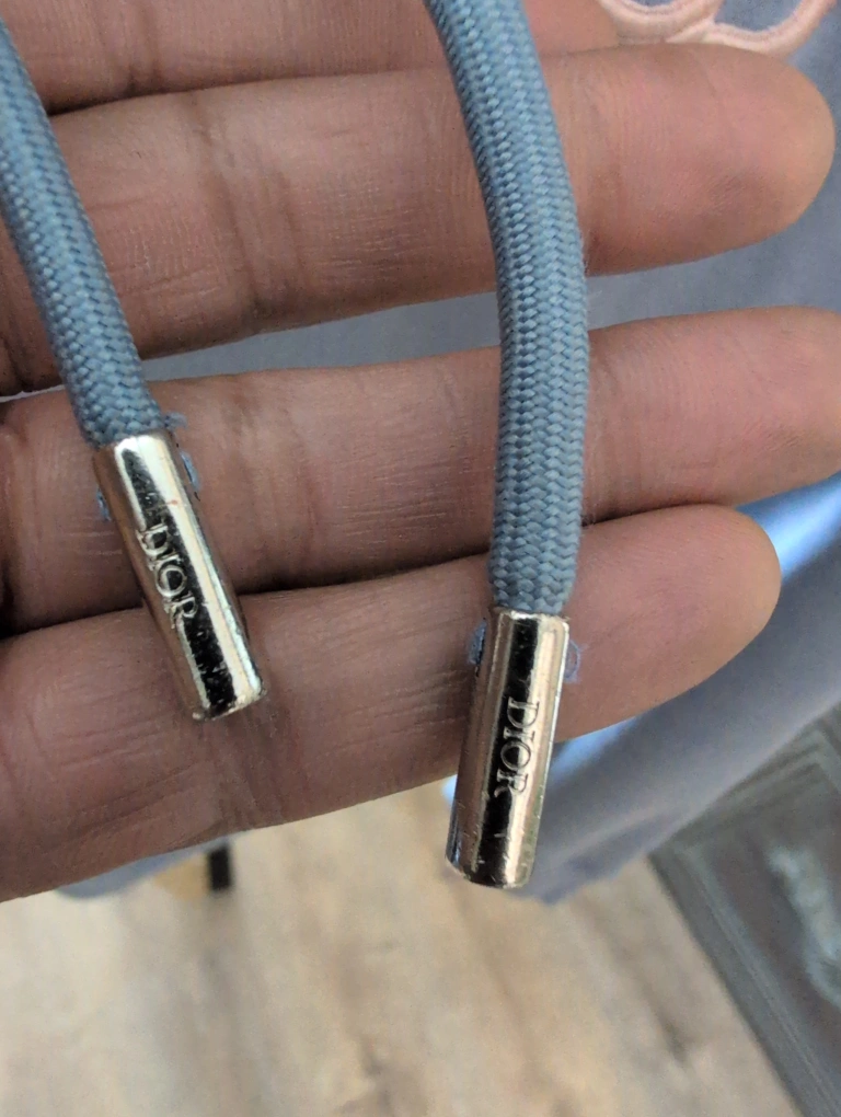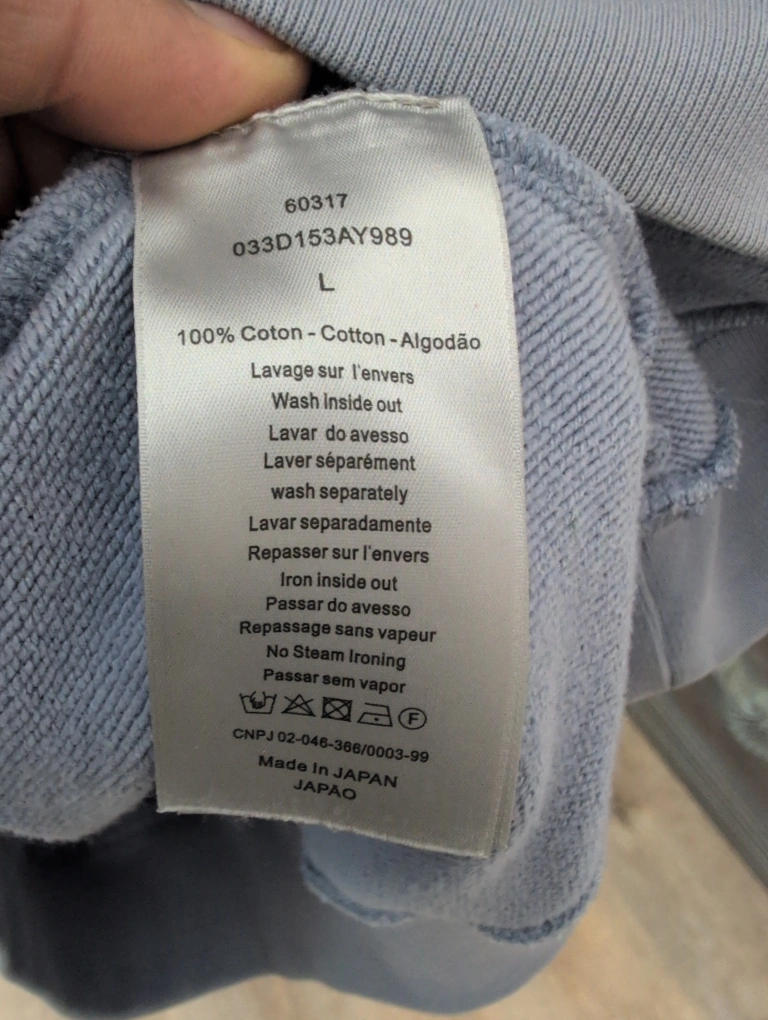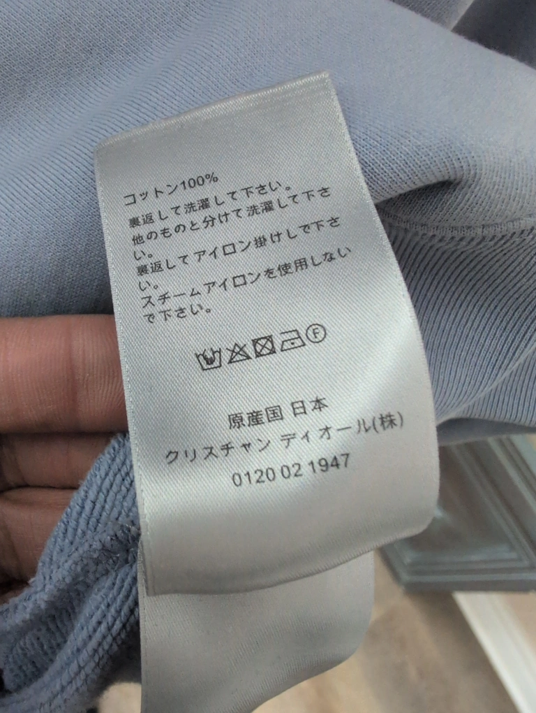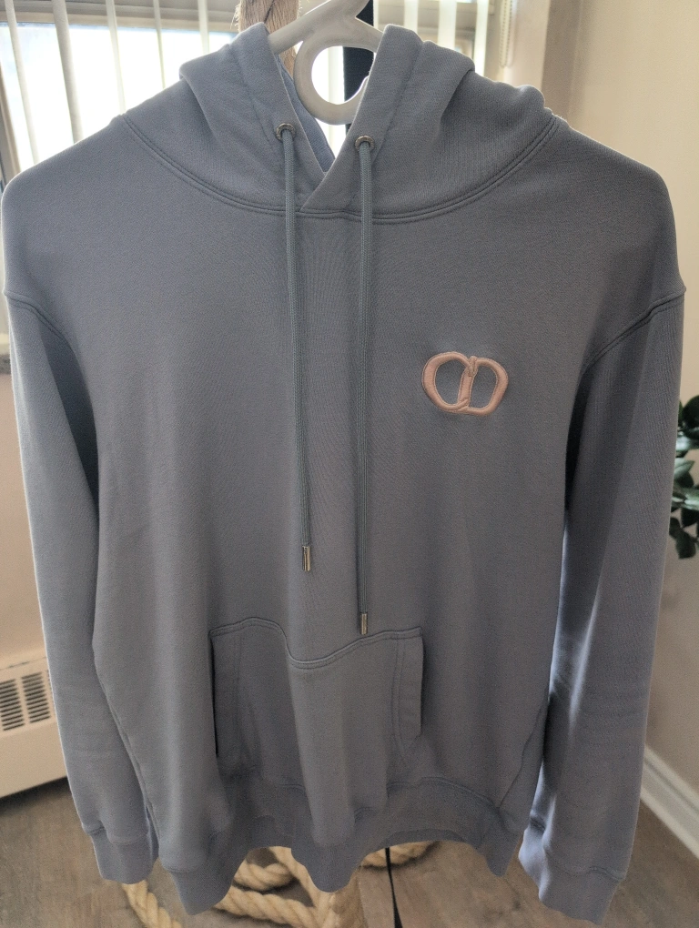 146Grey Dior hoodie. Size large. Made in Japan. 100% cotton. Features a small embroidered logo on the chest. Drawstrings have Dior branding.