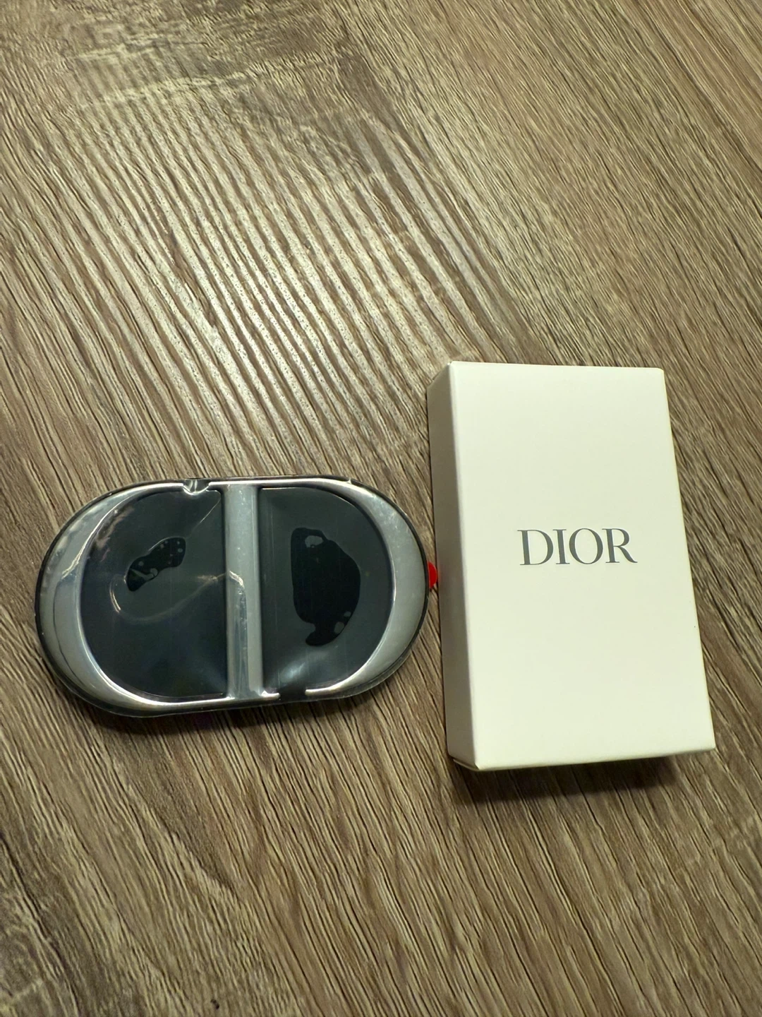 Selling a Dior phone ring with two mirrors. It is really helpful in doing quick make up touch ups. It can also be used as a cell phone grip as well as a stand. A new design from Dior.