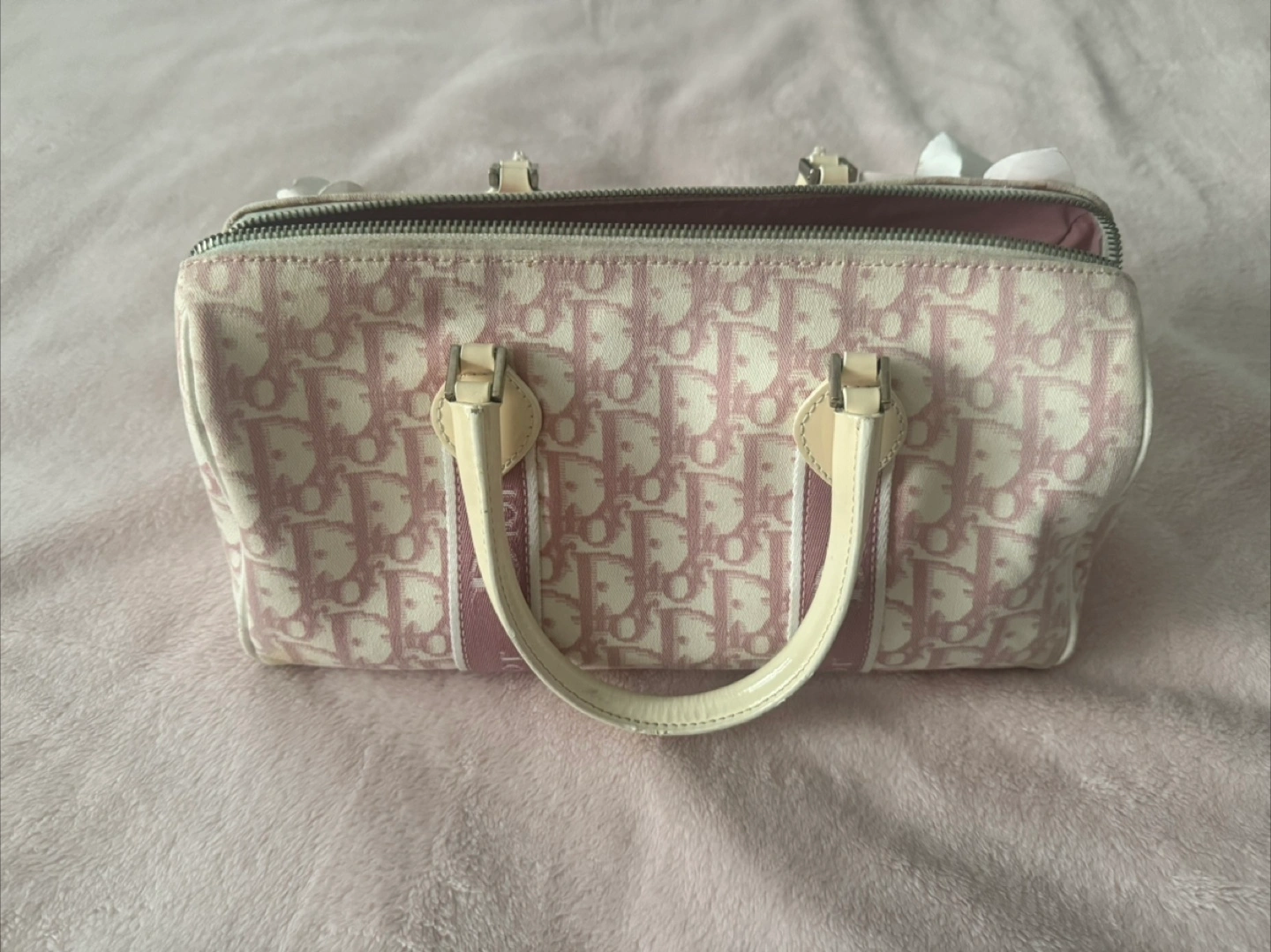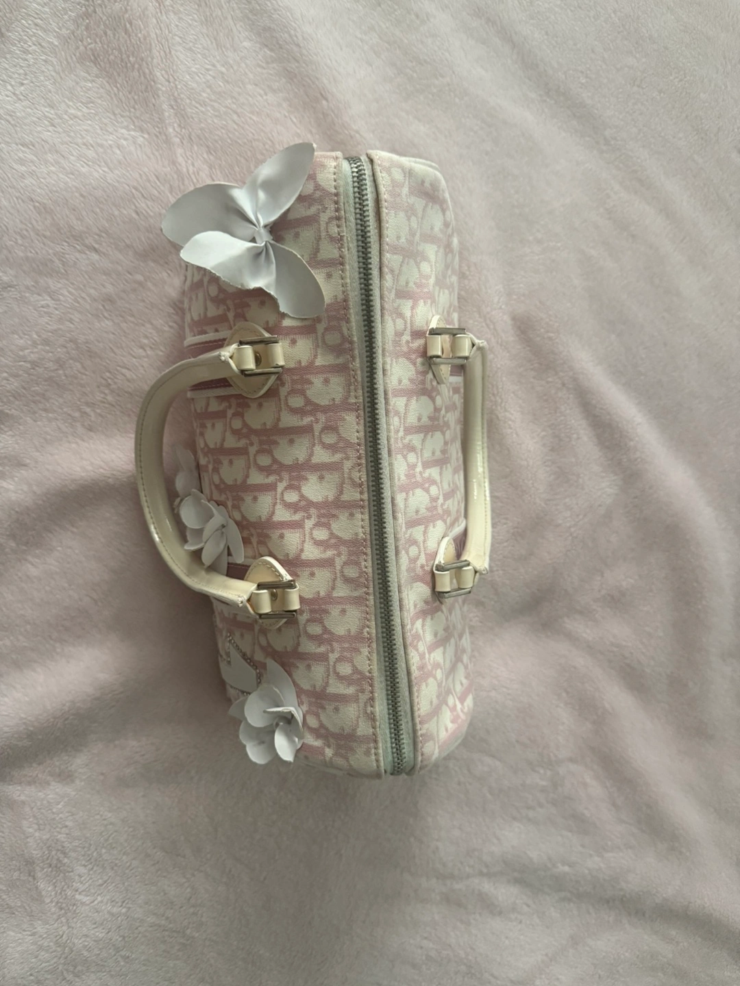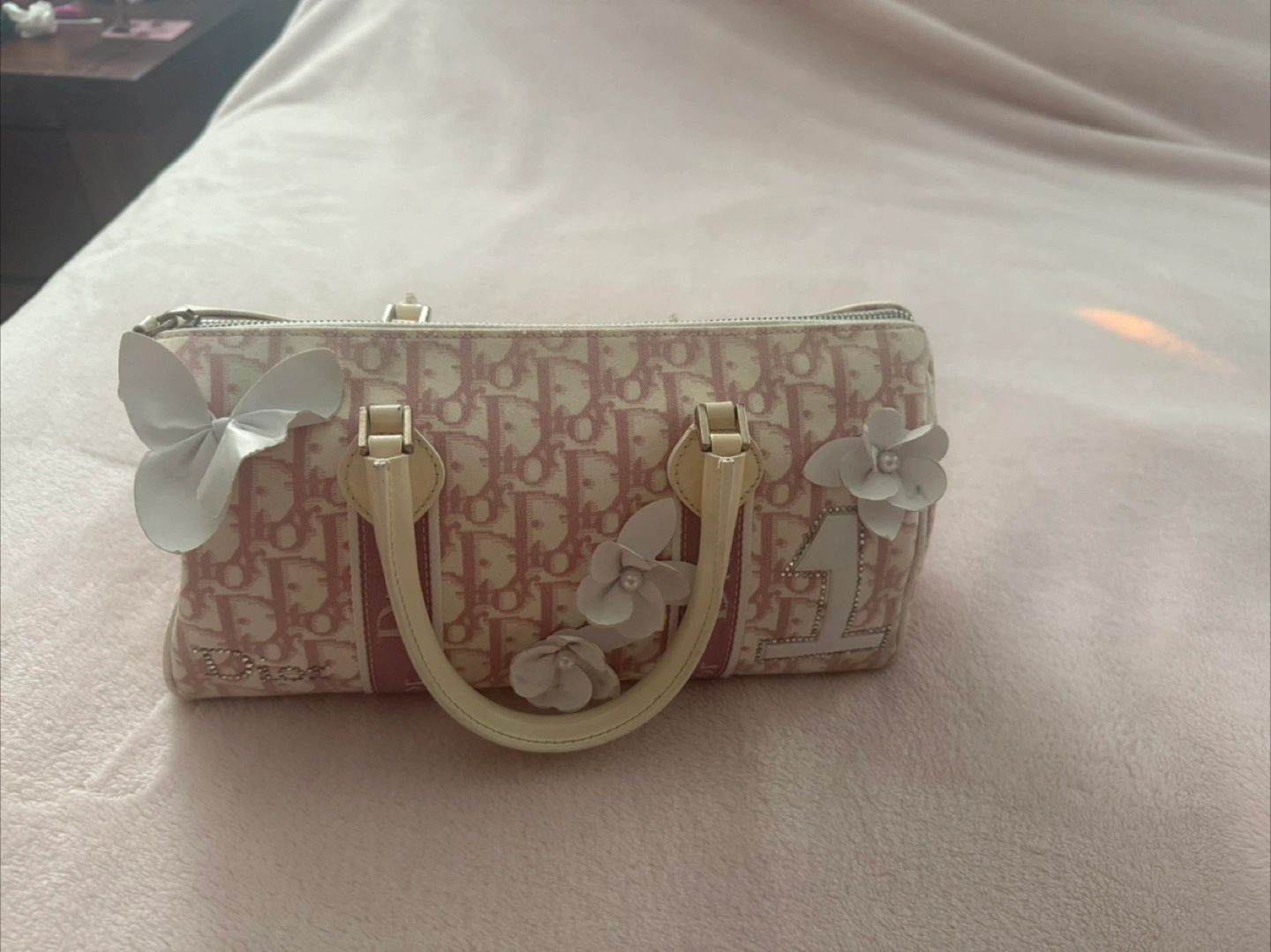 Selling a cute authentic Dior Mini Boston bag with the iconic Dior Oblique pattern in pink. It's adorned with lovely white flower details and the number '1' in rhinestones. Perfect for adding a touch of luxury to your outfit!