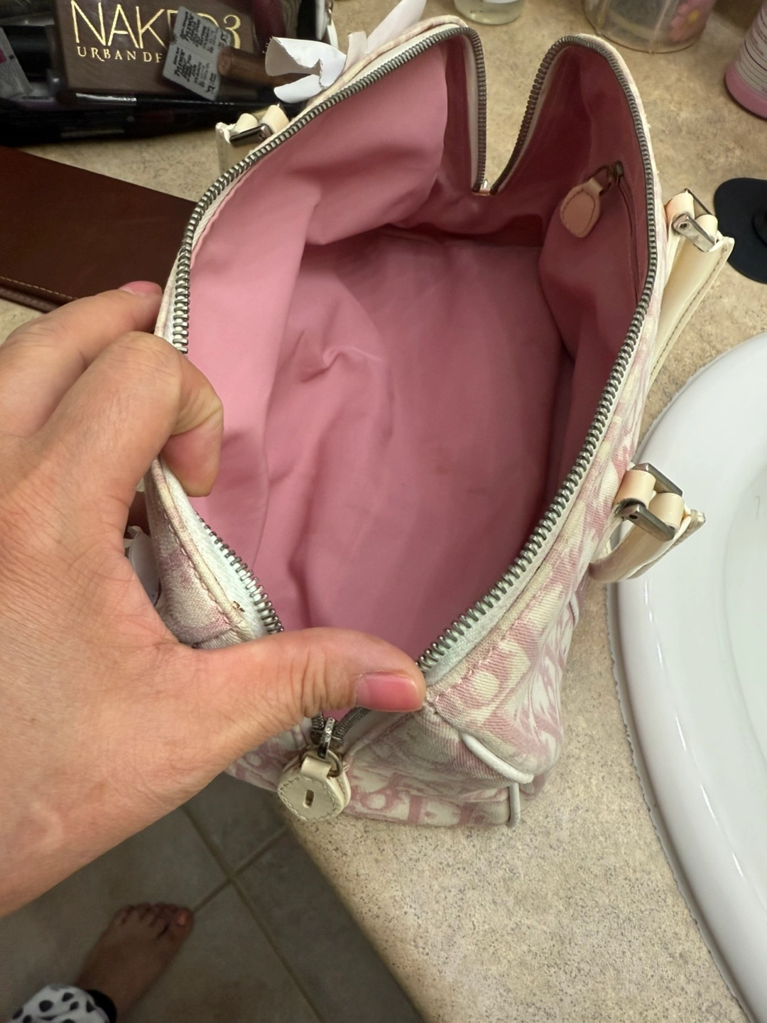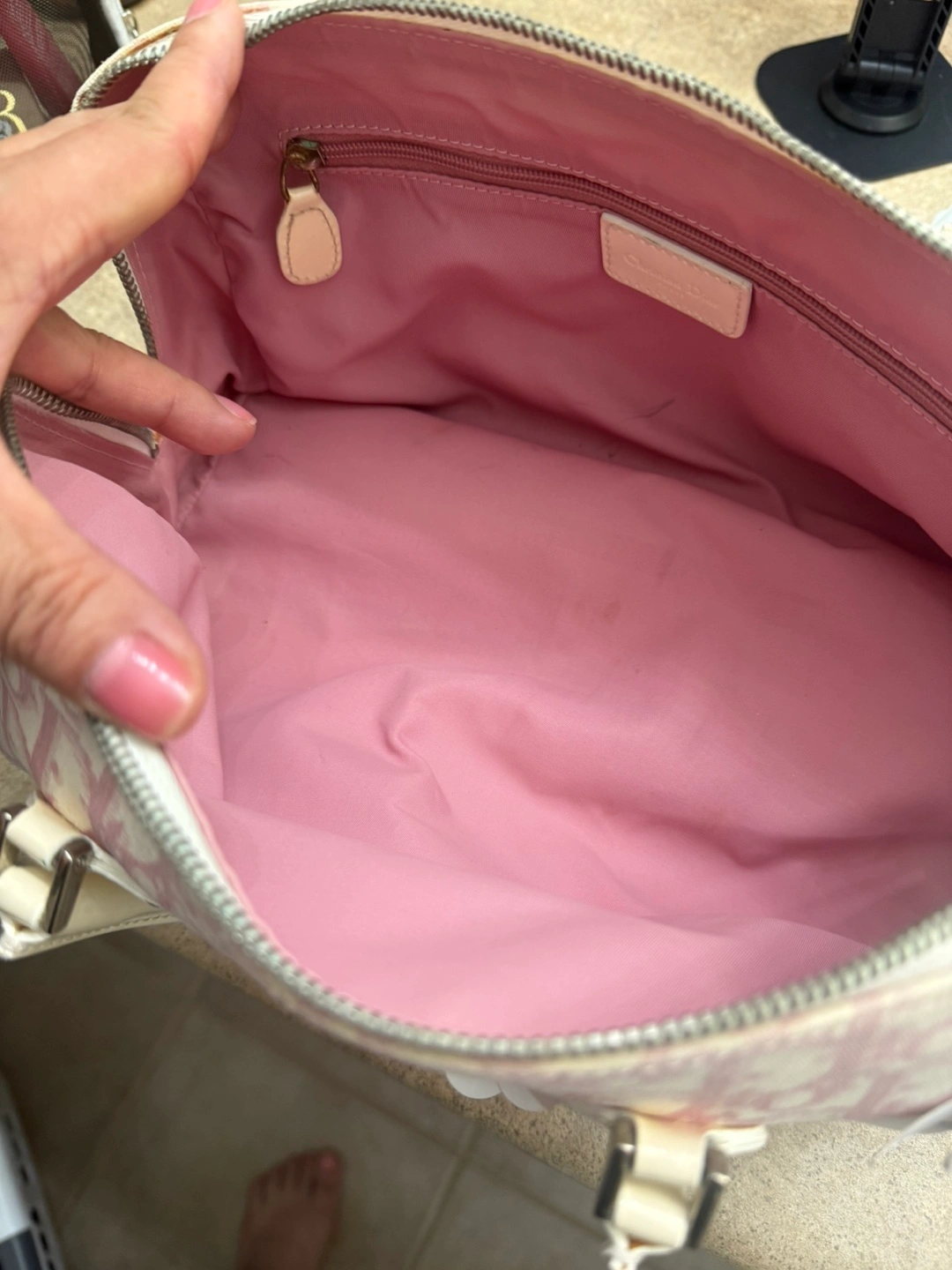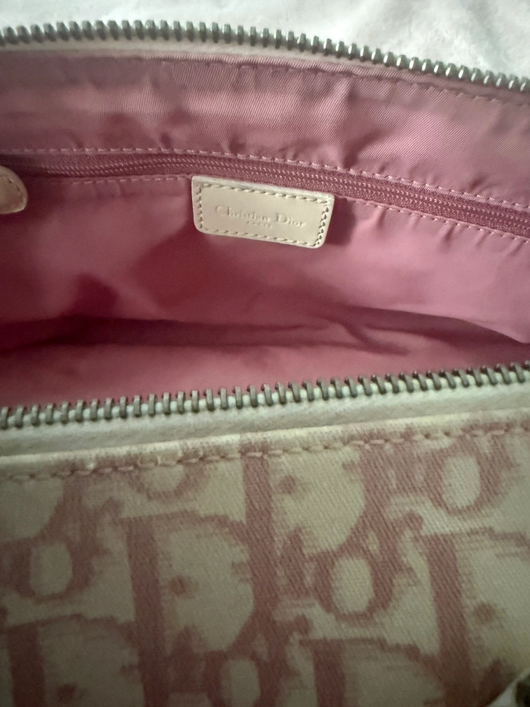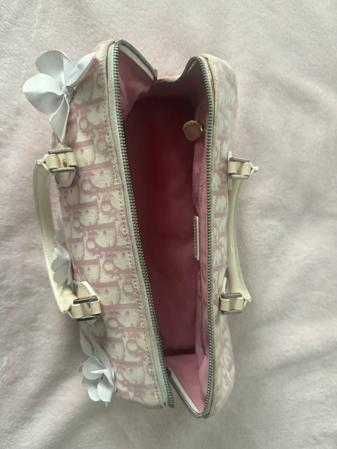 Selling a cute authentic Dior Mini Boston bag with the iconic Dior Oblique pattern in pink. It's adorned with lovely white flower details and the number '1' in rhinestones. Perfect for adding a touch of luxury to your outfit!