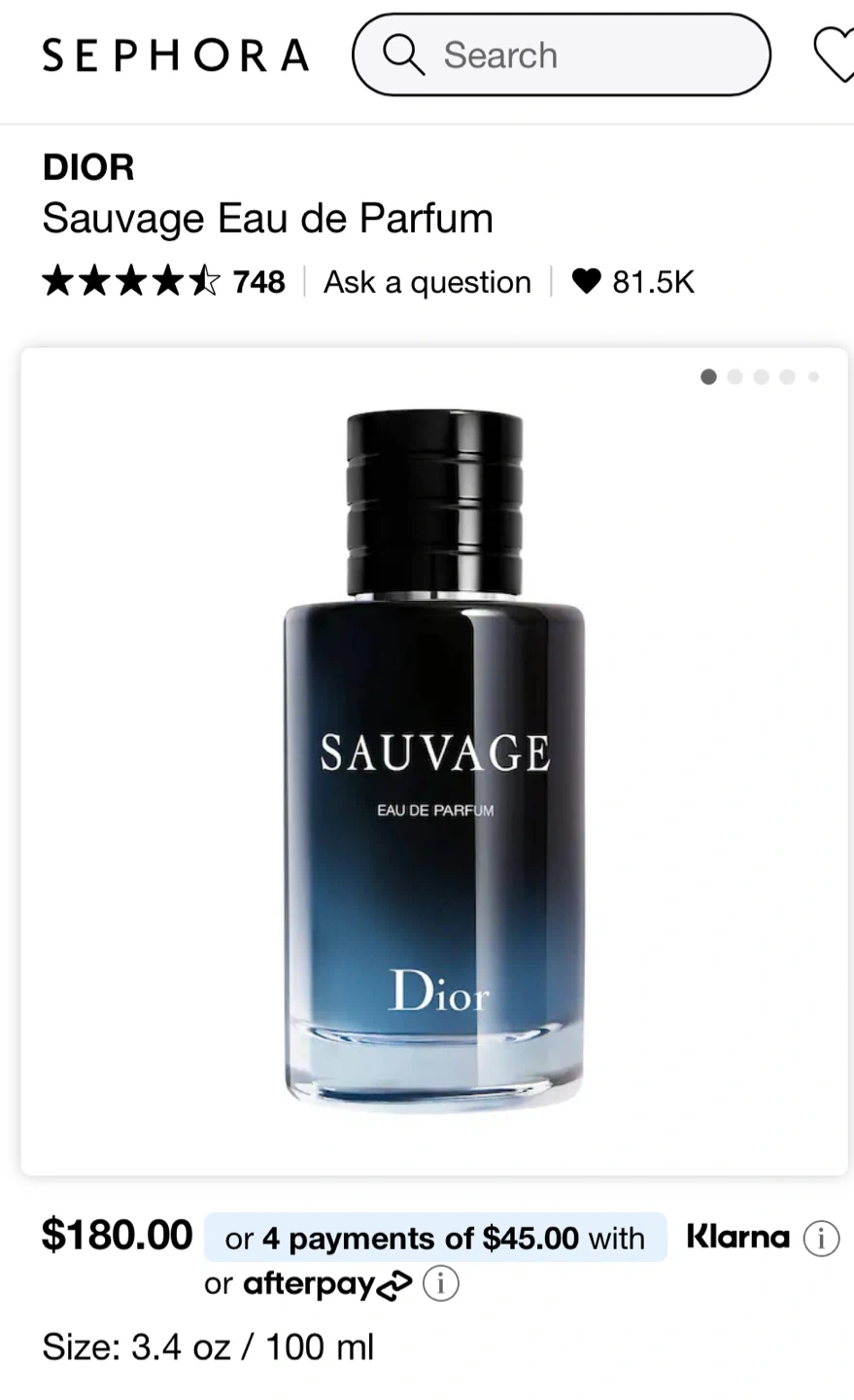 Retail $180 Selling a bottle of Dior Sauvage Eau de Parfum. It's a 100ml bottle and comes with the original box. The scent is a classic and very popular. Feel free to message me with any questions!