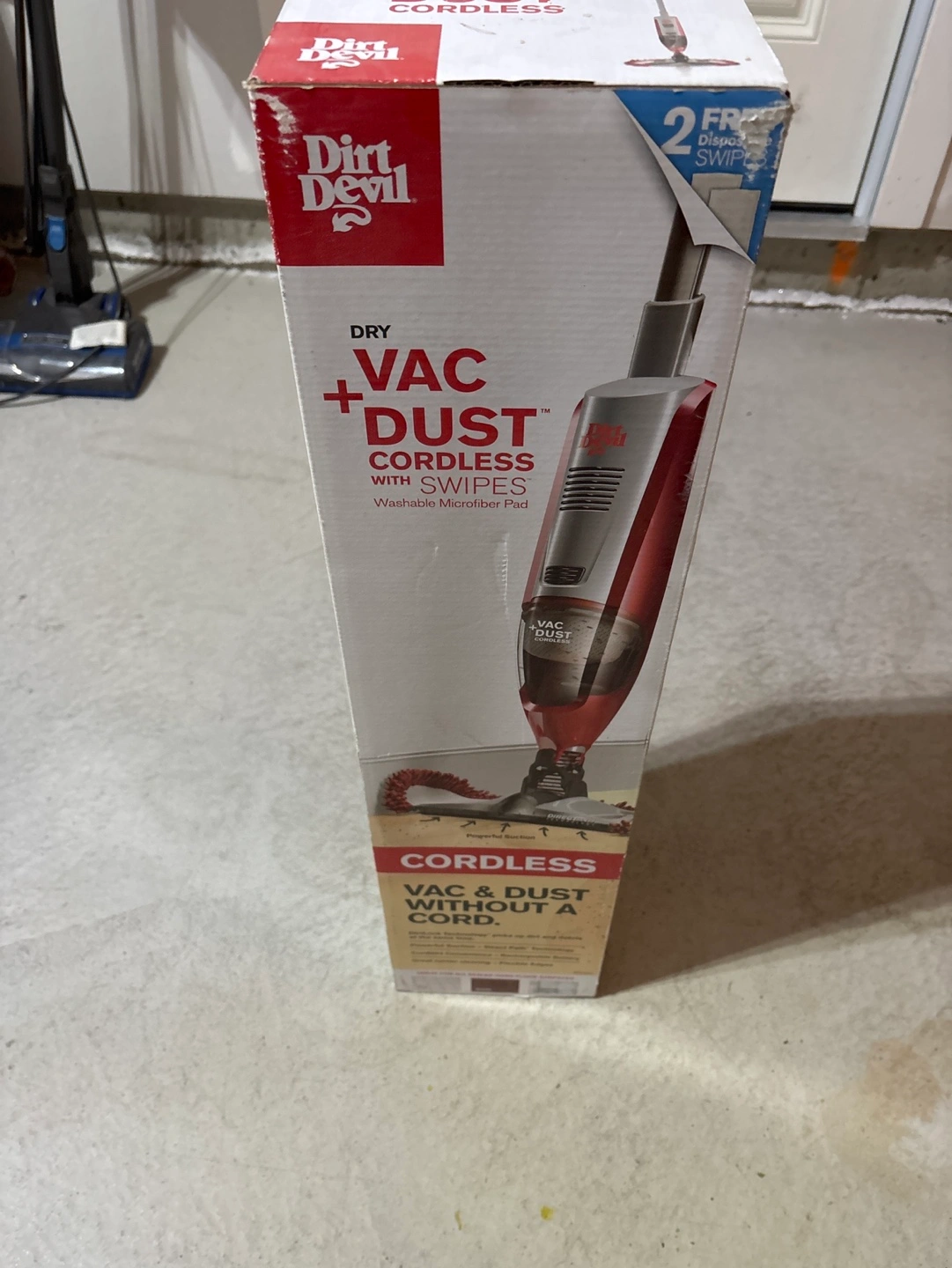Vacuum and dust sweeper with washable microfiber pad. Cordless