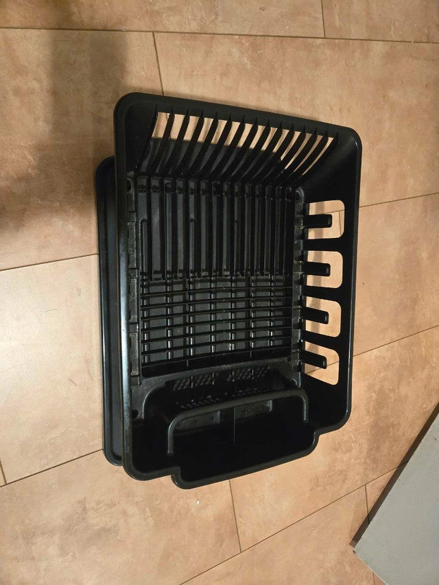 Keep your kitchen tidy with this black plastic dish rack, perfect for air-drying dishes after washing. It is in used condition, ready to help organize your sink area. * Durable plastic construction * Compact design * Includes a tray to collect water This dish rack is looking for a new home! If you're seeing this ad, yes, it's still available!