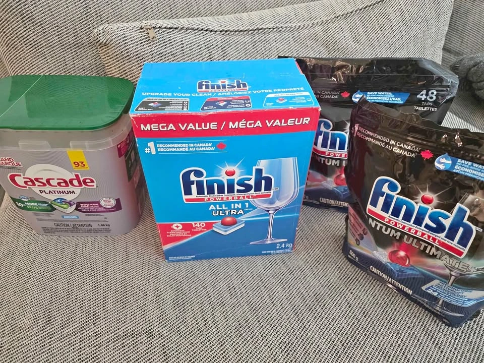 Cascade Platinum (34 left from the original 93 ct pack) - $10 Finish Quantum Ultimate (new, 48 pods) - $15 Finish Quantum Ultimate (opened, 38 pods) - $10 Finish All-in-1 Ultra (140 pack, opened but almost full) - $25 Take everything together for $50 Selling because I no longer use a dishwasher. Pickup only.