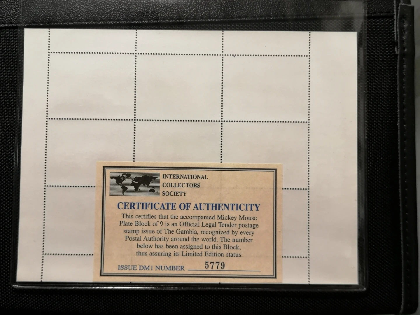 1 sheet of 9 joined stamps representing the evolution of Disney's Mickey Mouse through the years. - Issued by Gambia - Legal tender - ICS Certificate of authenticity = 5779 - Clear protective sheath - Newspaper article cutout photocopy - Stamp dimensions = 2" x 1.5" - 9 Stamp set (1 sheet) - From June 1999 - Years Represented: Individual stamps within the sheet depict Mickey from specific years: 1928, 1931, 1936, 1947, 1955, 1940, 1960, 1976 + 1988. - Theme: The sheet showcases Mickey Mouse in different iconic roles and styles throughout his history, including his appearance, as the Sorcerer's Apprentice in Fantasia, and in more contemporary styles. - Pickup in Ranchlands in NW Calgary. - Shipping is an option if you desire.