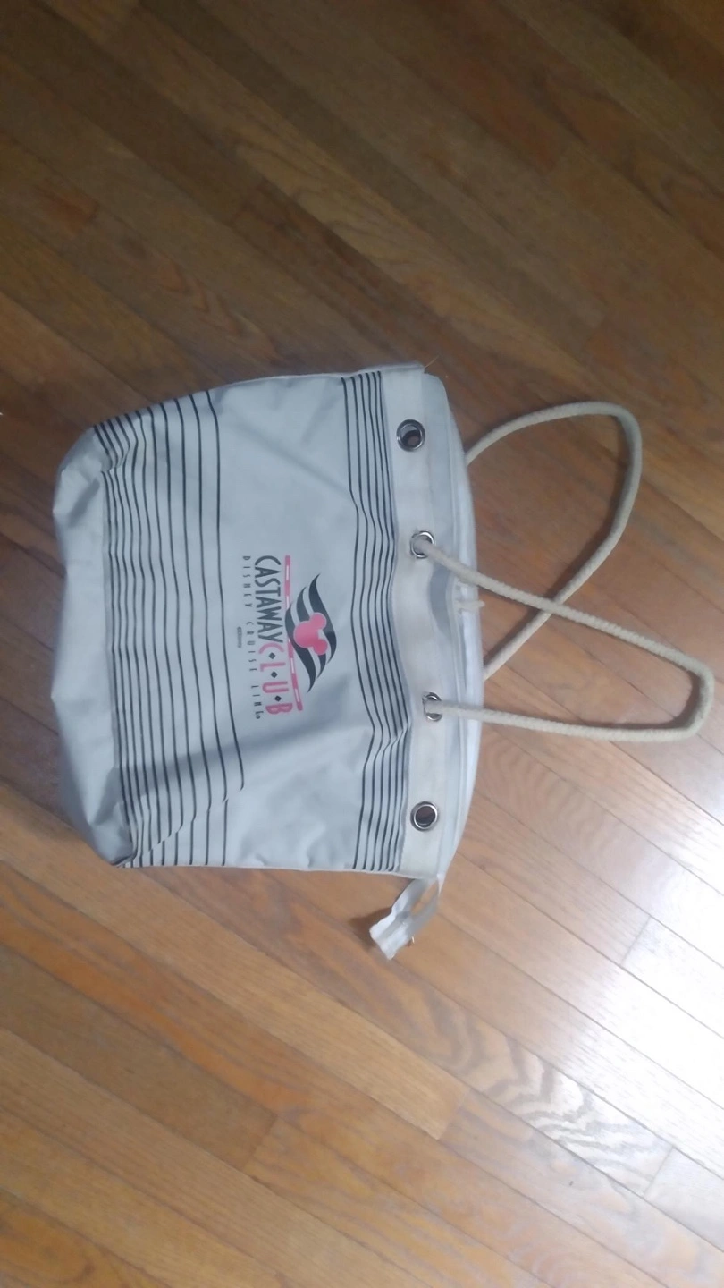 Selling a Disney Castaway Club tote bag! It's in ok condition and perfect for carrying your essentials. The bag features a white base with black stripes and the Castaway Club logo. It has rope handles and is a great souvenir from a Disney cruise