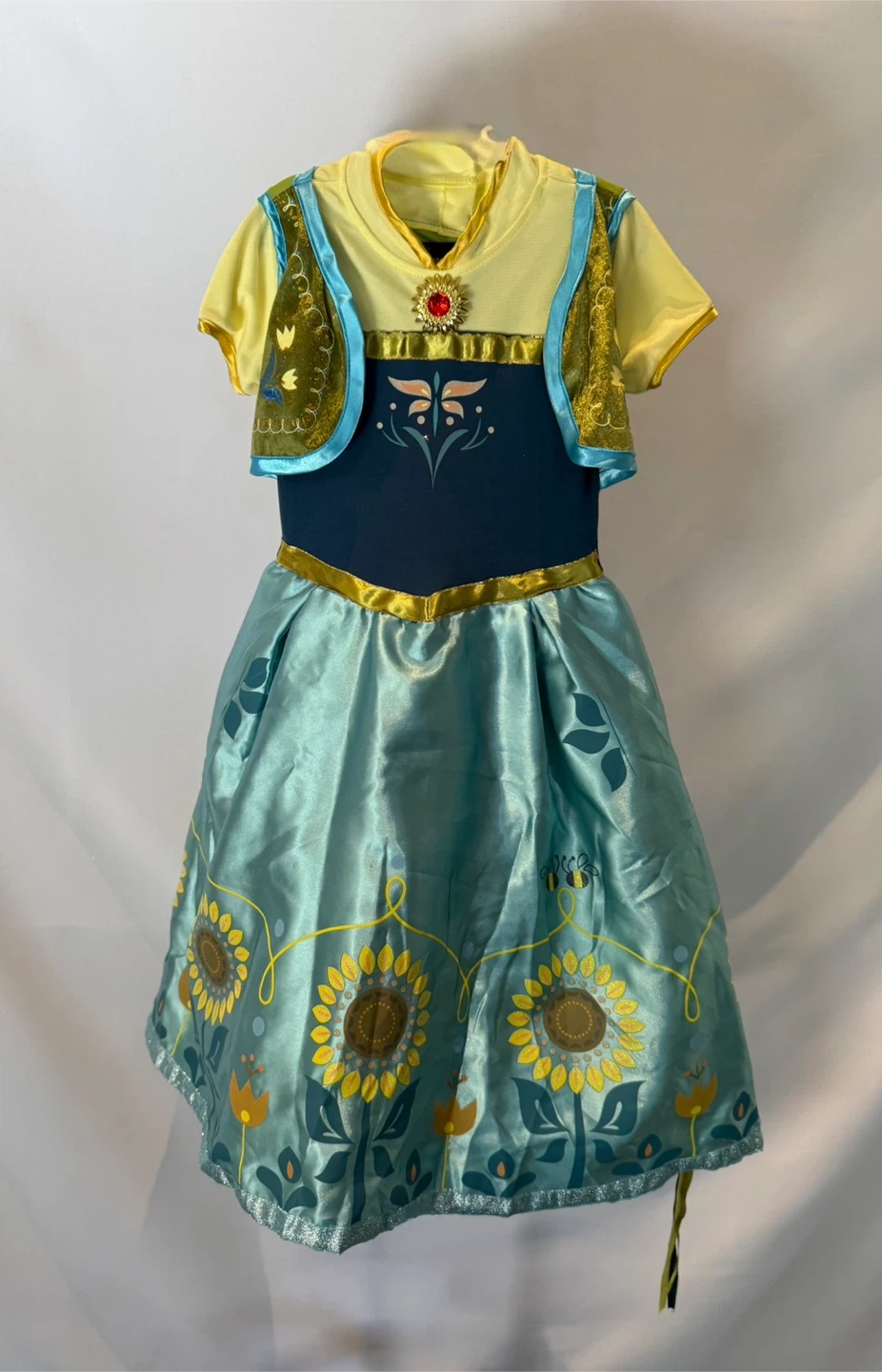 This is an Anna costume dress from Disney's Frozen 2. It features a yellow top with attached vest, and a blue skirt with sunflower designs. Perfect for dress-up or Halloween! In pristine condition, Comes from a smoke and pet- free home Size 6 to 8 yrs old