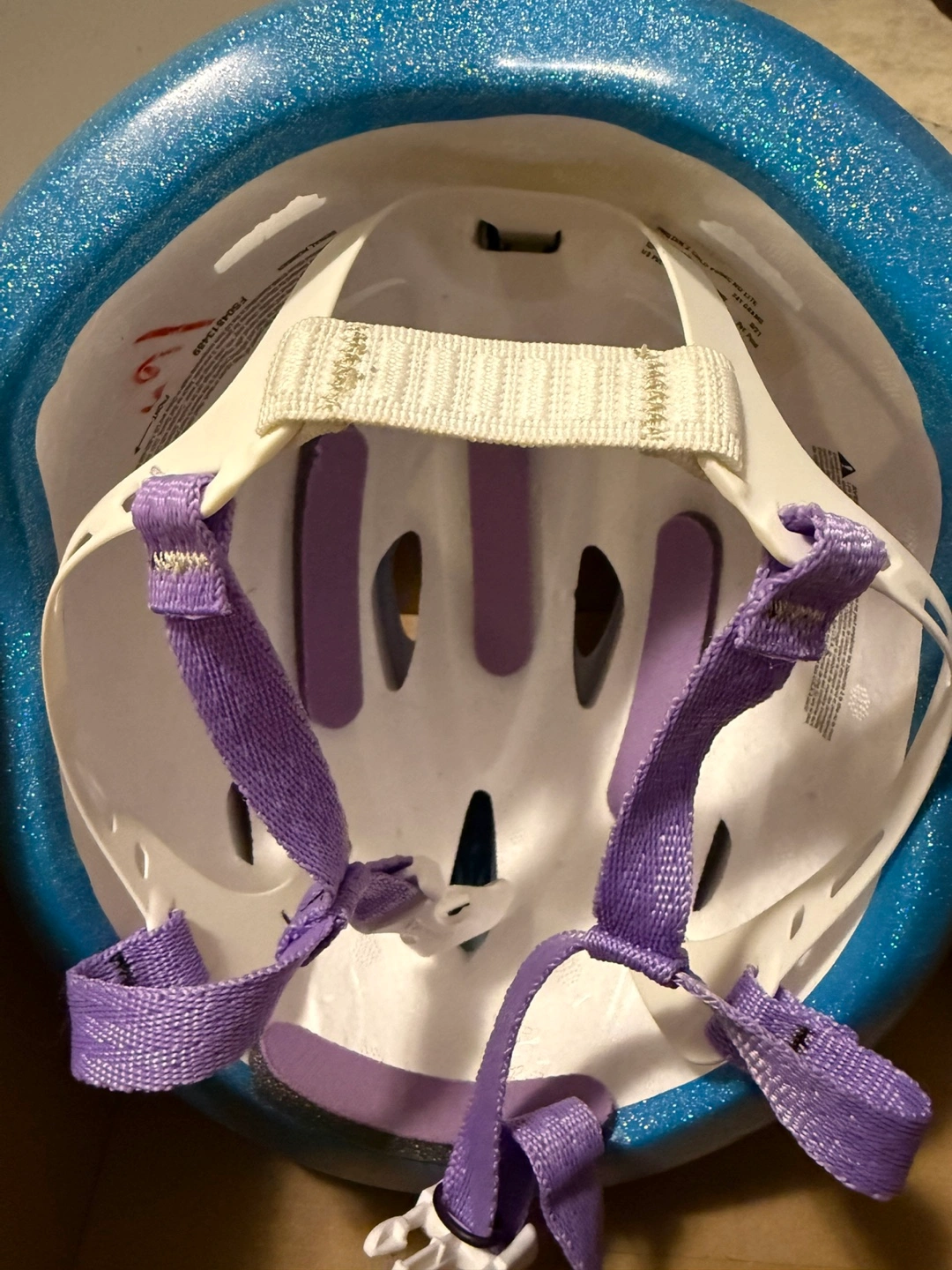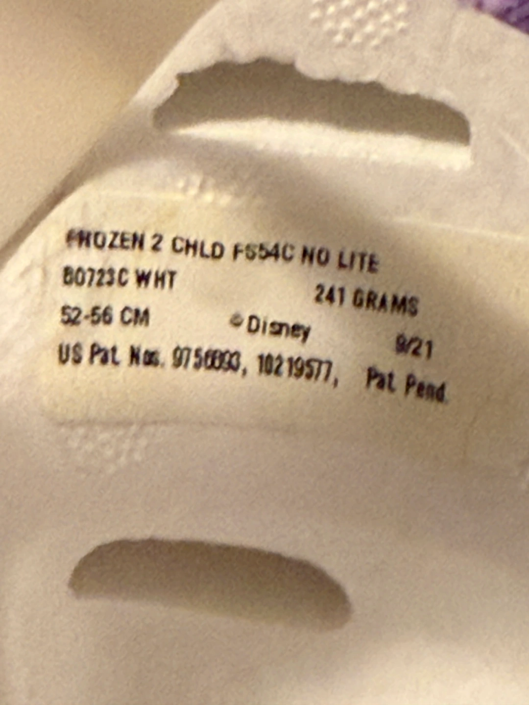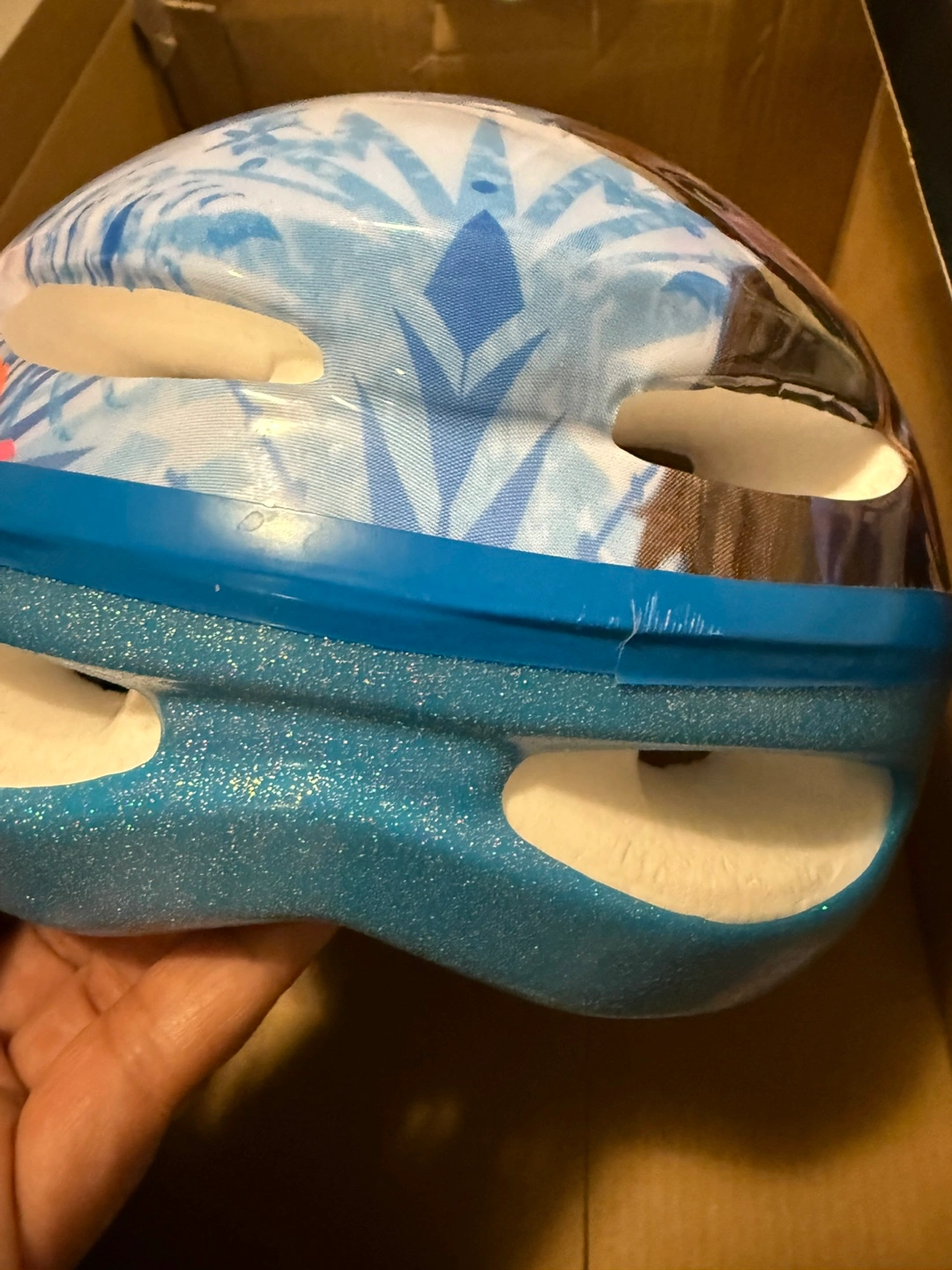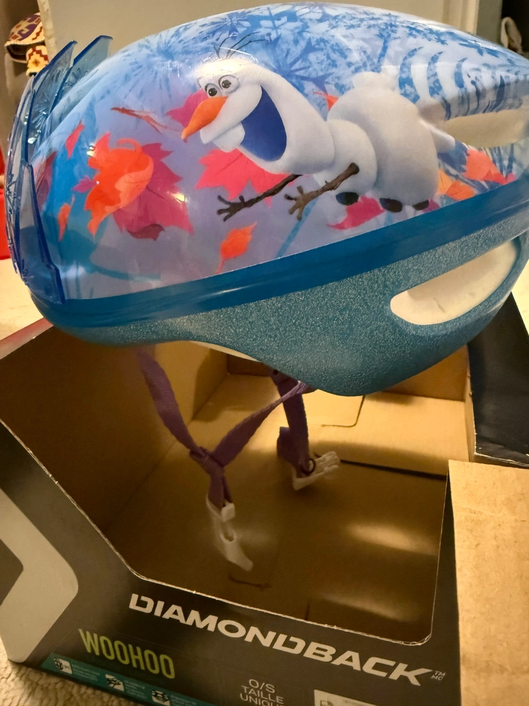 Selling a Disney Frozen 2 child's bike helmet. It fits head sizes 52-56 cm. The helmet features a Frozen 2 design and has a white and blue colour scheme. It's in great condition and ready for a new home!