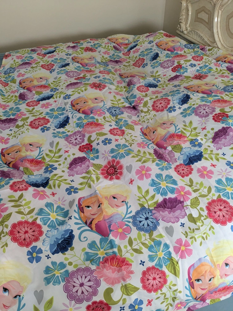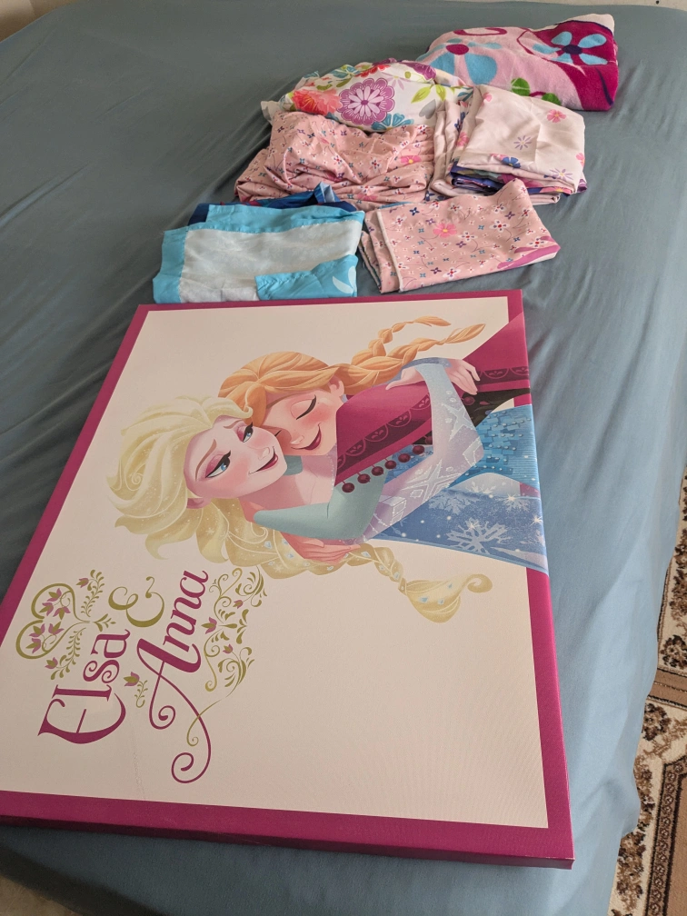 Selling a Disney Frozen bedding set featuring Elsa and Anna! Includes a comforter, fitted sheet, flat sheet, and pillowcases. Perfect for any Frozen fan's bedroom also, includes window curtains, shower curtain and wall art Good condition Smoke and pet free home Pick up ajax westney and Kingston major intersection CASH TRANSACTION ONLY Fastest pick up preferred...No holds more than 24 hours please.