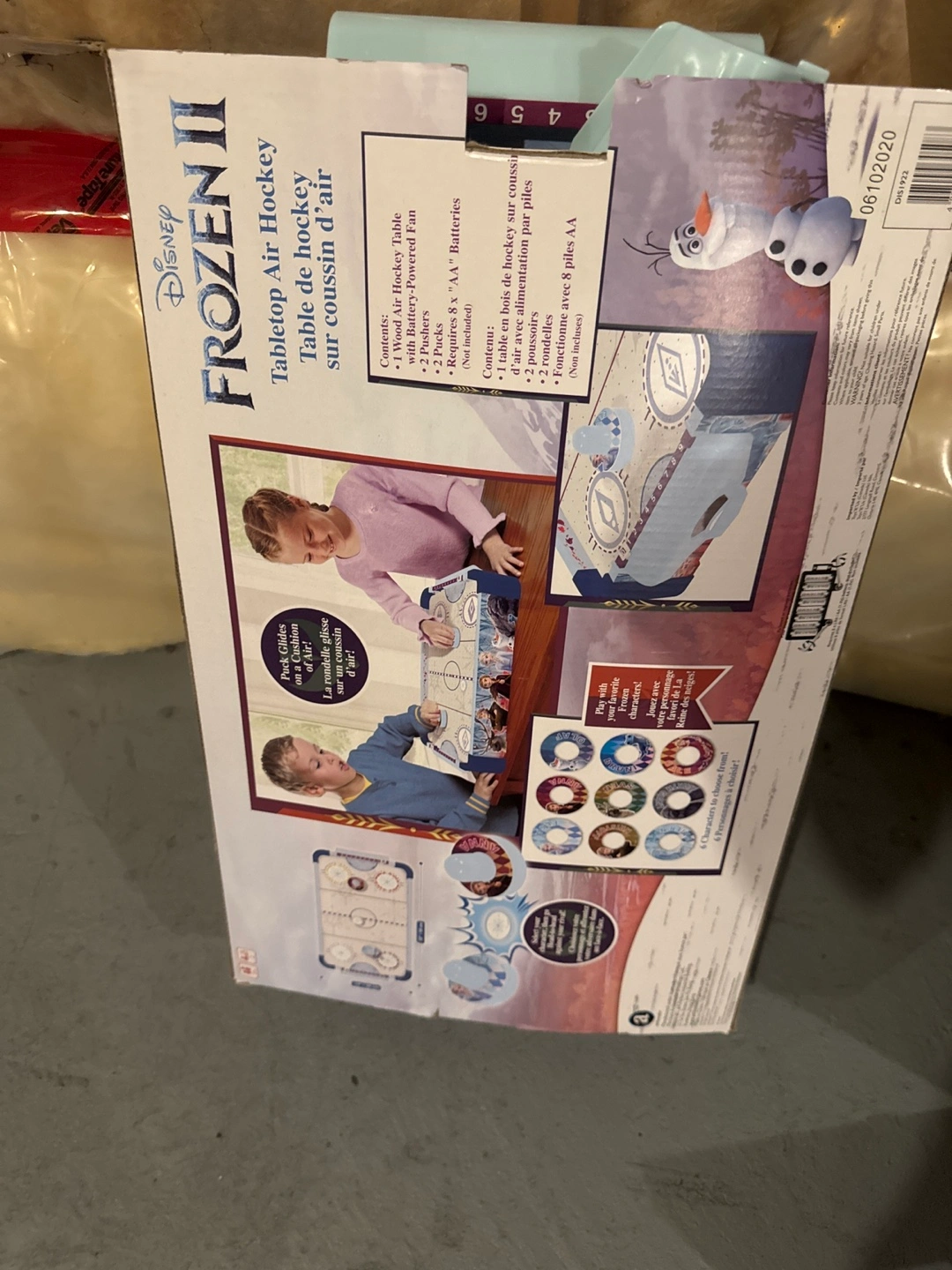 Get ready for some fun with this Disney Frozen II Tabletop Air Hockey game! It comes with: - 1 Wood Air Hockey Table with Battery-Powered Fan - 2 Pushers - 2 Pucks Requires 8 x "AA" Batteries (Not included)
