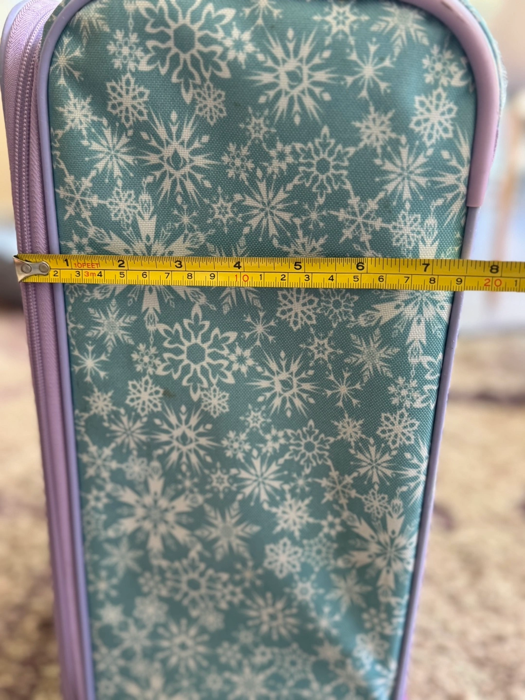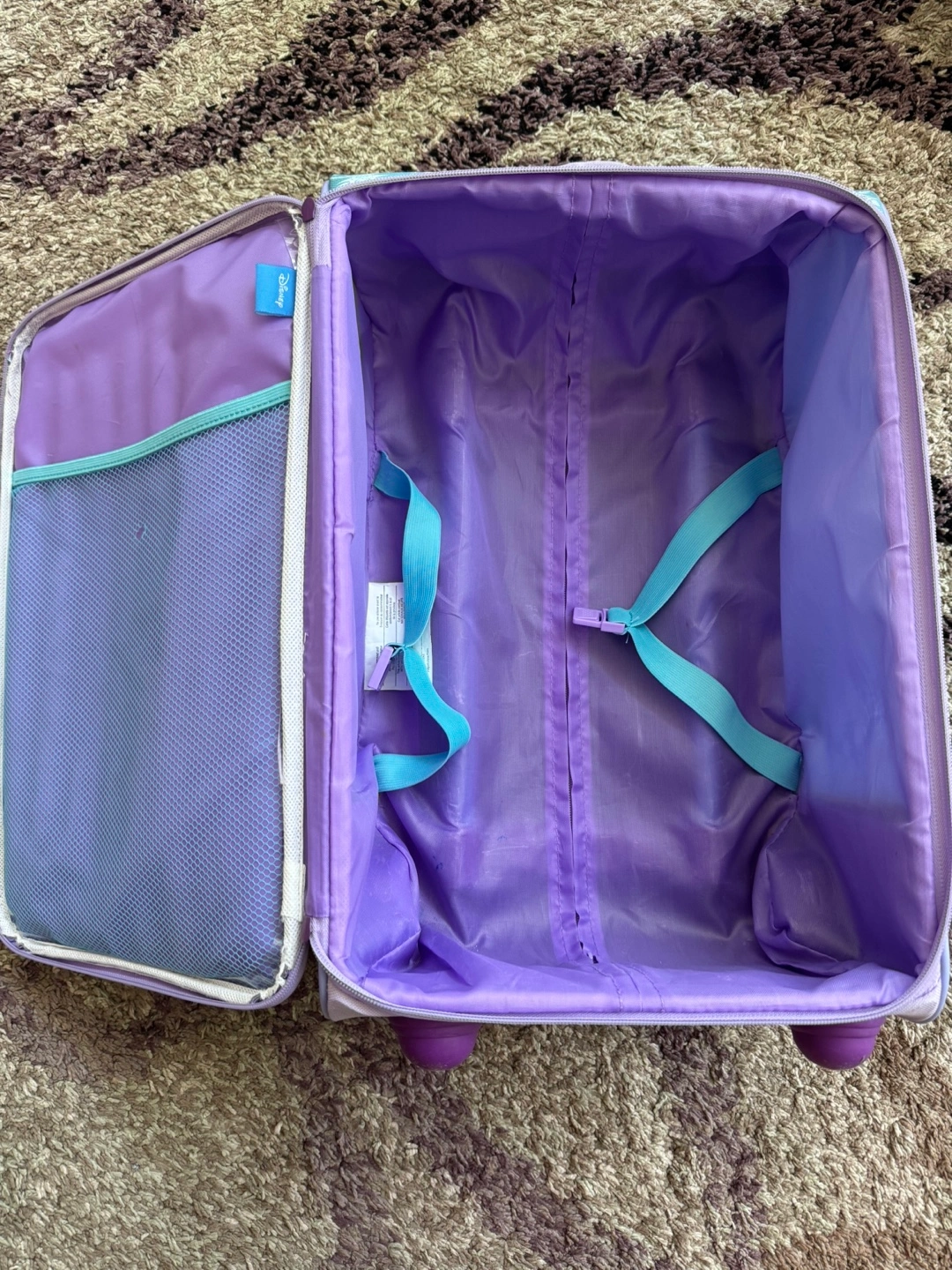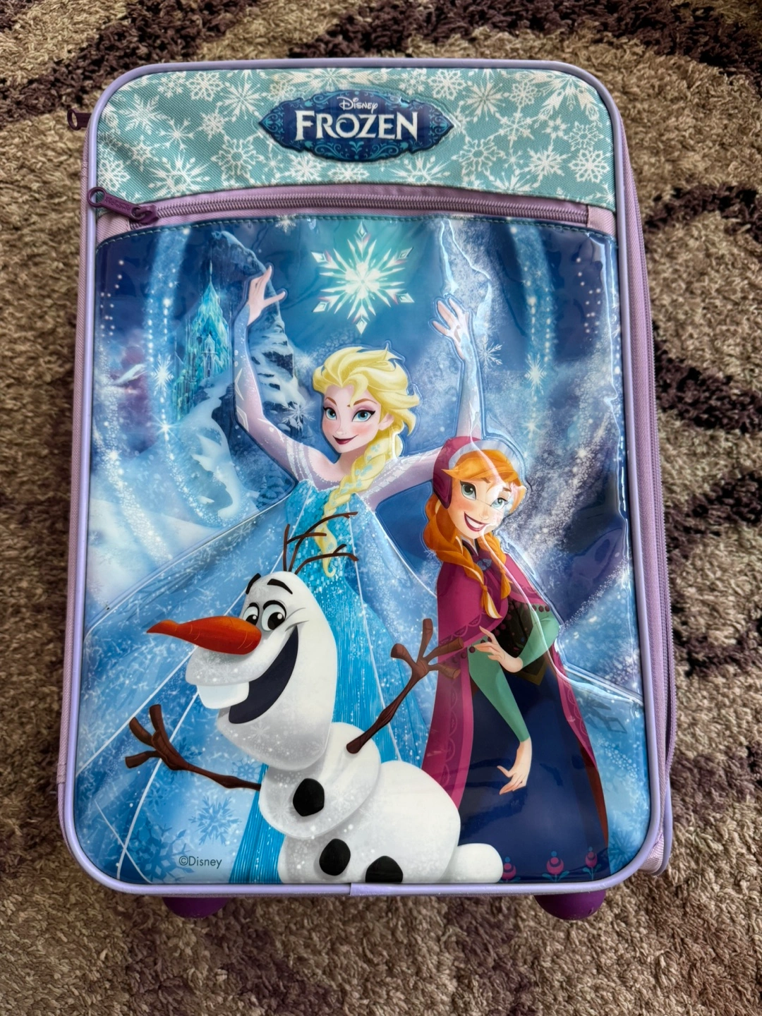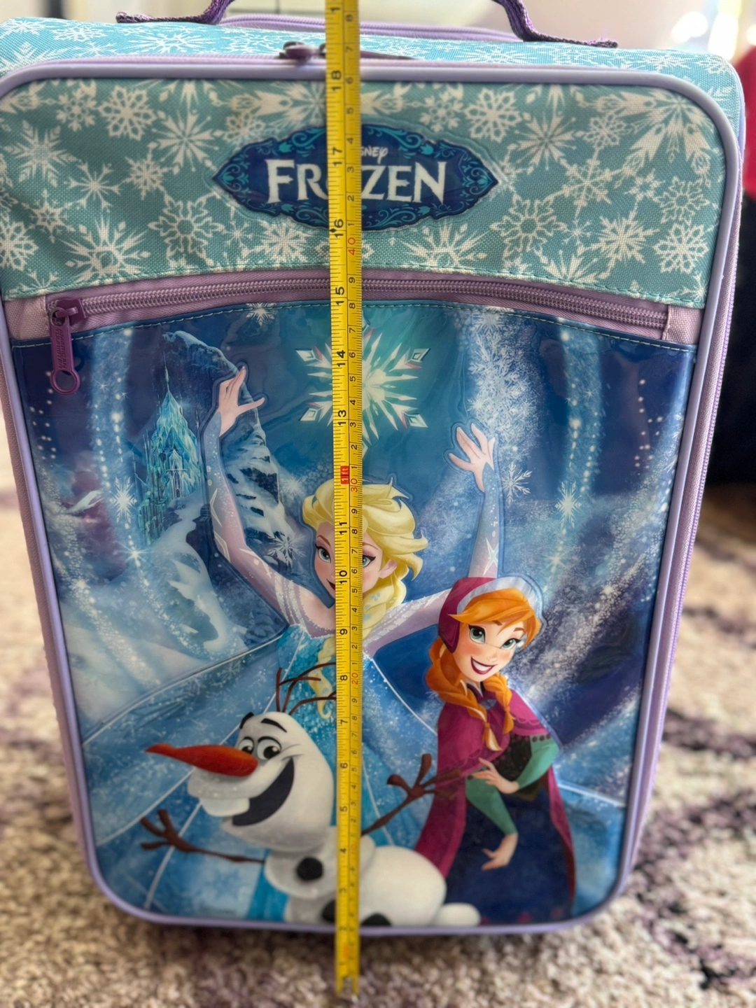 This is a cute Disney Frozen rolling luggage for kids. It's in great shape and ready for your little one's next adventure! The luggage features Elsa, Anna, and Olaf on the front. It measures approximately 18 inches in height and 7 inches in width. Smoke free pet free home. Pick up Avenue Road/Lawrence Ave