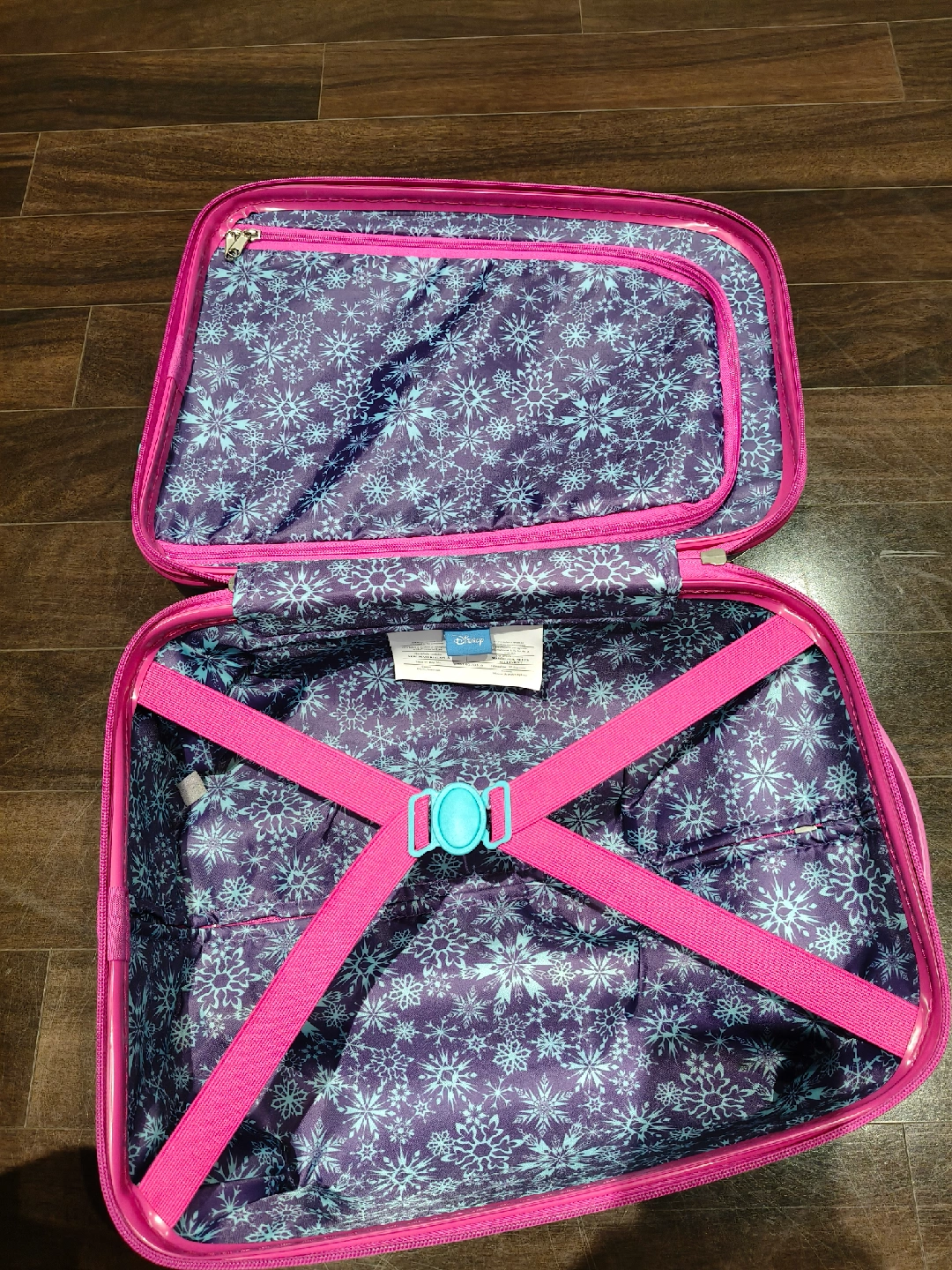 This is a super cute Frozen-themed rolling luggage, perfect for little travellers! It features Anna and Elsa on the front. The inside has a fun snowflake pattern and pink straps to keep everything in place