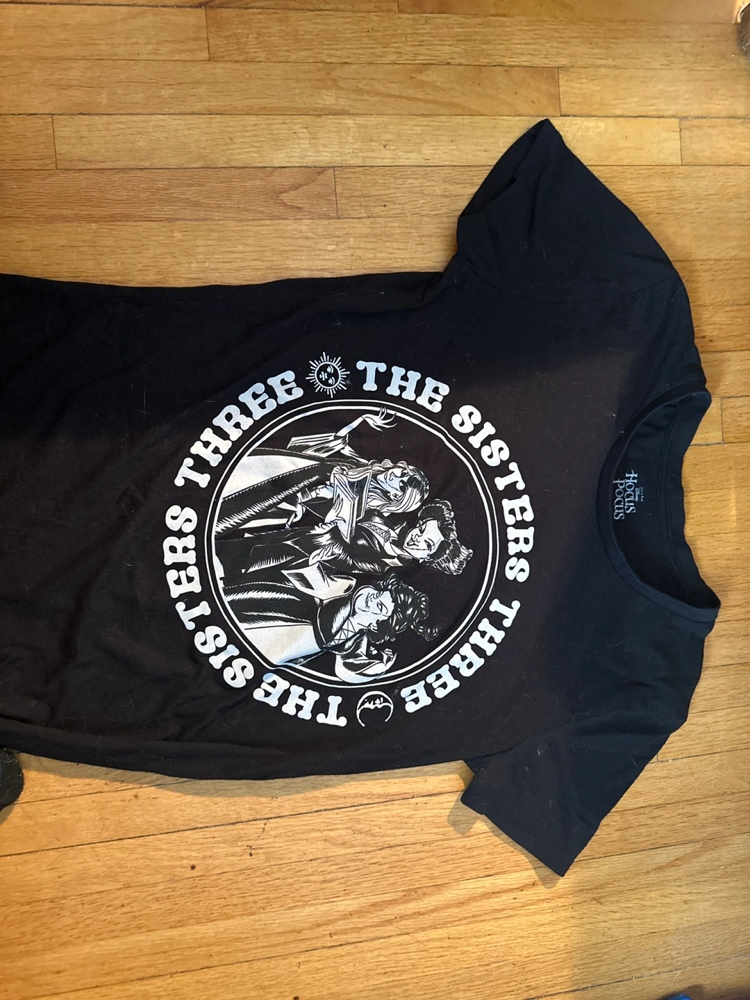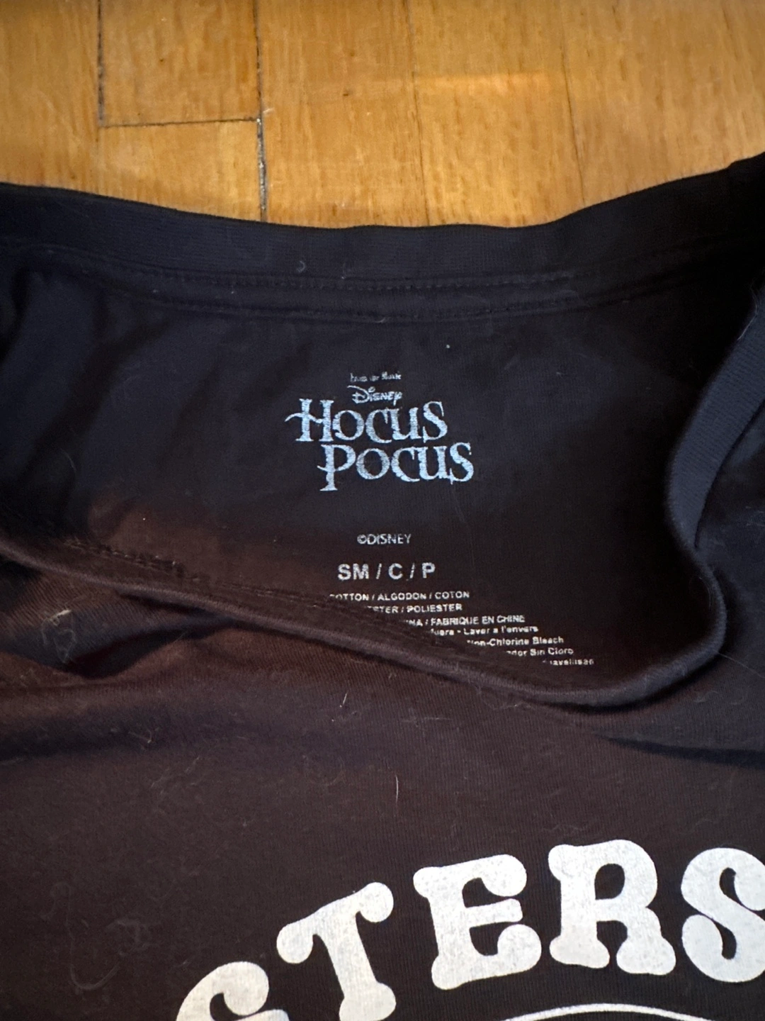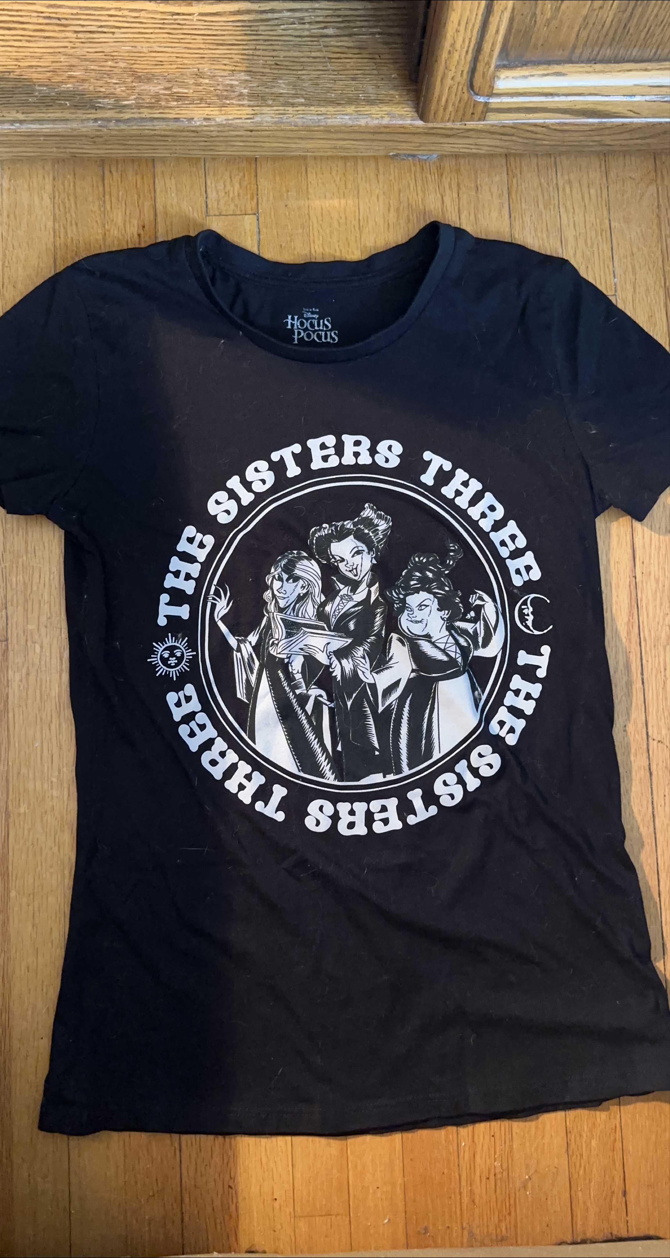 Selling a Disney Hocus Pocus t-shirt featuring 'The Sisters Three'! It's a black tee in size small (S). The material is a cotton/polyester blend, making it comfy and durable. Perfect for any Hocus Pocus fan!