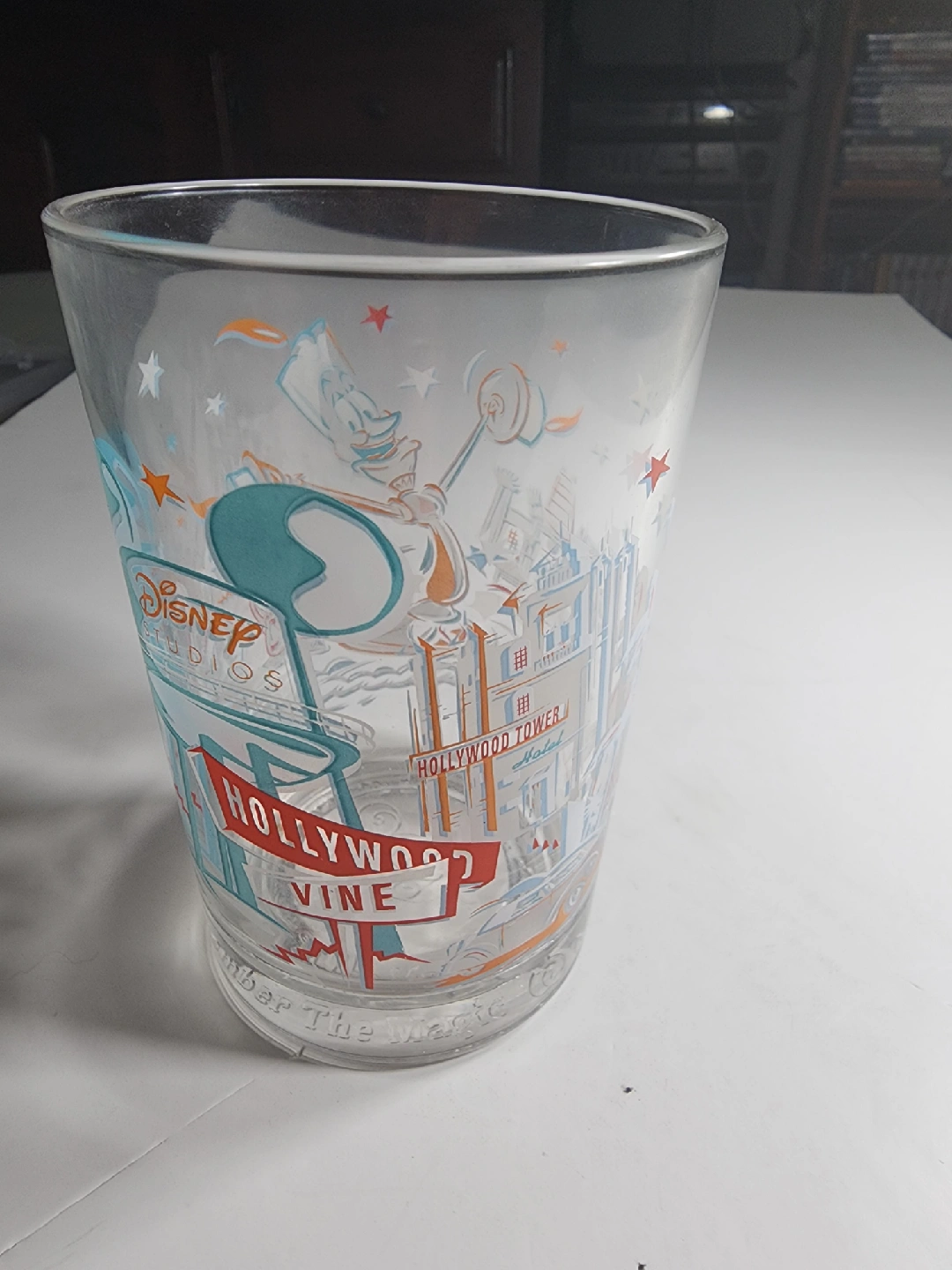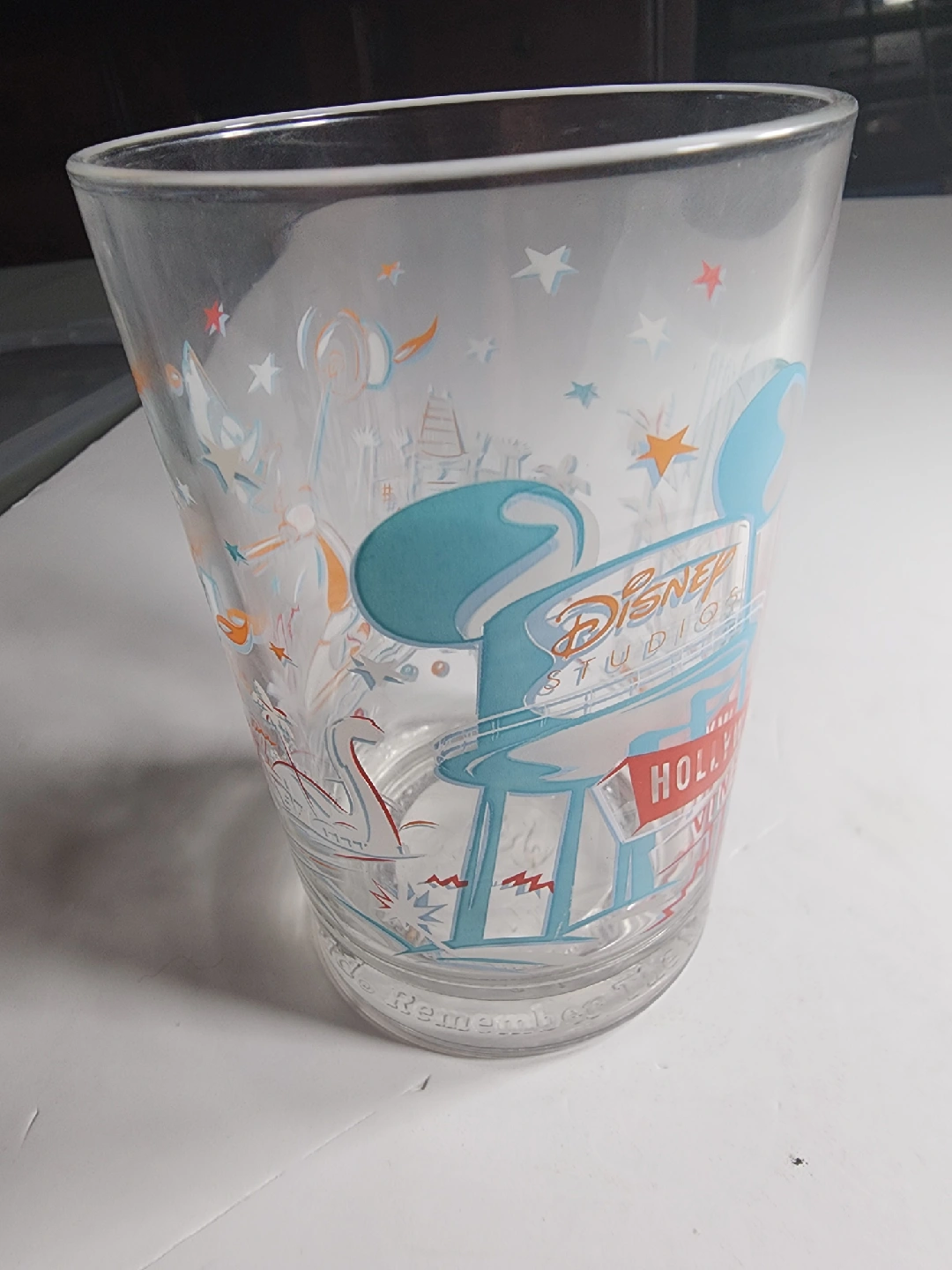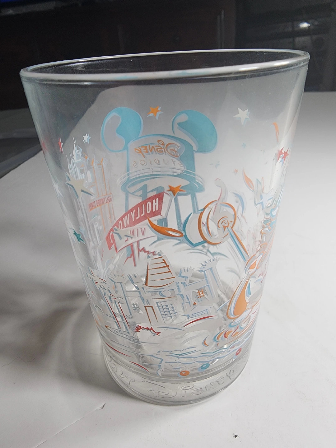 Selling a Disney Hollywood Studios glass. It features images of the Hollywood Tower Hotel, the Hollywood Vine restaurant, and other Disney characters and landmarks from the park. Perfect for any Disney collector!
