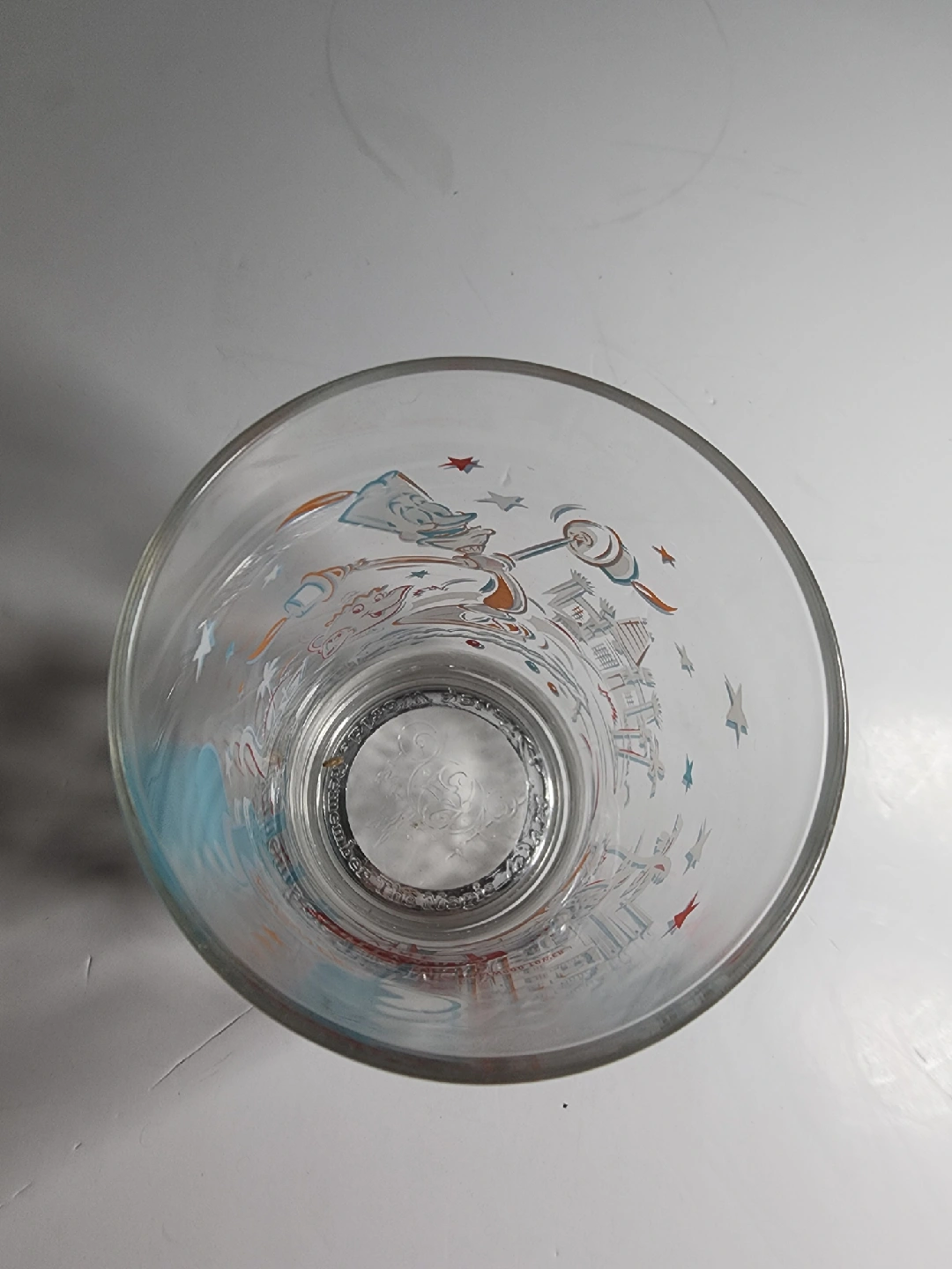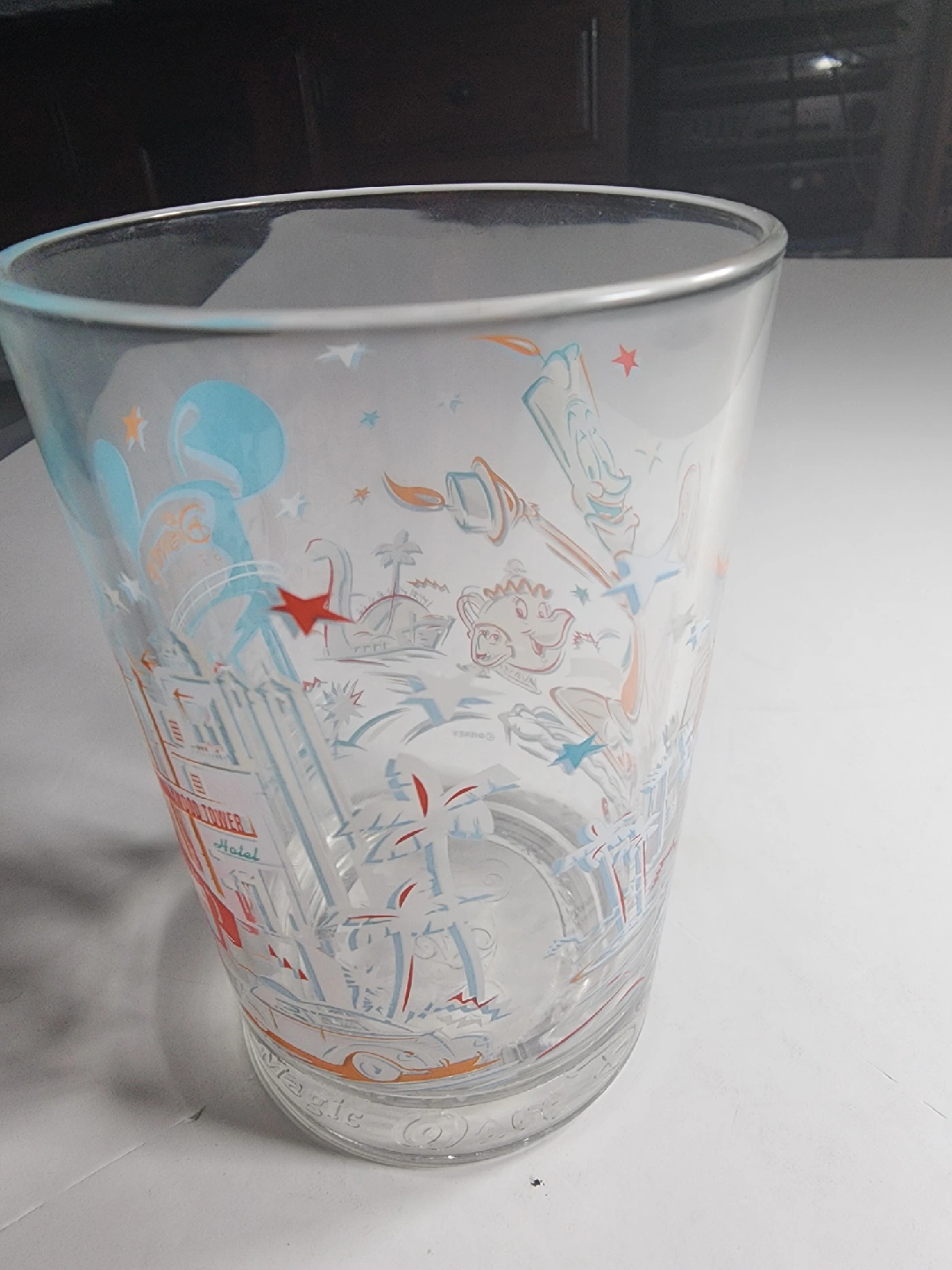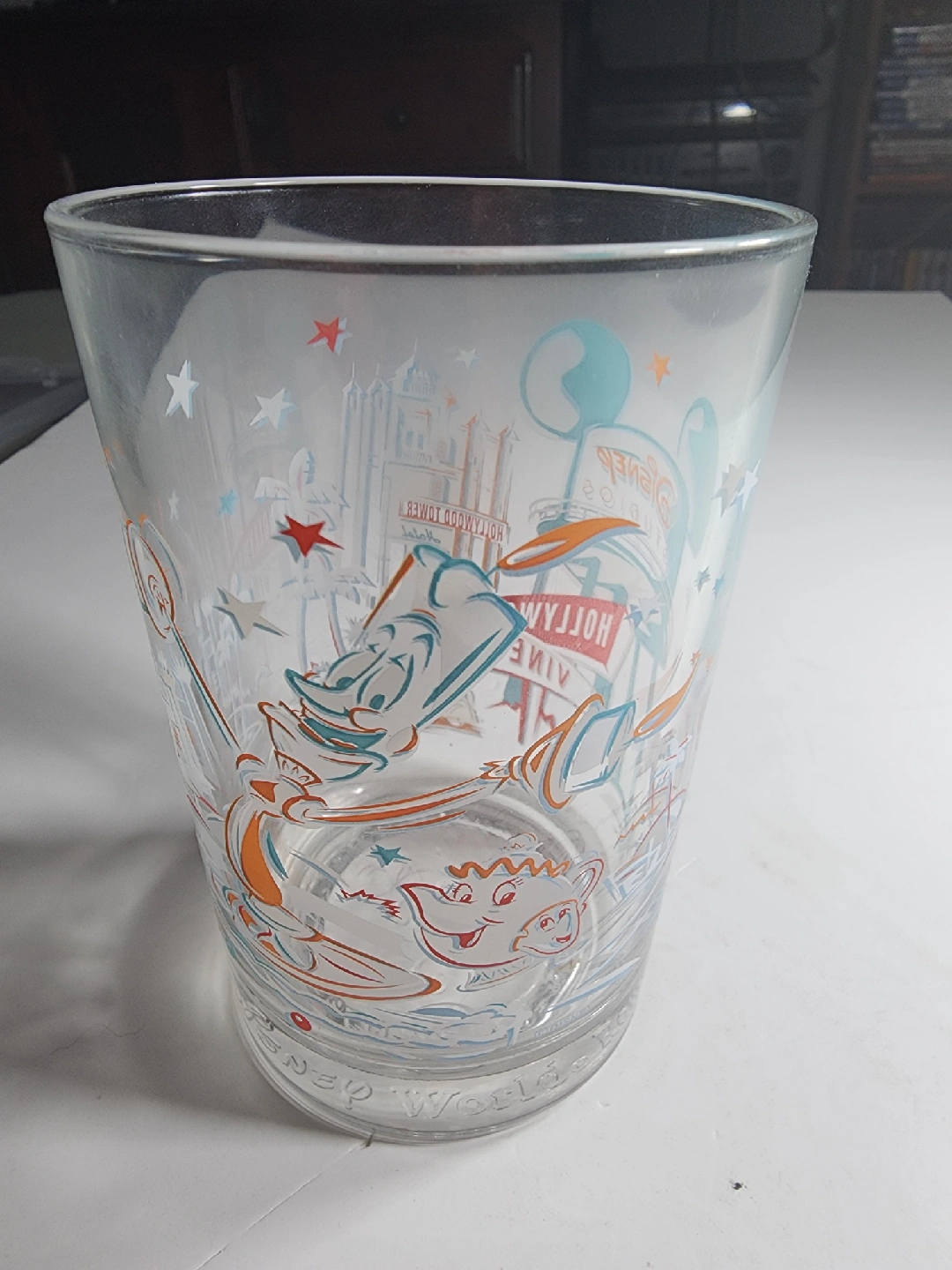 Selling a Disney Hollywood Studios glass. It features images of the Hollywood Tower Hotel, the Hollywood Vine restaurant, and other Disney characters and landmarks from the park. Perfect for any Disney collector!