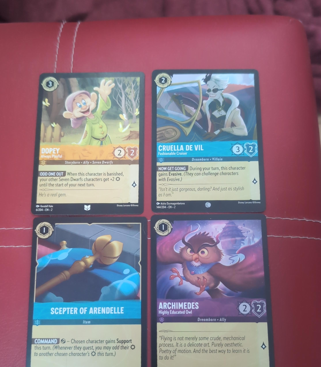 Selling a set of Disney Lorcana trading cards! Includes characters like Dopey, Cruella De Vil, Scepter of Arendelle, and Archimedes.