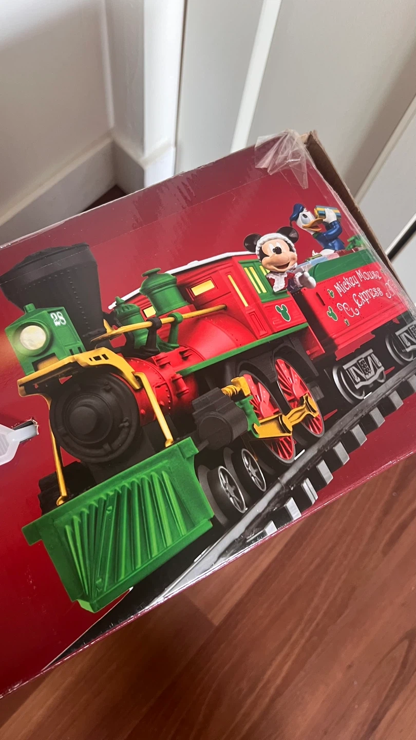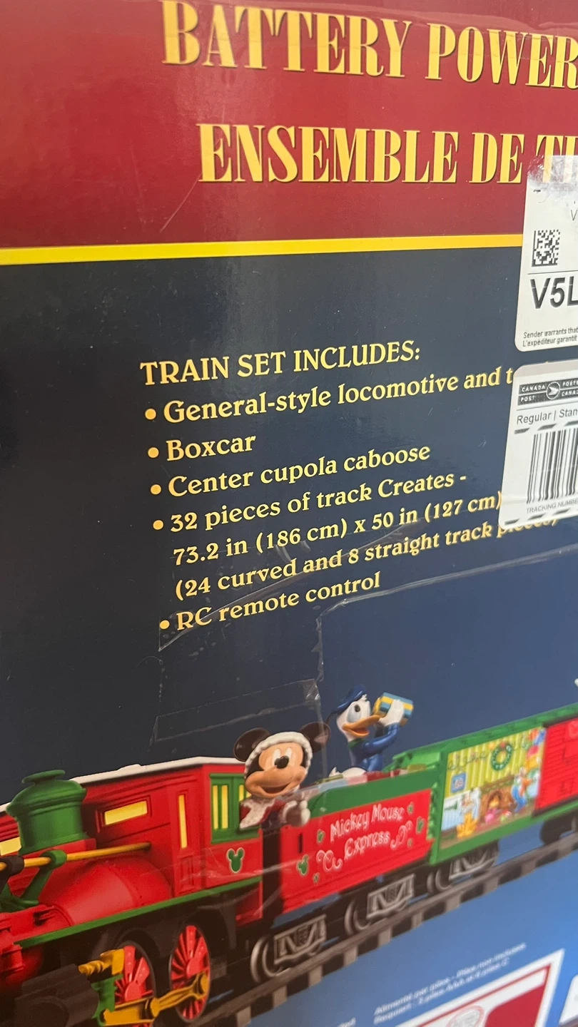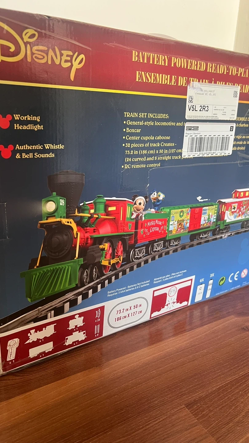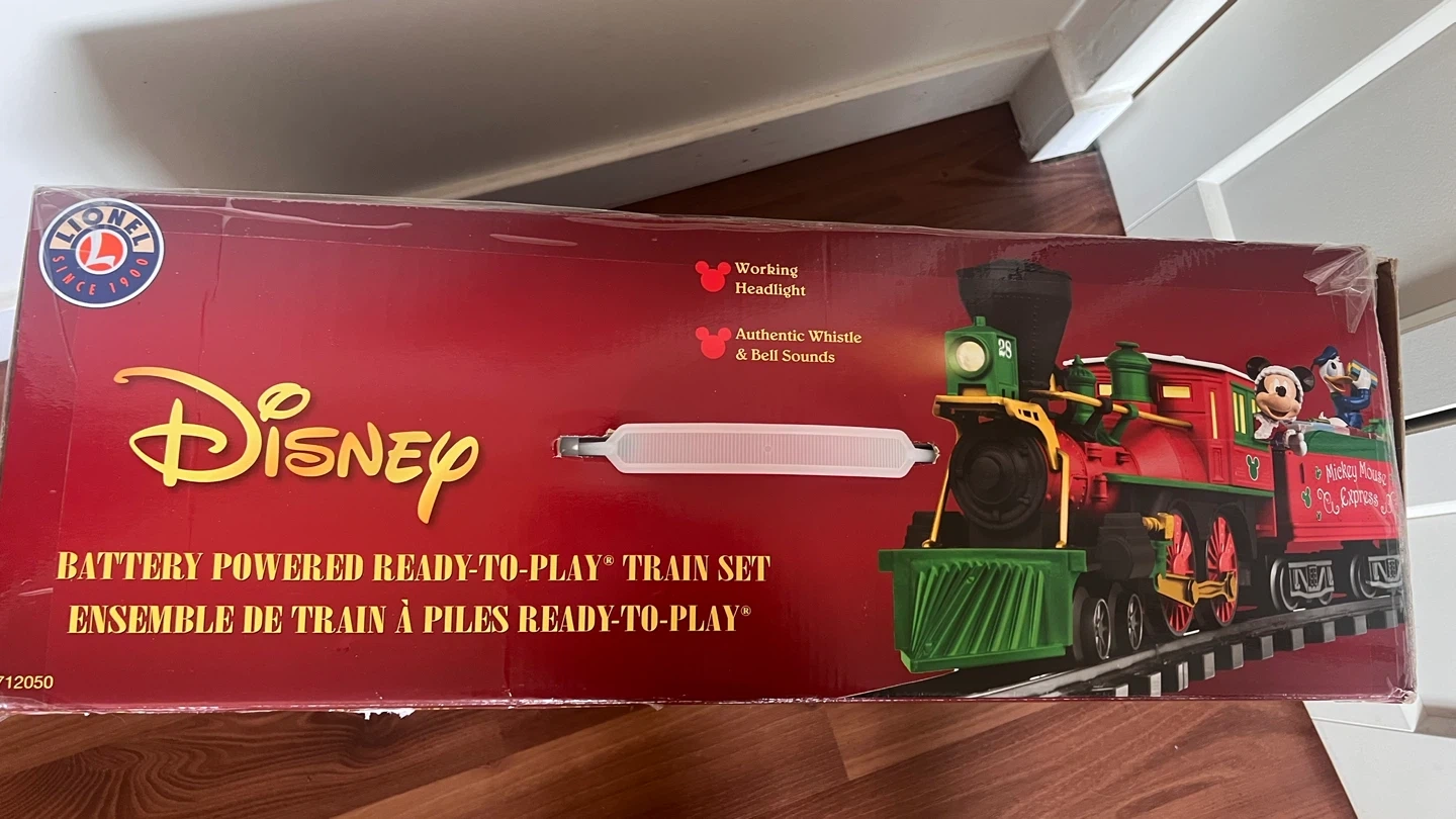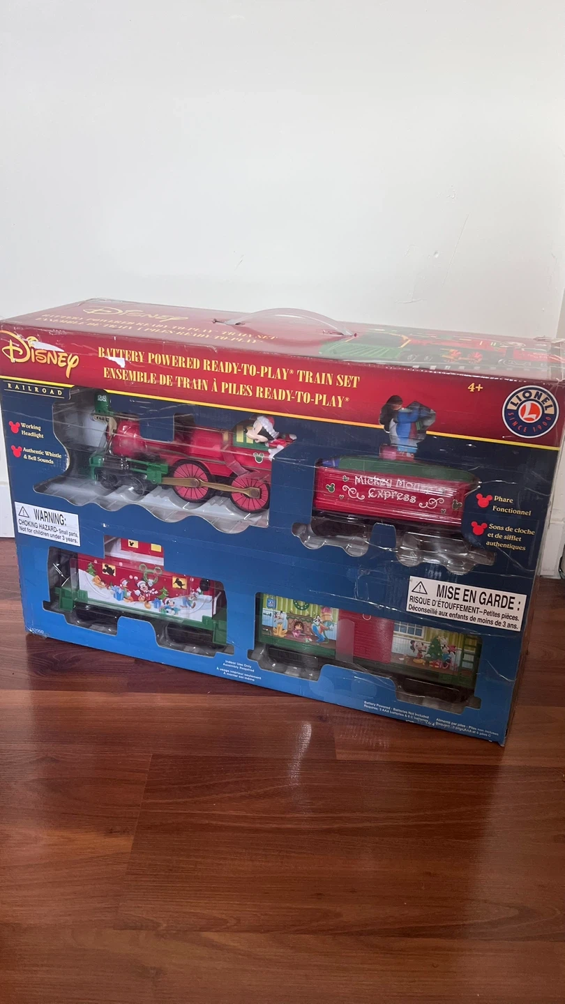 I'm selling a new, in-box Lionel Disney Mickey Mouse Express Ready-to-Play Train Set! This set includes a general-style locomotive and tender, a boxcar, and a center cupola caboose. It also comes with 32 pieces of track to create a 73.2 inch by 50 inch oval layout. The train features a working headlight and authentic whistle and bell sounds. It even has a remote control!