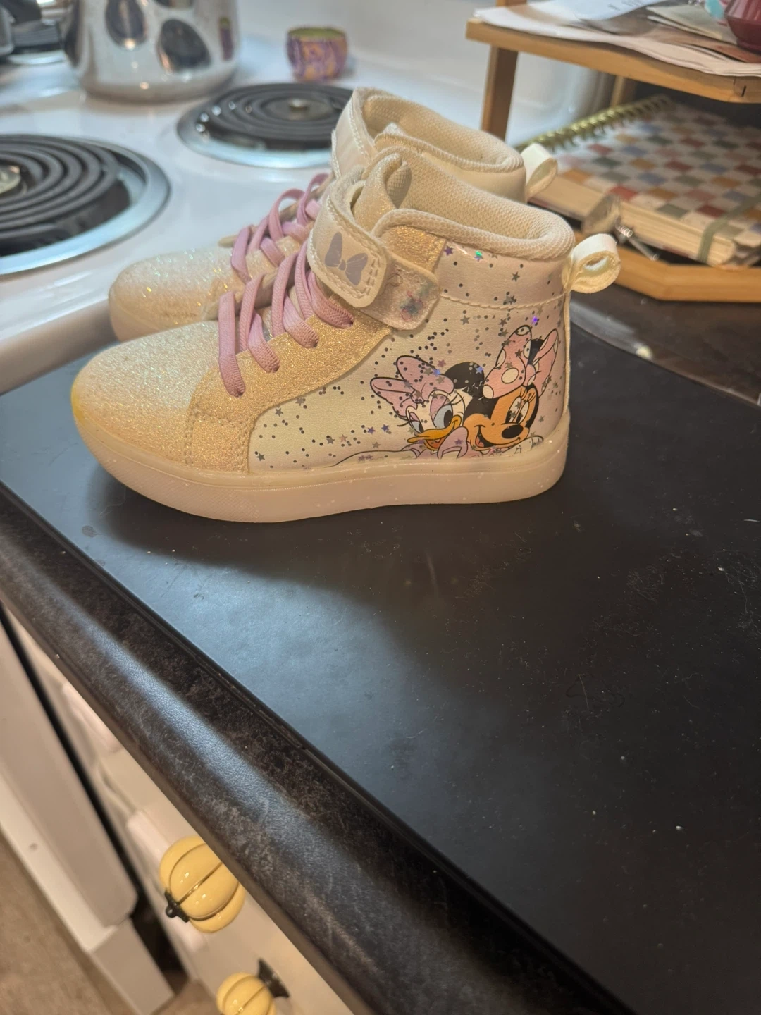 Super cute Disney Minnie Mouse high top sneakers in a size 9! They have a velcro strap and laces, and are in great condition. Perfect for your little one!
