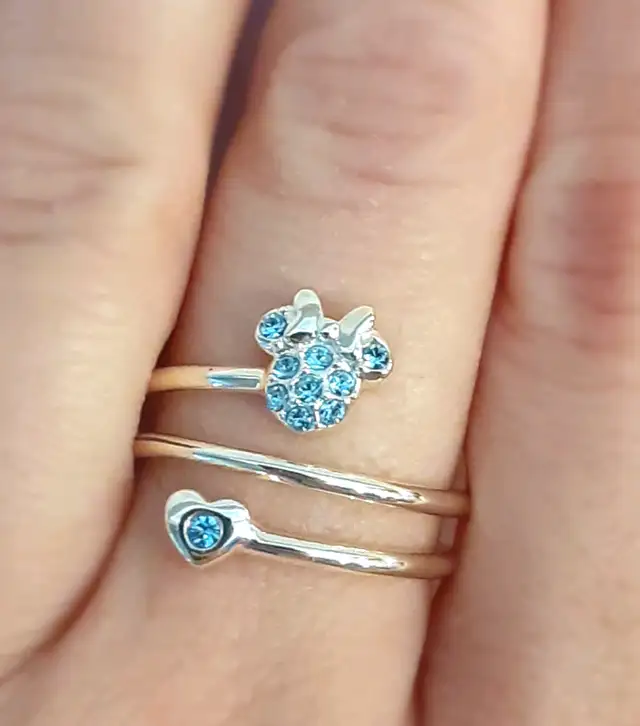 Disney Parks Exclusive Collection. Only available to purchase at a Disney Park. Purchased for me at the Walt Disney World Resort in 2017. Brand new, out of original packing and barely worn. Minnie Mouse Icon Adjustable Swirl Heart Bow Ring Color Blue Silver w/ Swarovski Crystal NEW OOB Available for pick up in Etobicoke. Thank you for reading :) I have more Disney jewelry on my page.