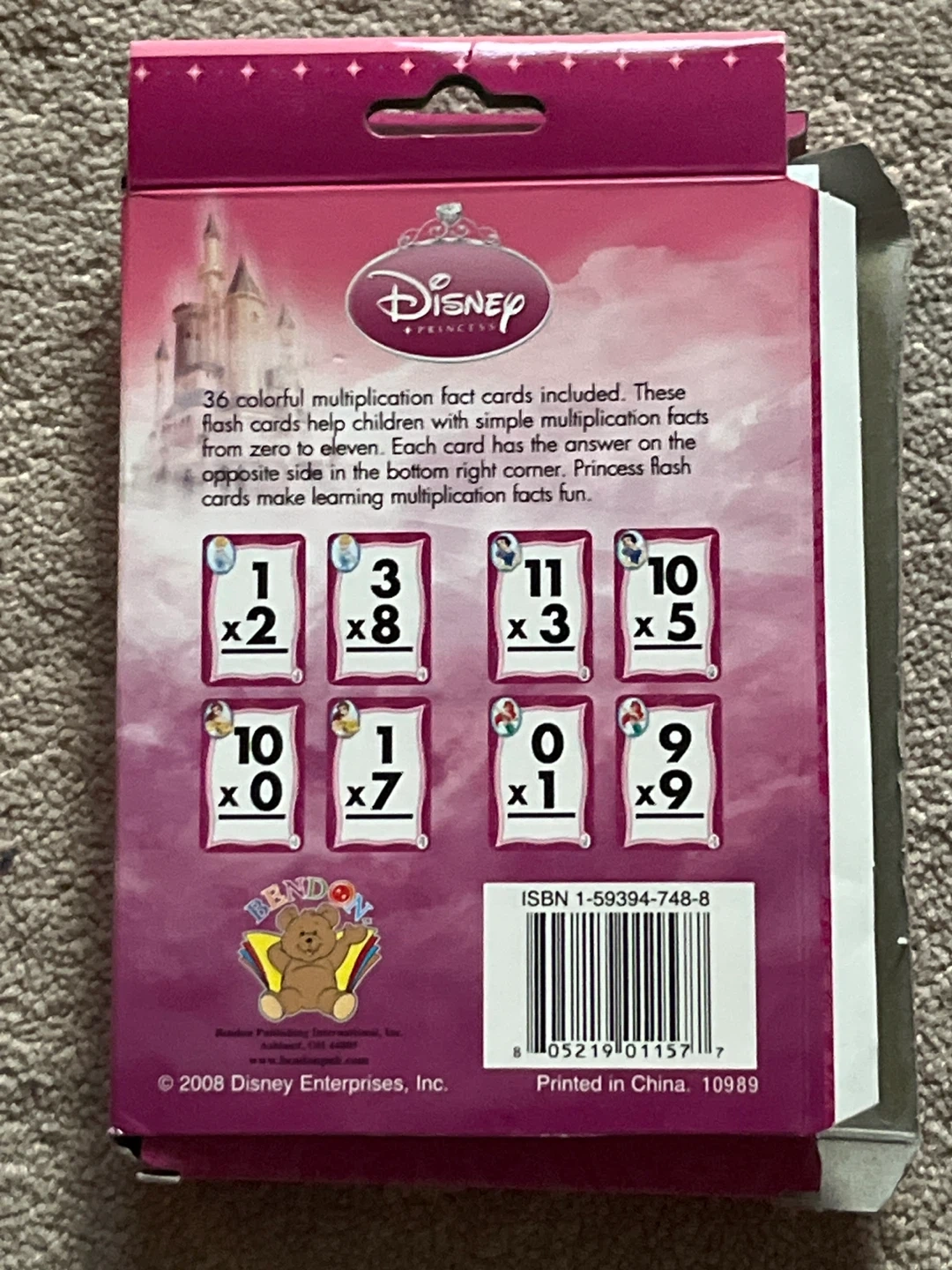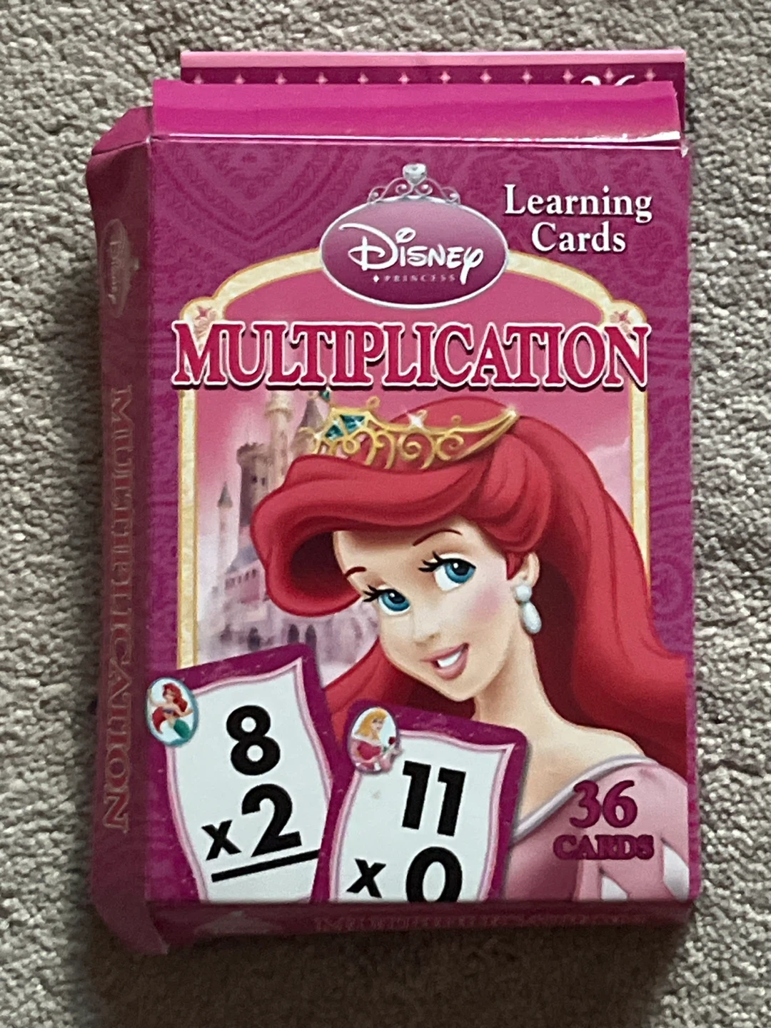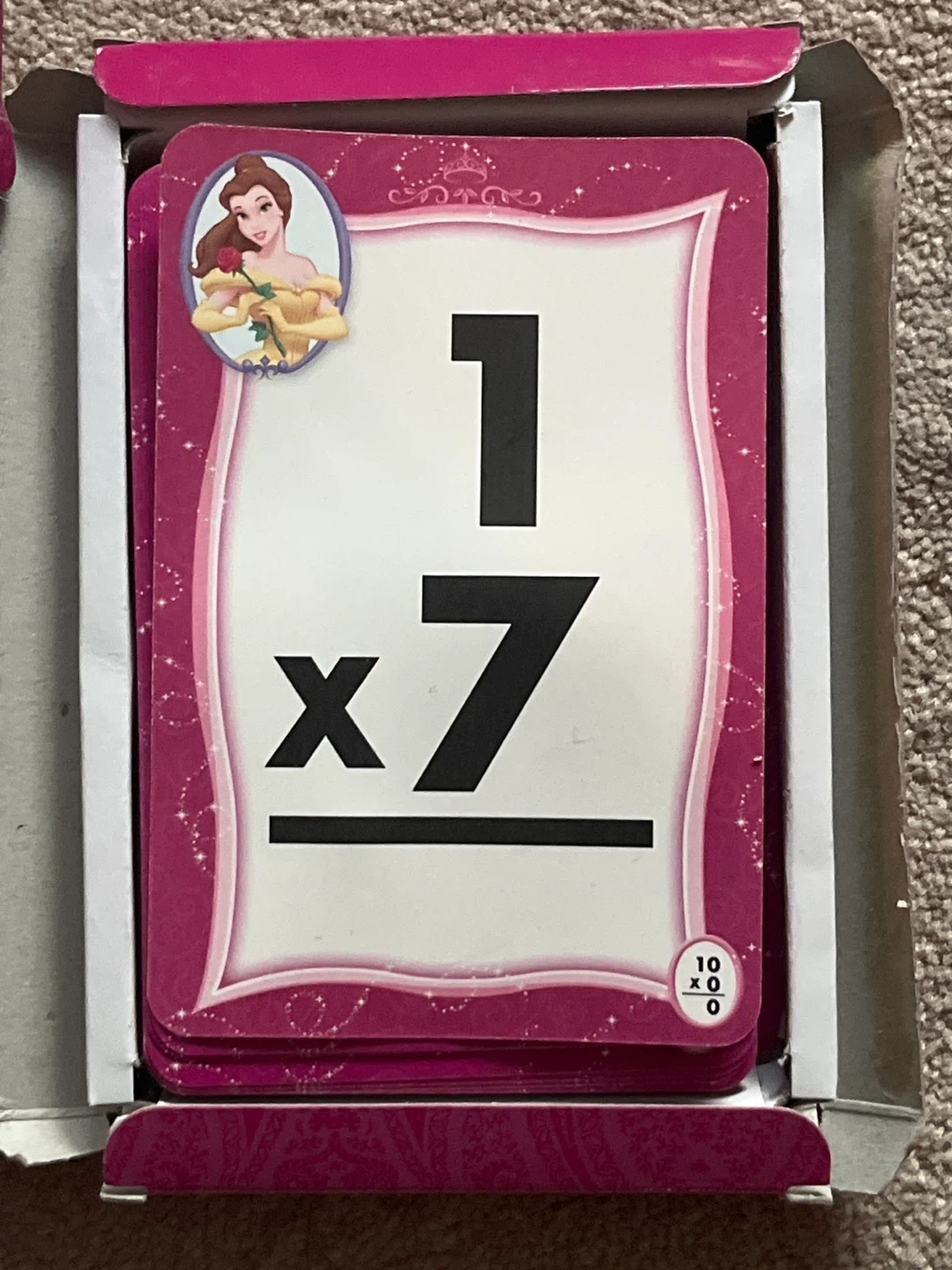 Selling a set of Disney Princess multiplication learning cards. These include 36 colourful multiplication fact cards that help children with simple multiplication facts from zero to eleven. Each card has the answer on the opposite side in the bottom right corner. Princess flash cards make learning multiplication facts fun