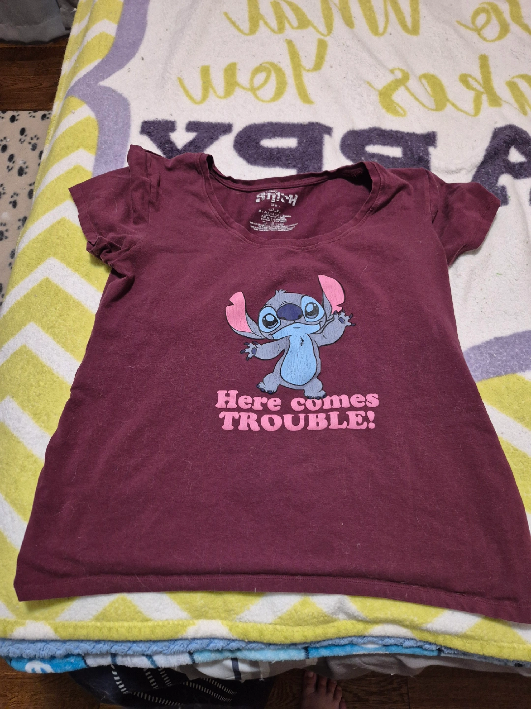 Selling a cute Disney Stitch t-shirt! It's a maroon colour and features Stitch with the words 'Here Comes Trouble!' on the front. It's a size medium.