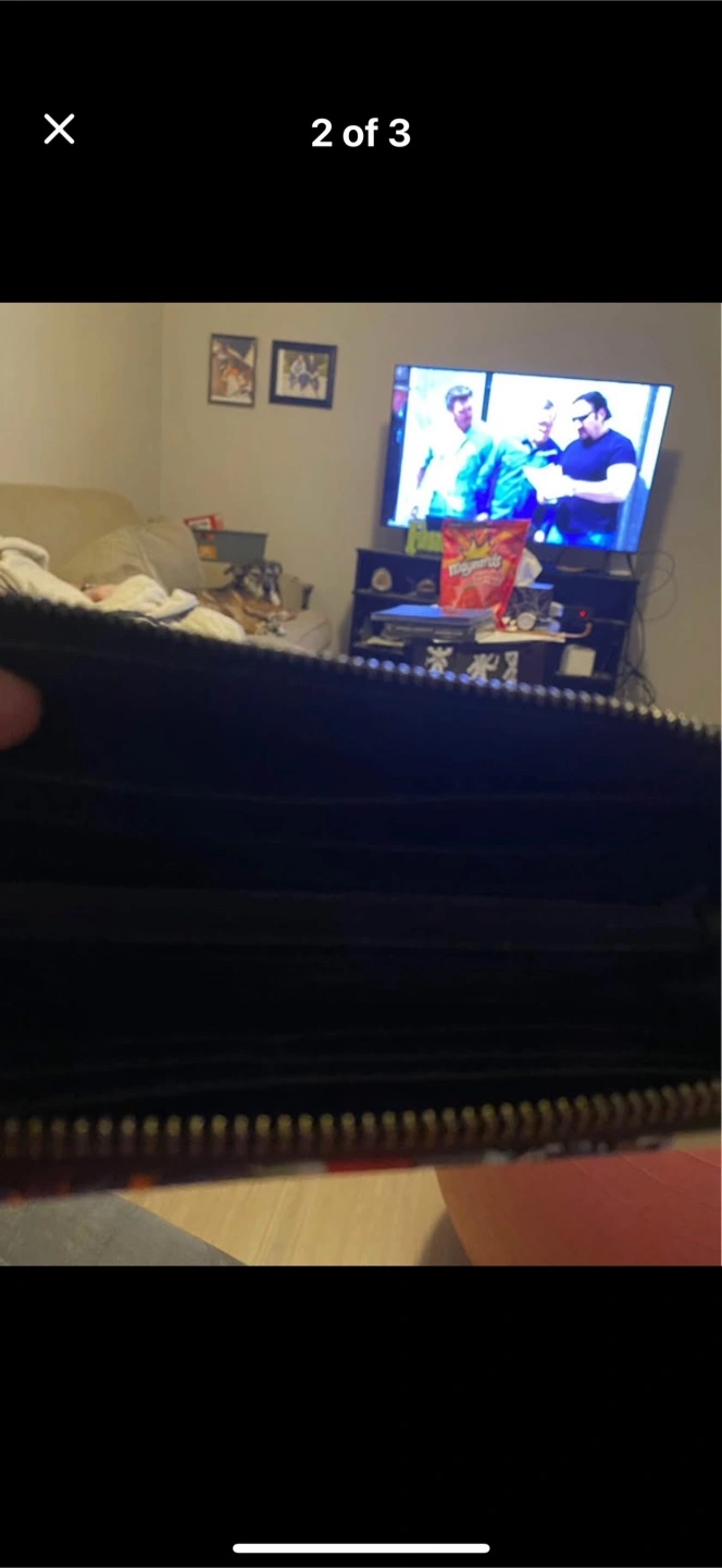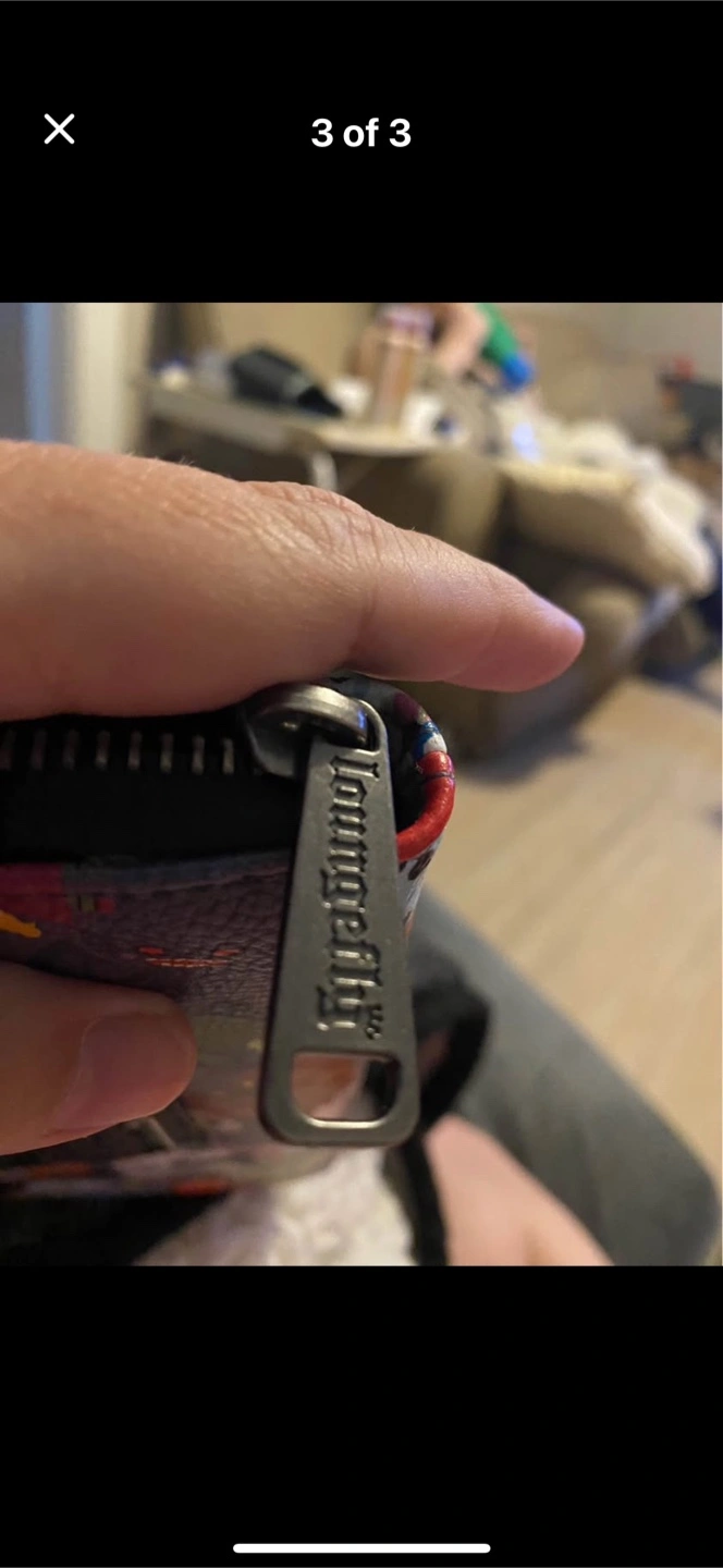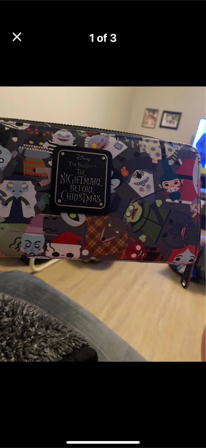 Nightmare Before Christmas themed wallet. Features various characters from the film. Zipper closure. Multiple card slots and bill compartments.