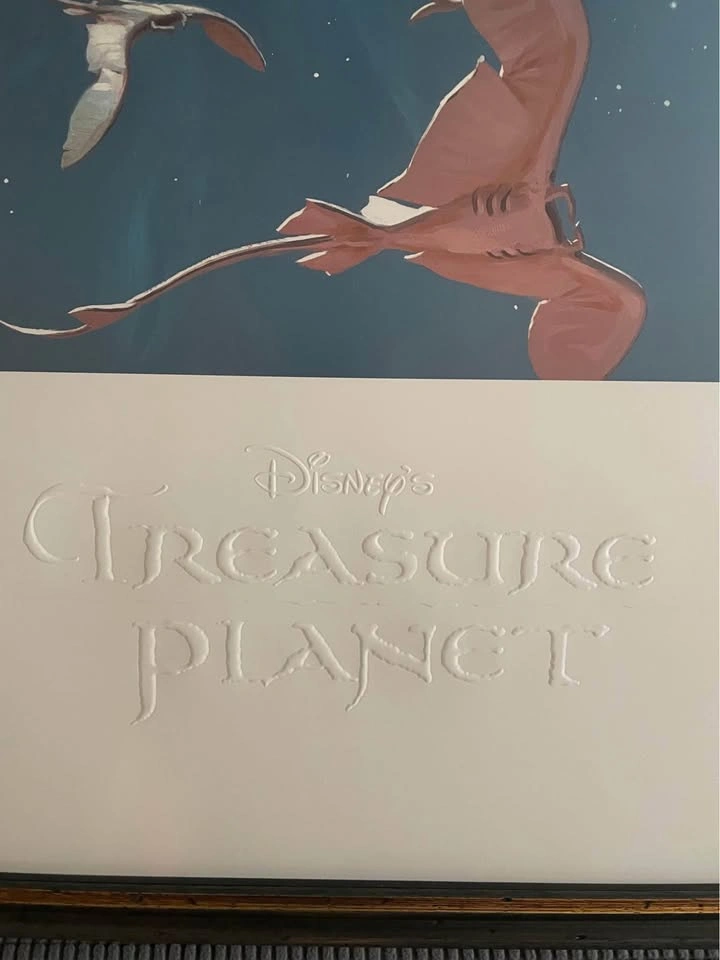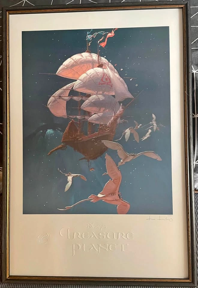 Large 24"x 36" lithograph from the 2002 Disney animated feature "Treasure Planet" with embossed lettering as shown in photo. Rare numbered 10/100 signed by the artist, Ian Gooding, as shown in photo. Beautifully framed by The Picture Hook Gallery in Okotoks. Pick up in Chestermere.