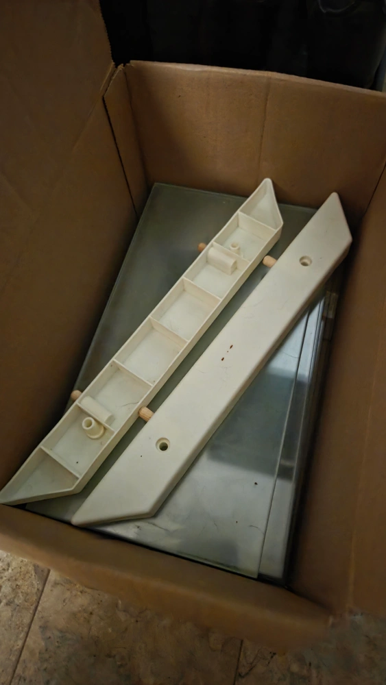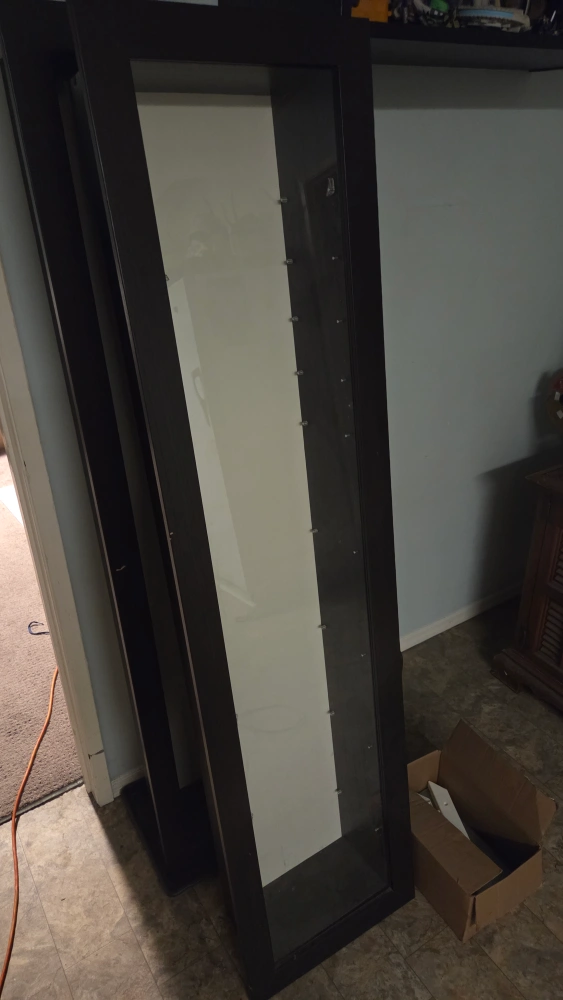 Selling two display cabinets in dark brown. They come with glass shelves and other components in the box. The glass shelves are 12 by 6.5 inches