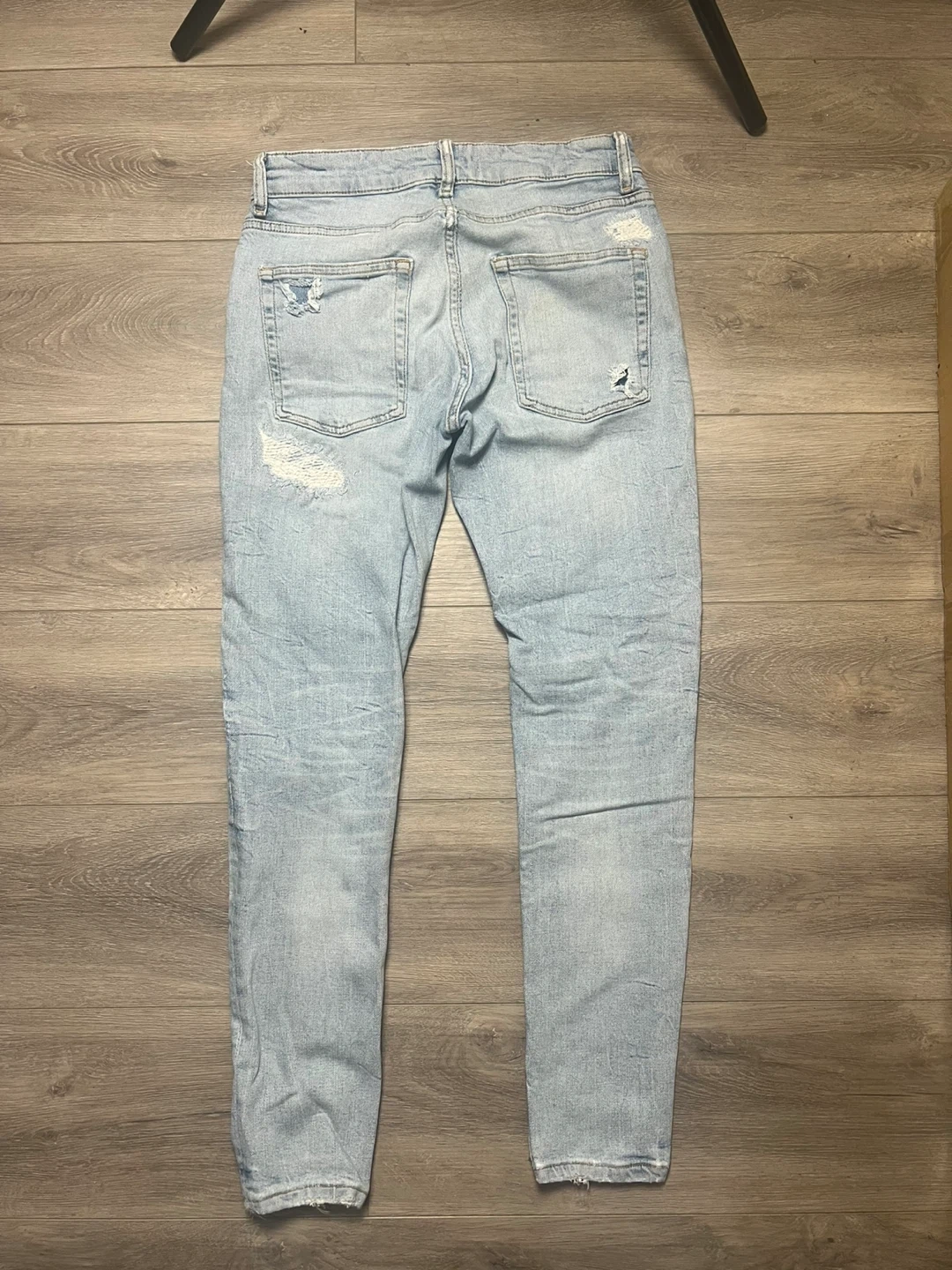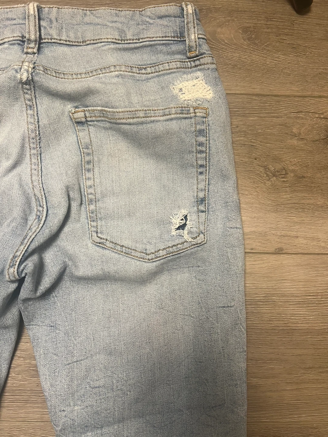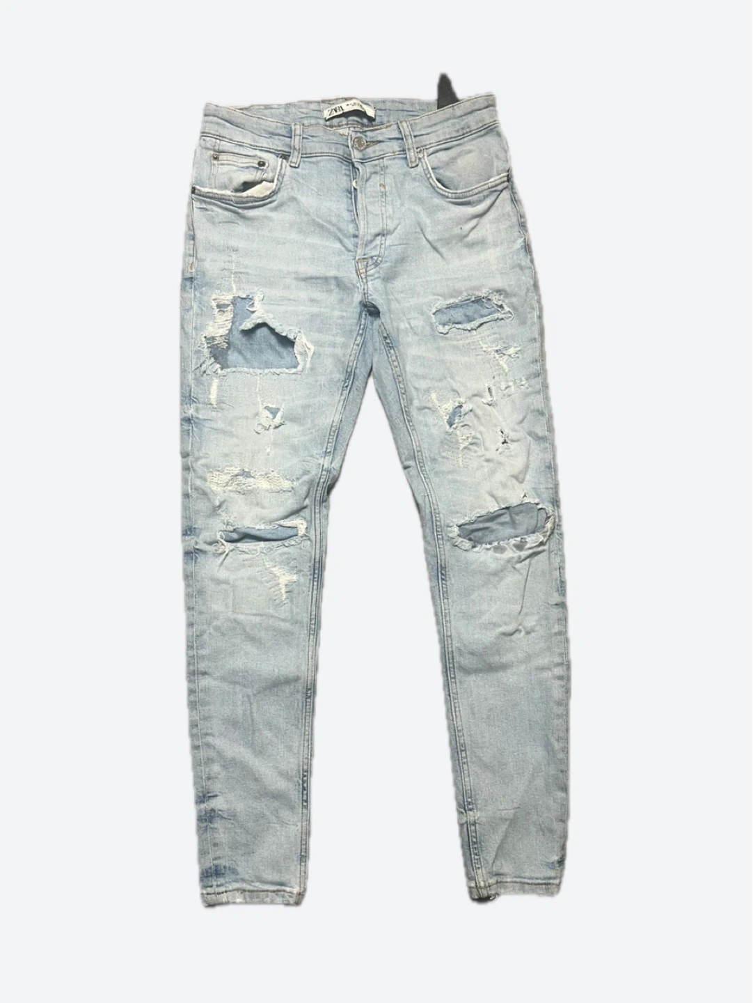 Selling a pair of light wash Zara jeans with a distressed look! These jeans feature multiple rips and tears throughout. They are perfect for a casual, edgy style and are still in good condition despite the intentional distressing