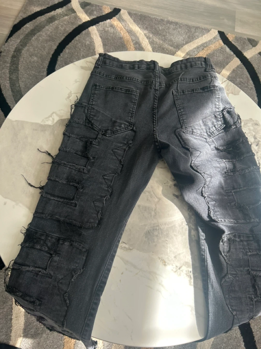 Selling a pair of distressed stacked black jeans. They are in good condition